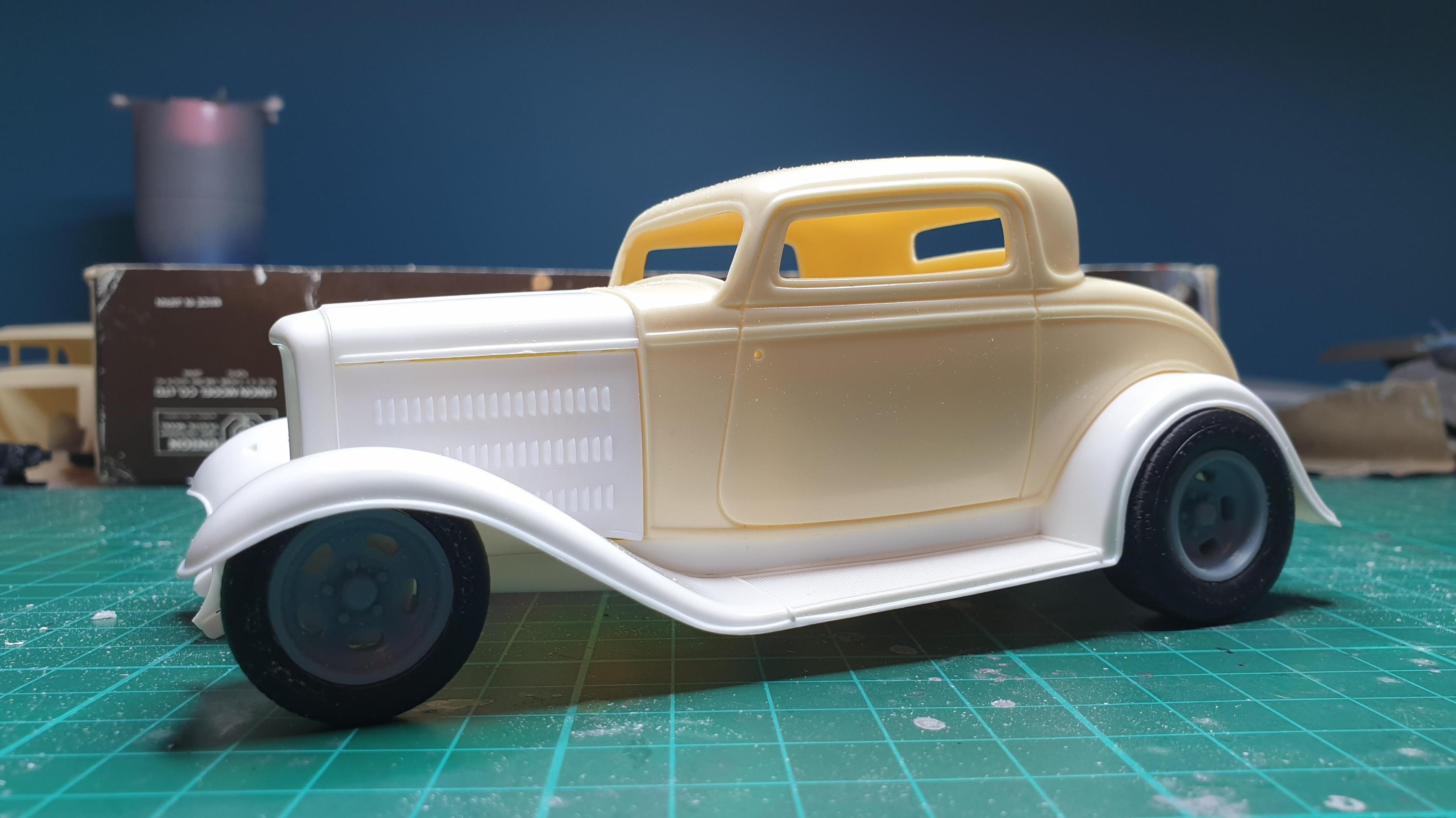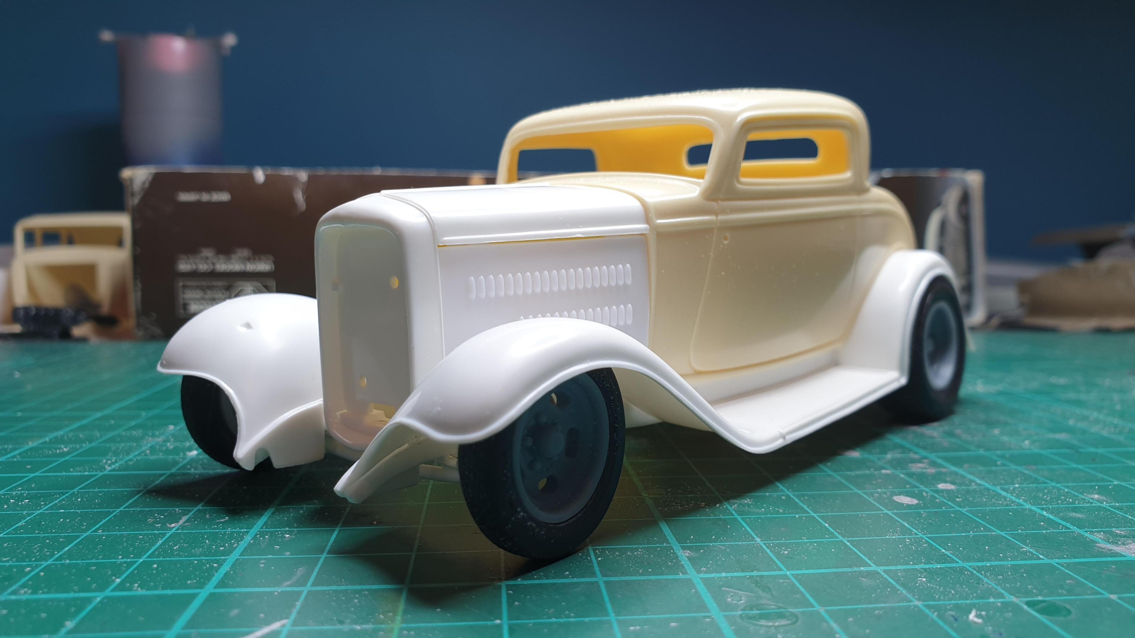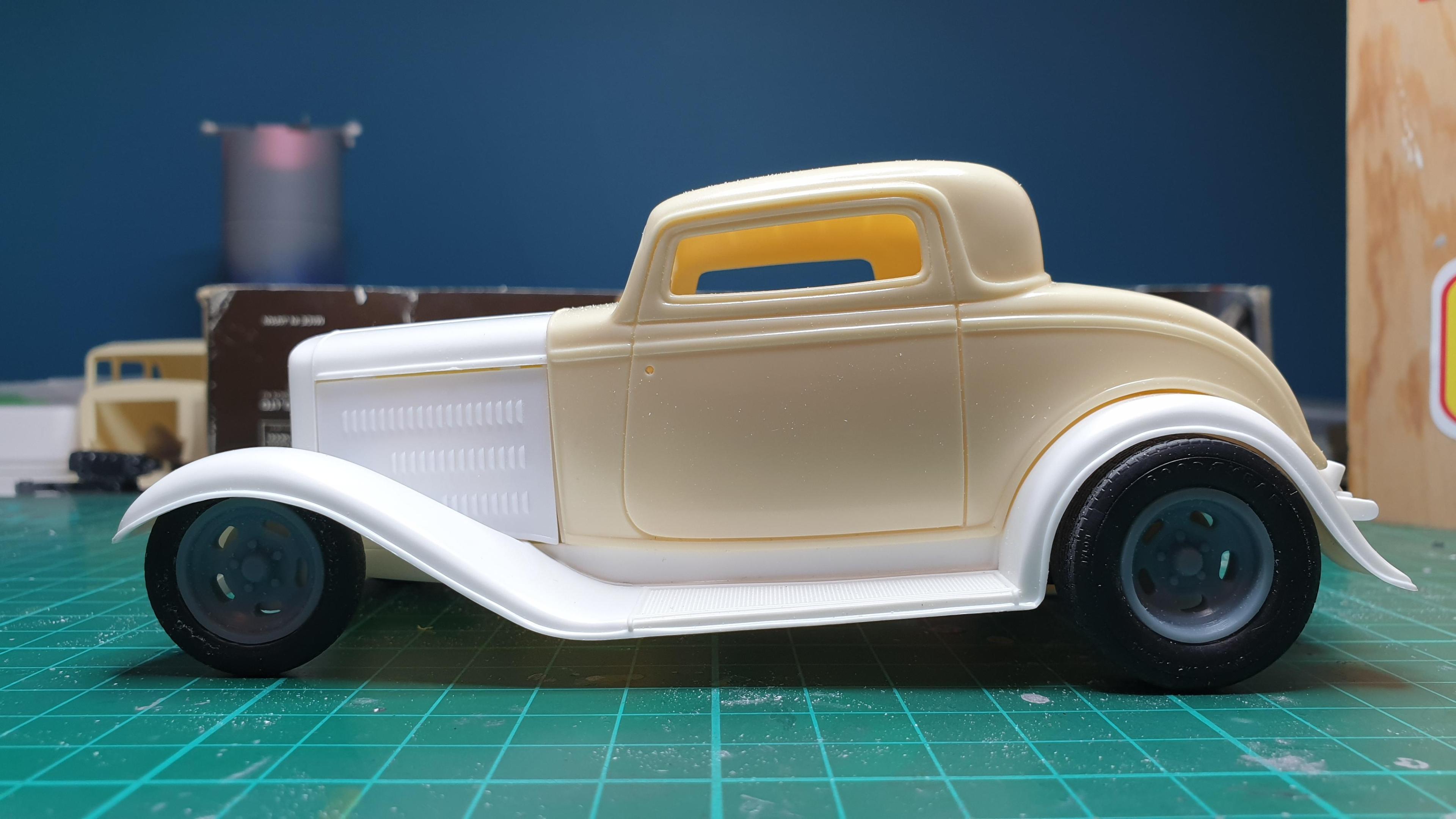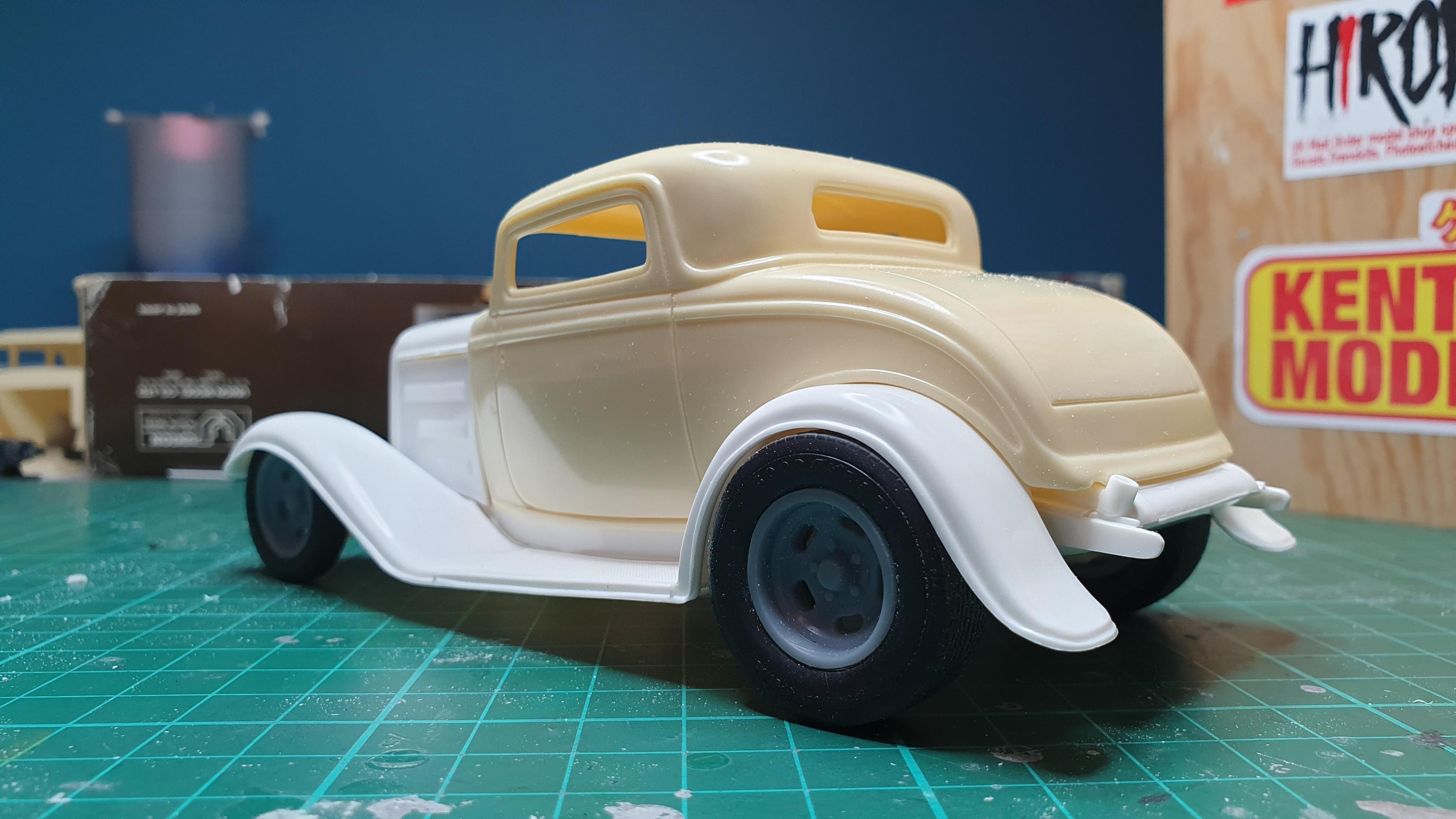 Done a bit more. Got the rear pan in and the first coat of primer. I have a few areas to sort as a few areas have ghosted through. Also got the wheels on,they are from the AMT 50 Ford convertible. Thanks for looking Lee