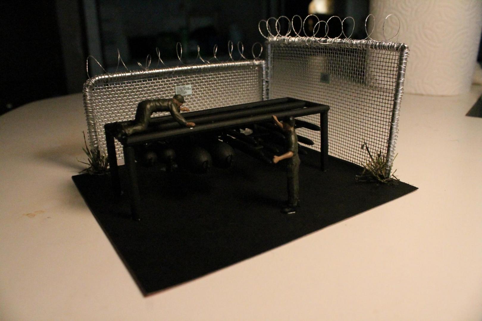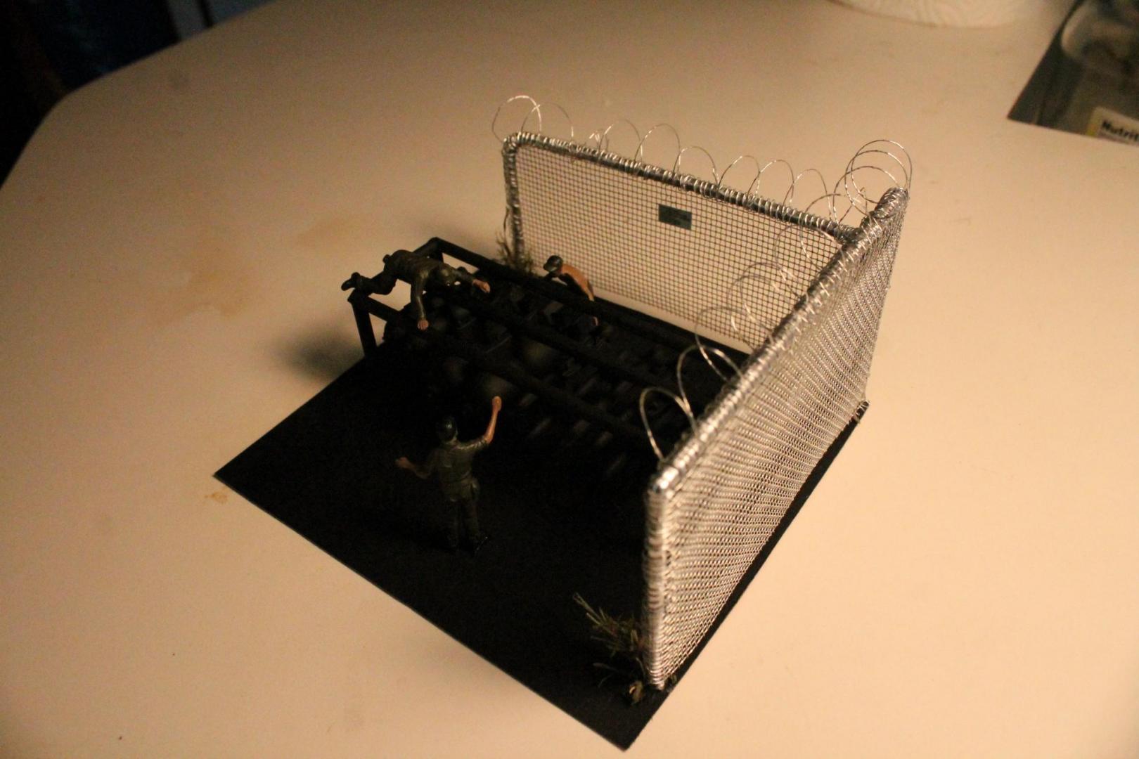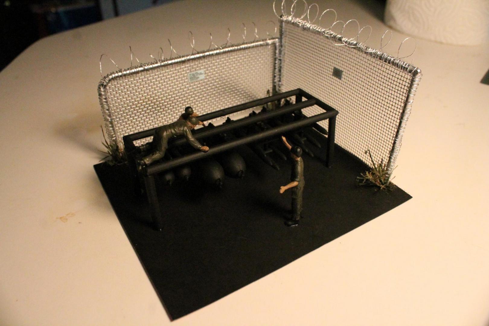 I used part sprues for the bomb rack, and the fence posting.... Used aluminum window screen for the fence, and for the concertina wire atop the fence. And I used real grass clippings from my yard for the weeds.....The whole thing is done on some scrap from a cheetos box.... lol.... enjoy!