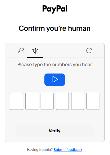 Anyone else having trouble to get into their PayPal account? I type in the six numbers it tells me to And then it fails no matter how many times I try. All I can do is Submit feedback which says that the challenge isn't working.