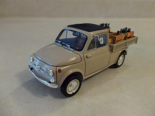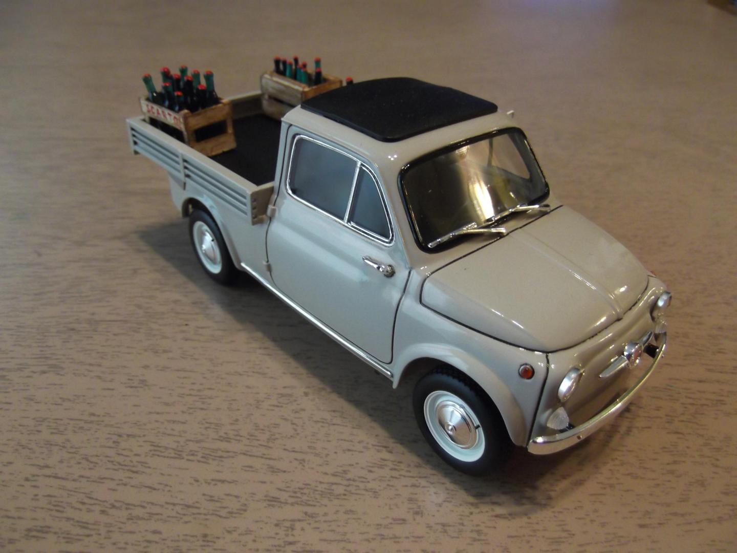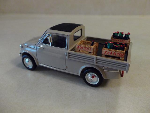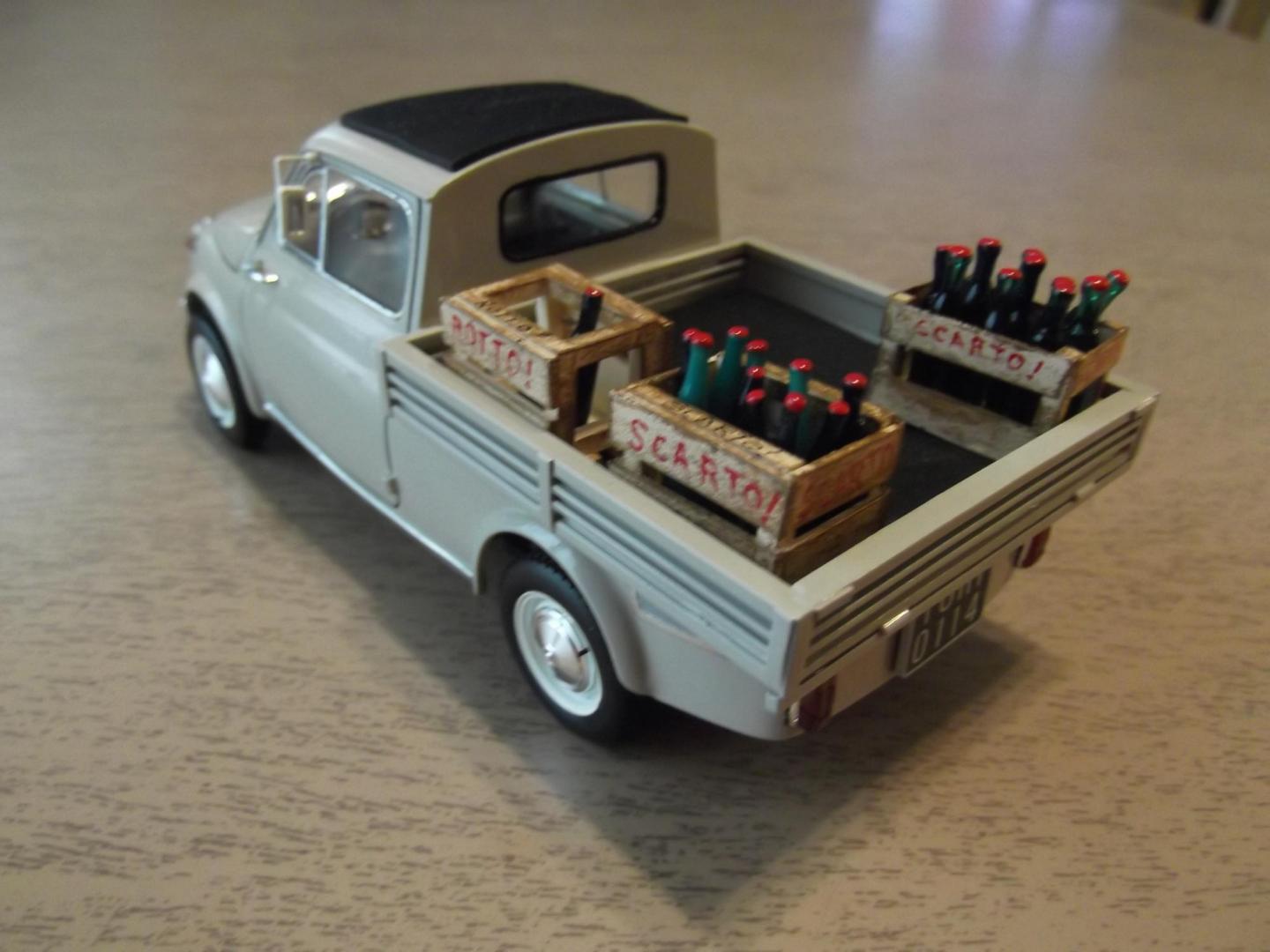 Classic Fiat 500 converted to pickup by coachbuilder. About 500 were produced in this style. Started with the Tamiya's excellent kit, cutting the body in half just behind the doors. The wheel base needed to be stretched, using sheet plastic for the body and a variety of plastic stock for the chassis. Plastic stock of various kinds was also used for the pickup bed. The crates were plastic stock as well. The reject wine bottles were made by spinning a master on a lathe, clear coating it to a shine, then molding/casing a bunch. A new gang mold was made, then clear resin tinted green was poured. The crates say "Garbage" and "reject" in Italian.