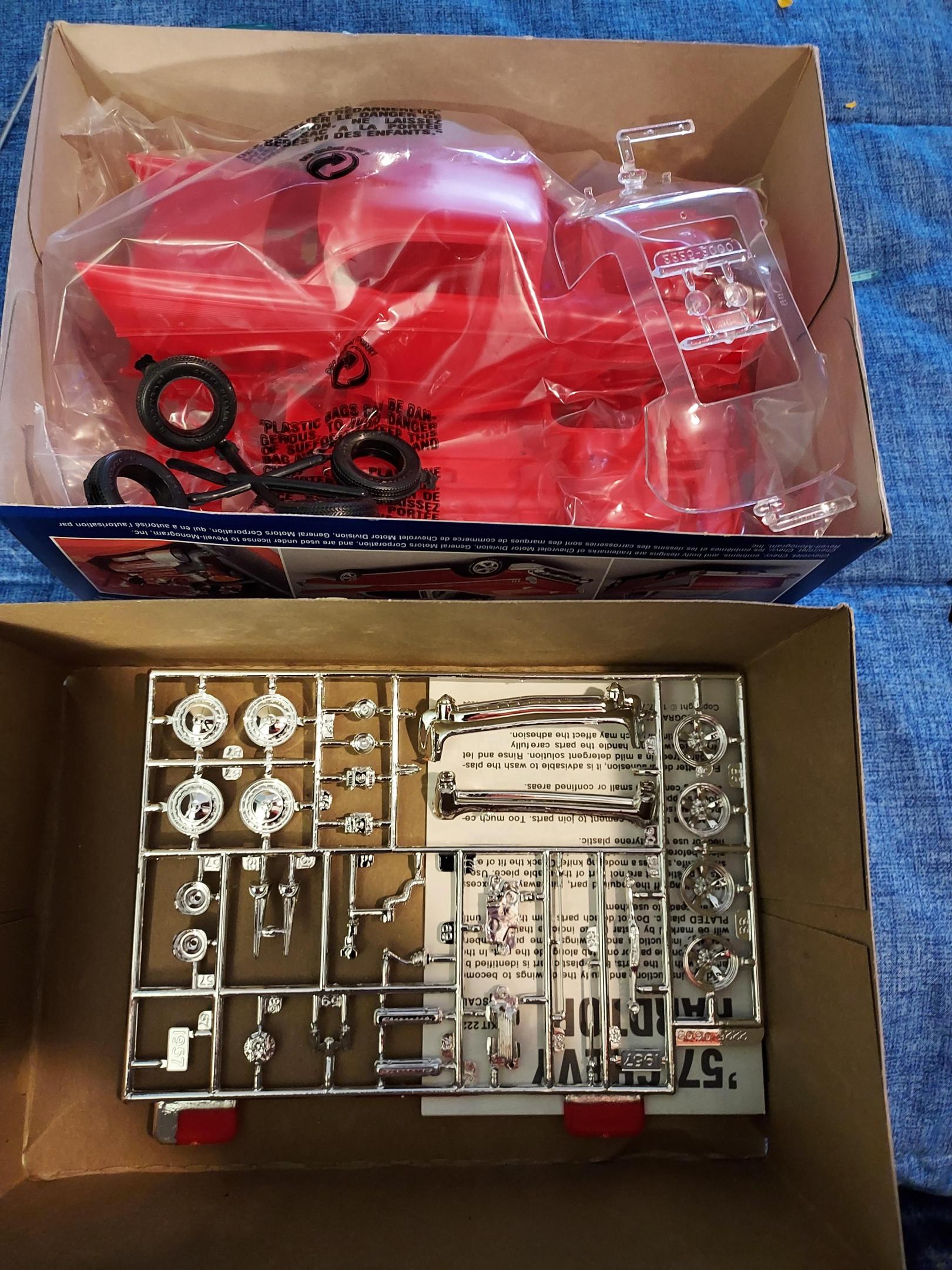 12. While I'm in limbo I decided to get this build under way. The Story. Way back in the mid 80's, I got that red 1:24th Monogram 57 Chevy for Christmas. I used my allowance to buy a brush paint set and a can of Testors Sapphire Blue metallic spray paint. I was about to build my first model kit ever. I started the build in the dead of winter with most of the paint work being in my bedroom using the paint set. I believe the set included Gloss white, Red, Blue, Yellow, Orange, Silver and Black. Disaster struck when I took the body out to the tool shed and tried to paint the blue over the red in the freezing cold. Needless to say it didn't work out very well. I vividly remember asking my stepdad how to get the paint off and his answer... GAS. ???? Unfortunately it attacked the plastic and left me sanding the rag marks smooth. At that point it was time to attempt paint job number two. Only this time I read the label on the can where it said to apply over silver base. By the time I got around to buying silver spray paint the weather was warmer... and I painted the model with a better result. (probably still hideous) ? looking at it, I thought there was too much Blue and decided it needed a white roof. I also painted the fin white too. The decals were added just because they were in the box. I'll continue with the story as the build progress continues... To be continued...