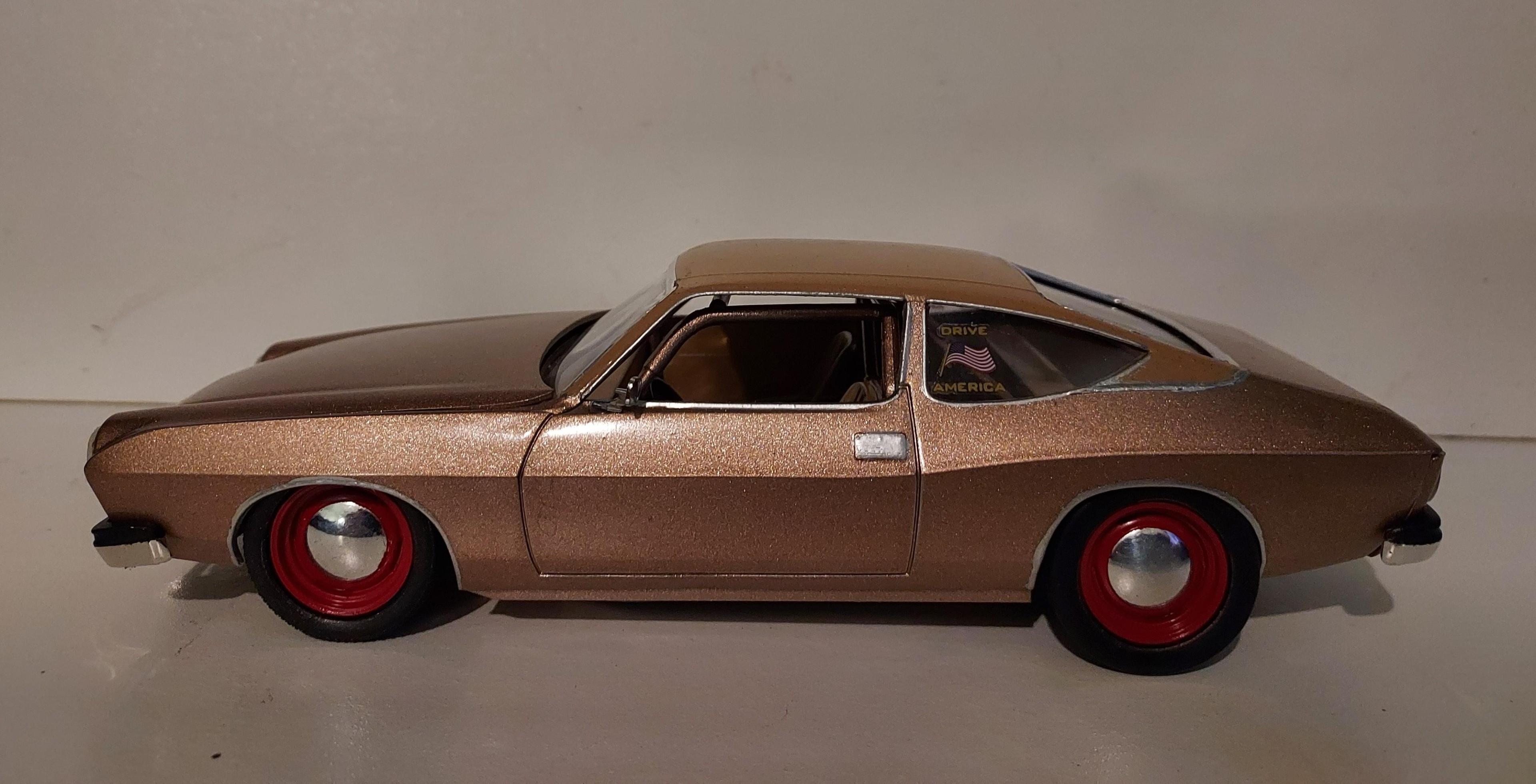 Inspired by this year's Cannonball Run theme, I built "Aunt Linda's" Matador as a disguised Race car. It's mostly built box stock with the exception of wheels & tires, seats, and LS parts from a CR Corvette. It's painted Rose Gold metallic with a saddle vinyl top. I added chrome trim to give it an original appearance. Running lights and license plates complete the "Ruse' factor. Is it just me, or do others, after they finish a kit, want to build another copy of the same kit? ??? thanks for looking!