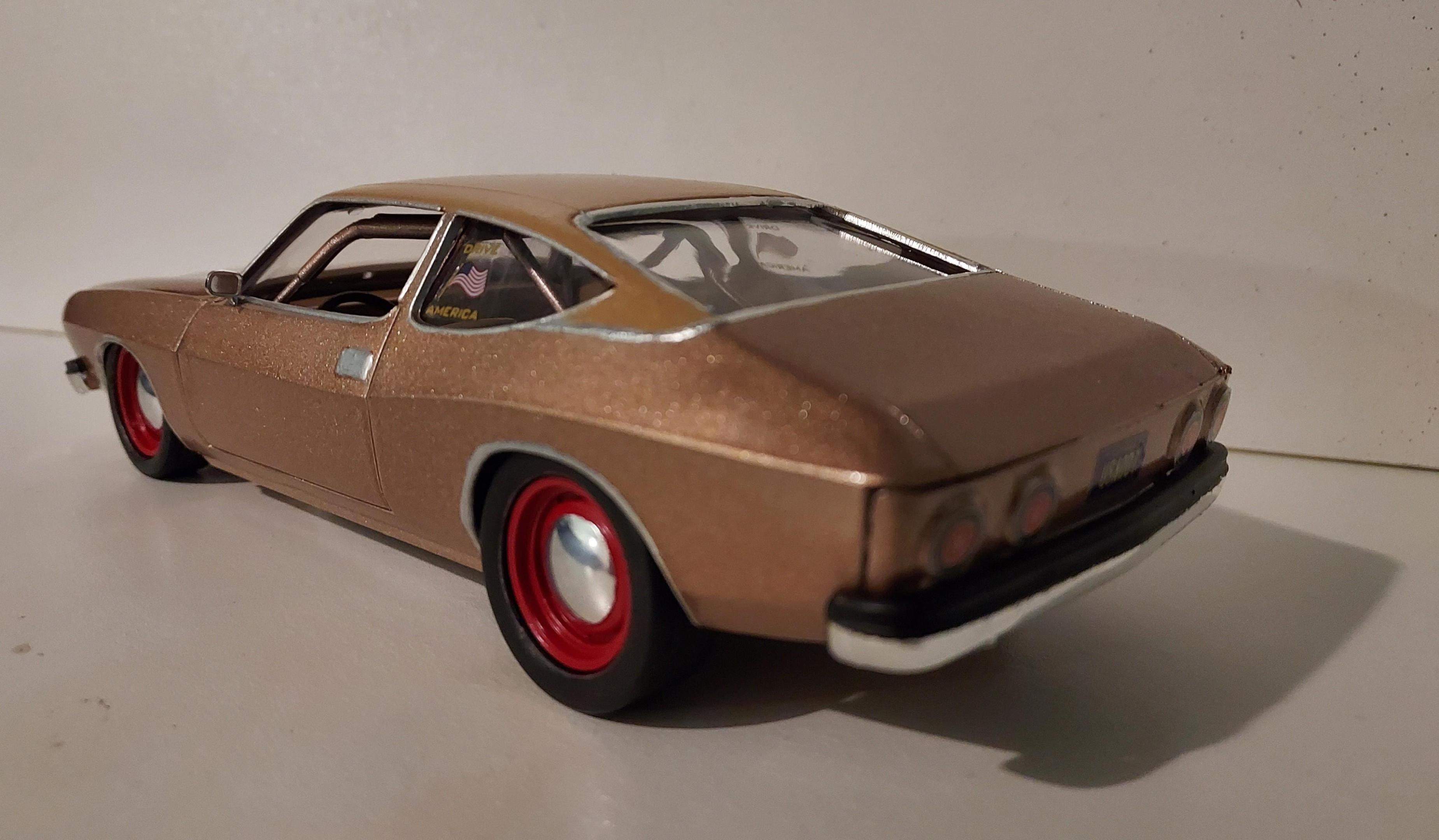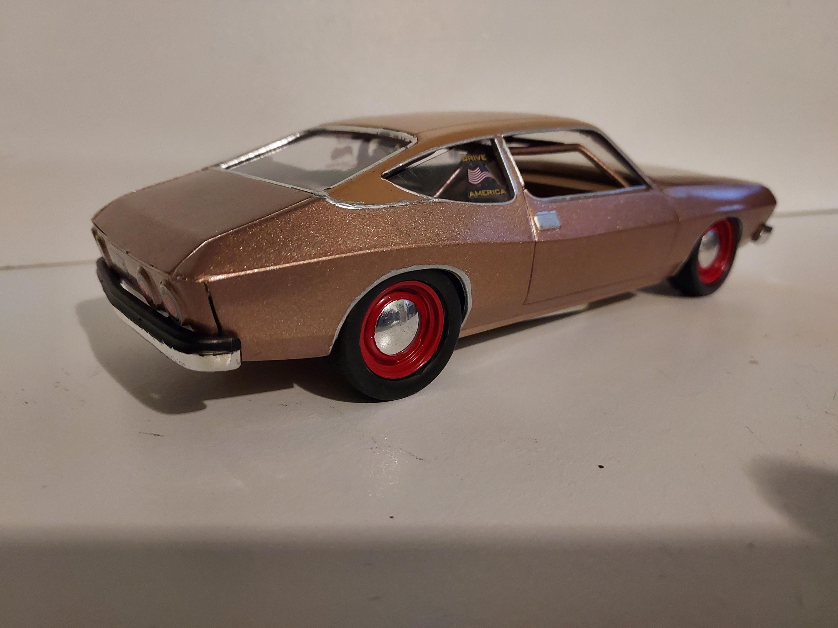 The Matador is done, but what a Janky kit! I felt bad for the poor little guy... ? I'm sure if I would have taken the time to think about it more, I probably could've made some improvements on it, but I just rushed through to get it finished. It's all for fun and just my way to help motivate everyone here towards the end of the run!? I basically built it from the box save for the wheels and tires and LS parts on the engine, and the seats. I painted it Rose Gold Metallic with a saddle tan vinyl top... and added as much chrome as I could to make it look stock. Aunt Linda's little AMC is ready for the Cannonball! -