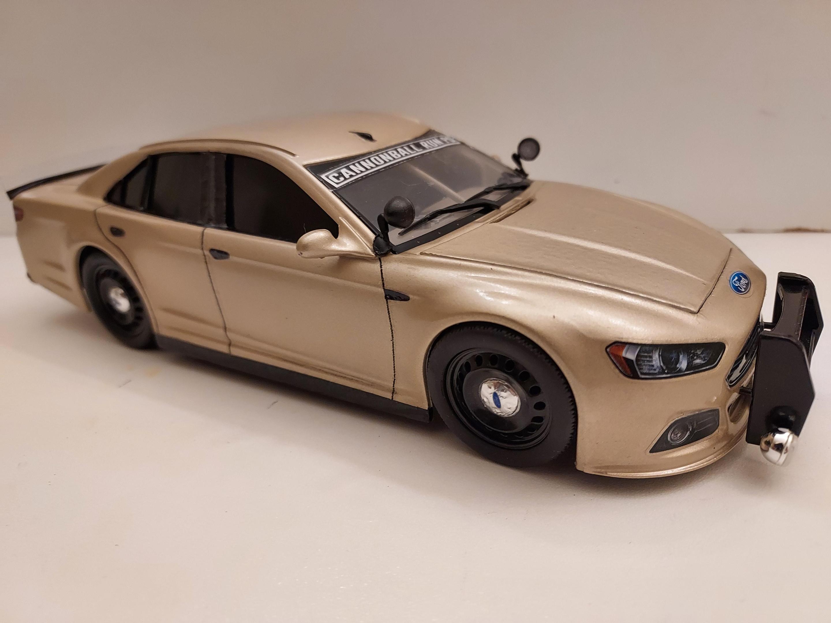 #27. disconovaman - Ford Fusion Nascar disguised as a Police car. Here is my entry for the 21 Cannonball RUSE. I used the Revell Snap together Nascar Ford Fusion of Brad Kowalski. I disguised the Nascar to resemble an unmarked Police Cruiser. (Who would suspect a speeding police car?) I started by moving the B-piller to the middle of the window openings, extending the back door glass, next I closed the C-piller portion of the top in, and finally I added door seam and door handle decals to complete the 4 door sedan appearance. The snap kit only had half an engine, So I seized the opportunity to go with a 392 HEMI with twin turbos. I figure that should be good for some where close to 2000 H.P. Details include Side mirrors, windsheild wipers, clear rear deck mounted spoiler, Spot lights, pushbar, limo tint, Government issued license plates, and 22 inch steel wheels with police center caps. I enjoyed brainstorming and incorporating the ideas into the challenge of this build. Thanks so much to everyone for inspiring me. I tried to capture the true meaning of the Ruse. I hope my efforts show it here with the finished result. -