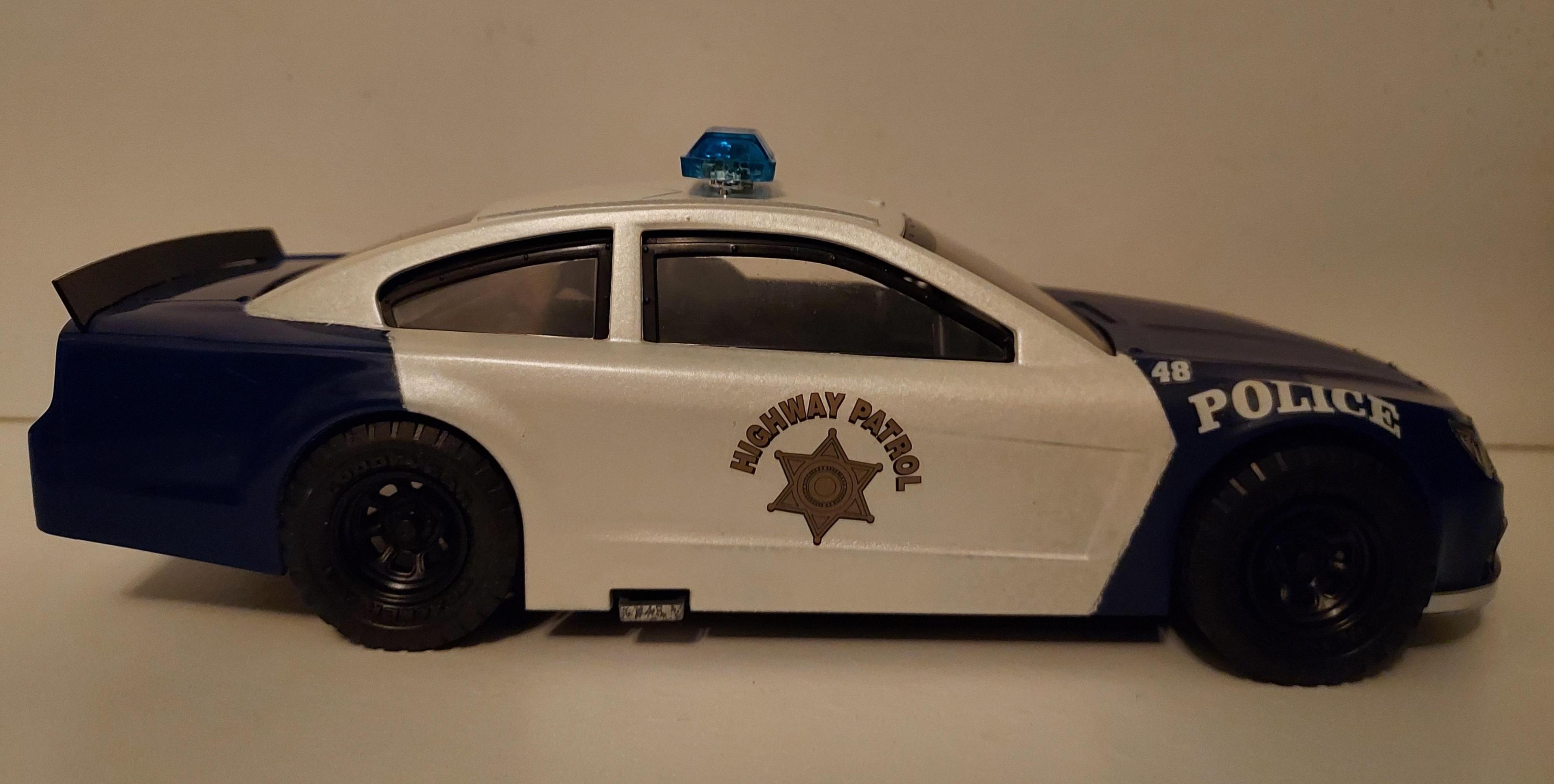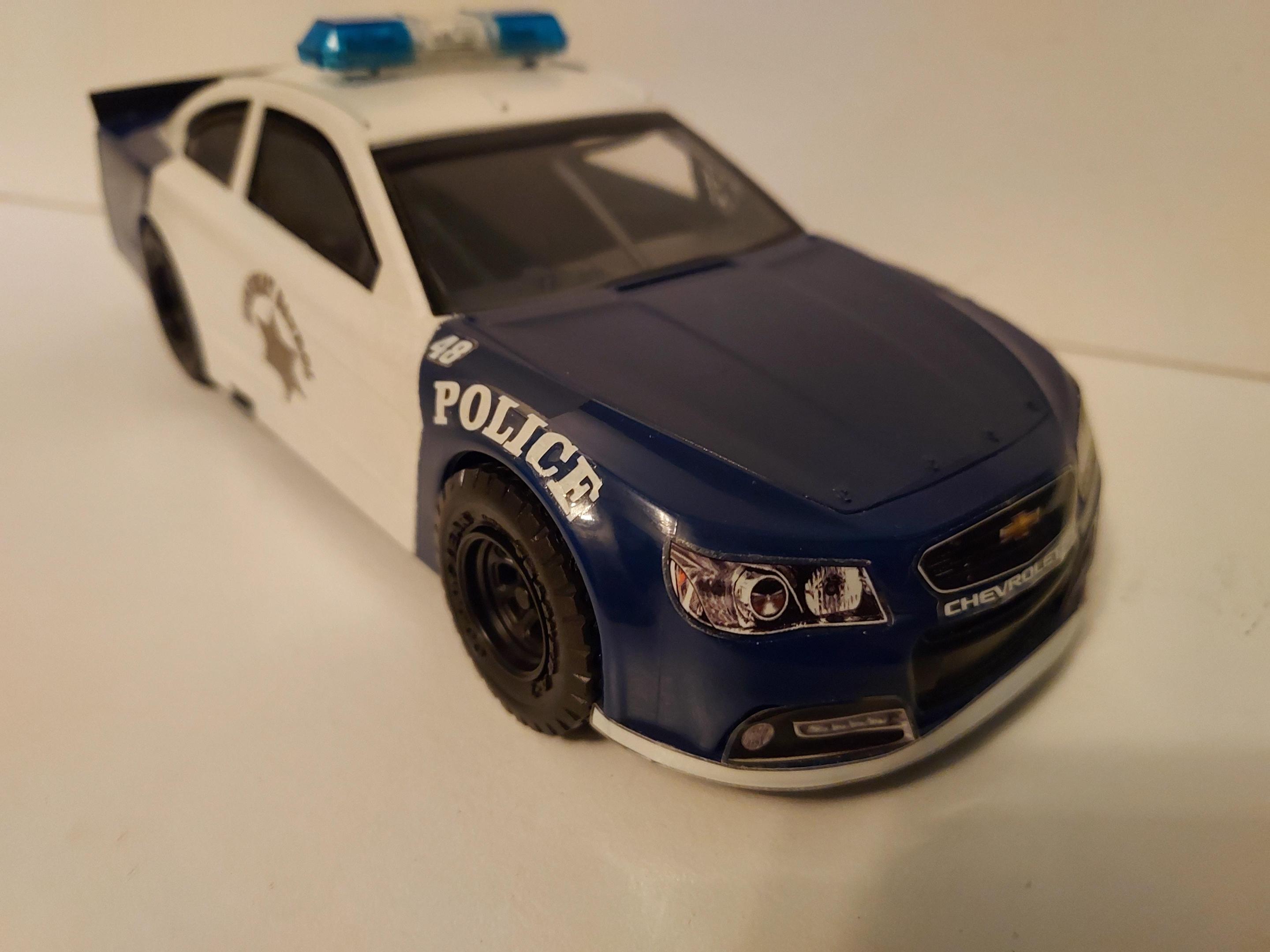 I turned a Revell Snap Ford Fusion Nascar into an unmarked Police Cruiser for this year's Cannonball "Ruse". I figured no one would give a speeding Police car a second glance... I disguised the Nascar by adding all the necessary elements that make up a Police car. I twin turbocharged a 392 Hemi for the trip from NYC to Cali, that should do the trick in gettin out to the west coast the quickest... providing I don't get pulled over and go to Jail for impersonating a Police officer!!! ??? Thanks for looking... It was a fun challenge, I hope I captured the true meaning of the "Ruse"... Please join Next years Cannonball Run CBP in the Community section. Thanks agian, See you all in the next Cannonball! My 9 year old daughter Joined in on the fun as well by building her own Police Nascar too...