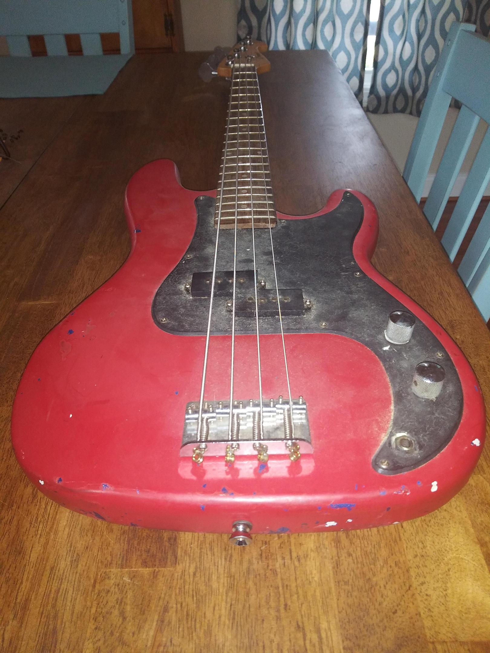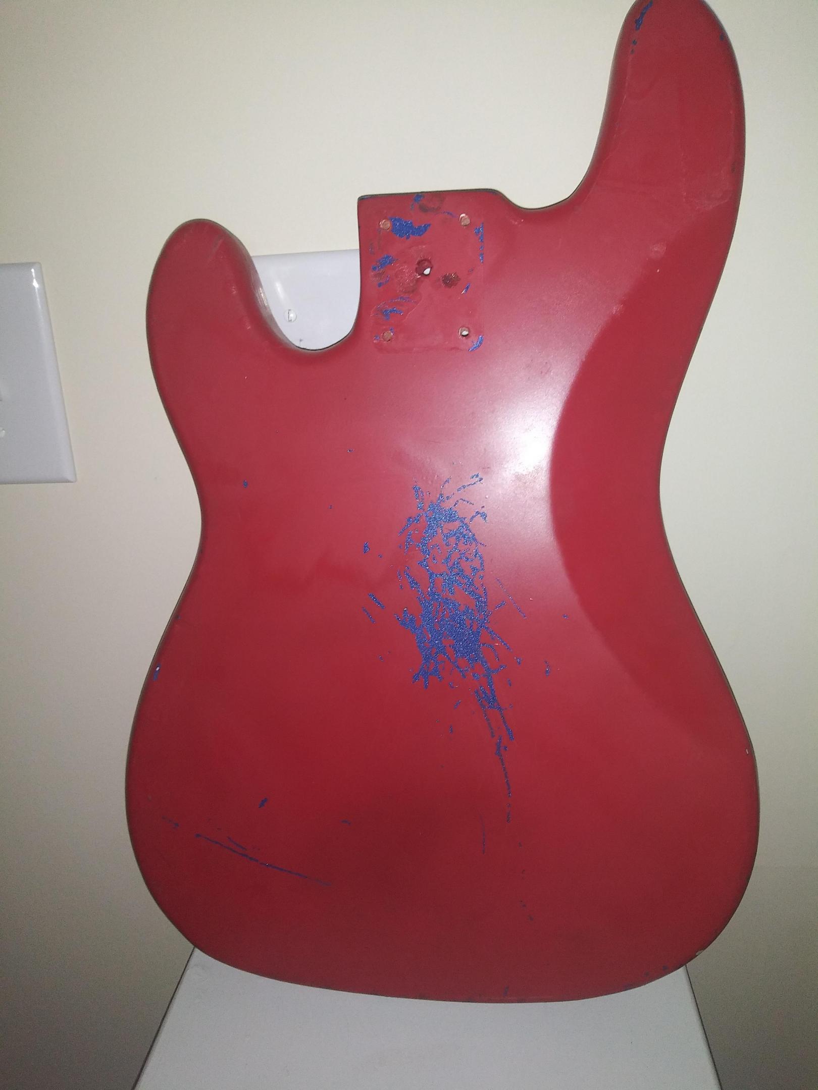 You inspired me to get this old base out and redo it... So thanks! ? here it is, it's kinda rough but oh well I'll do my best... My nephew was in a band in highschool and their colors were red and black so he took a perfectly good guitar apart and painted it this way... It was in my brother's building when he was moving, he was leaving it so it came home with me... I think I can get the paint off and polish it maybe touch it up here and there we'll see... -
