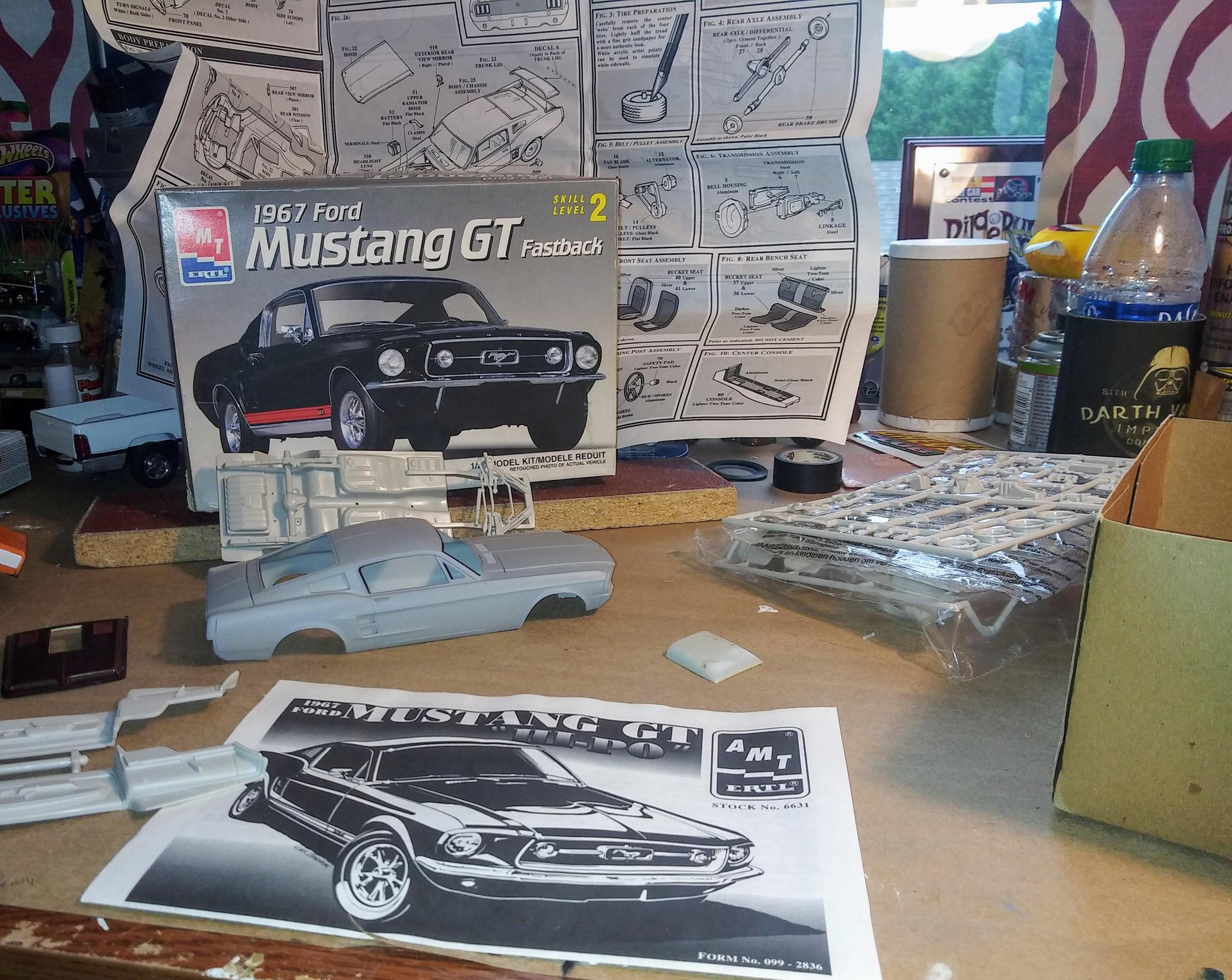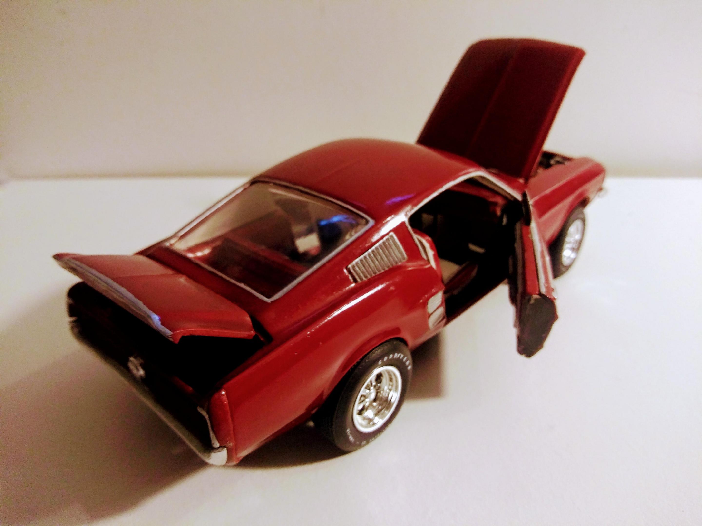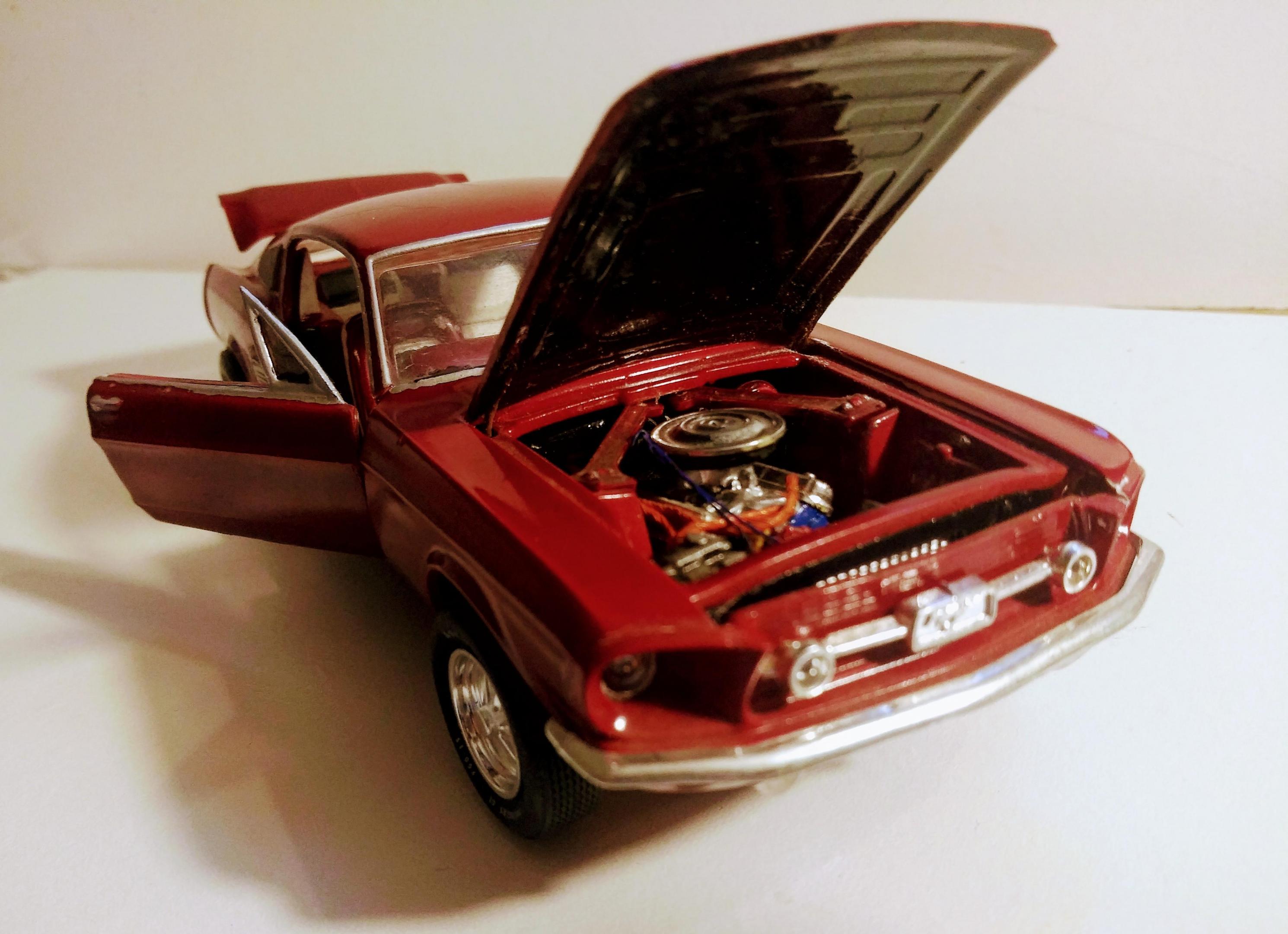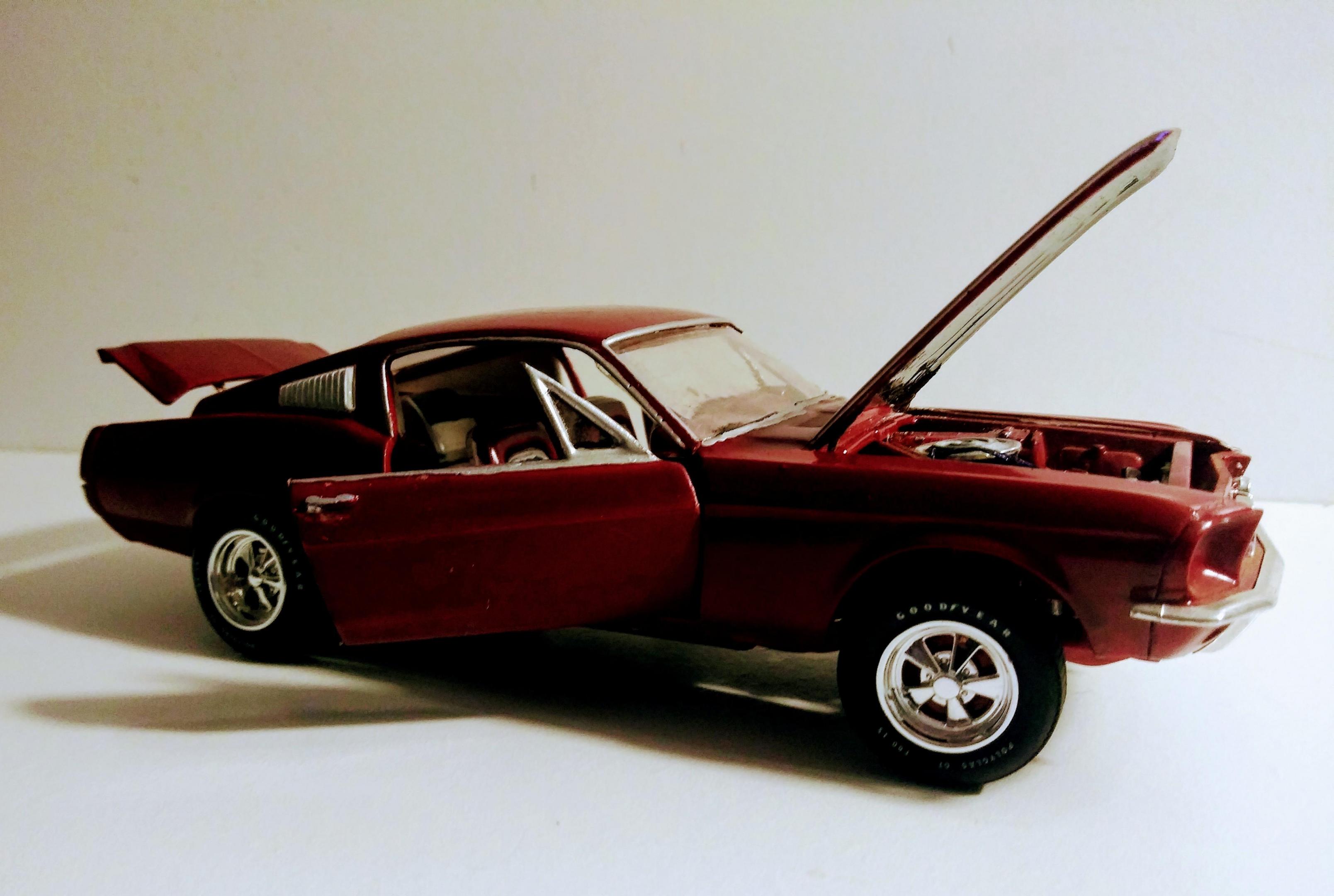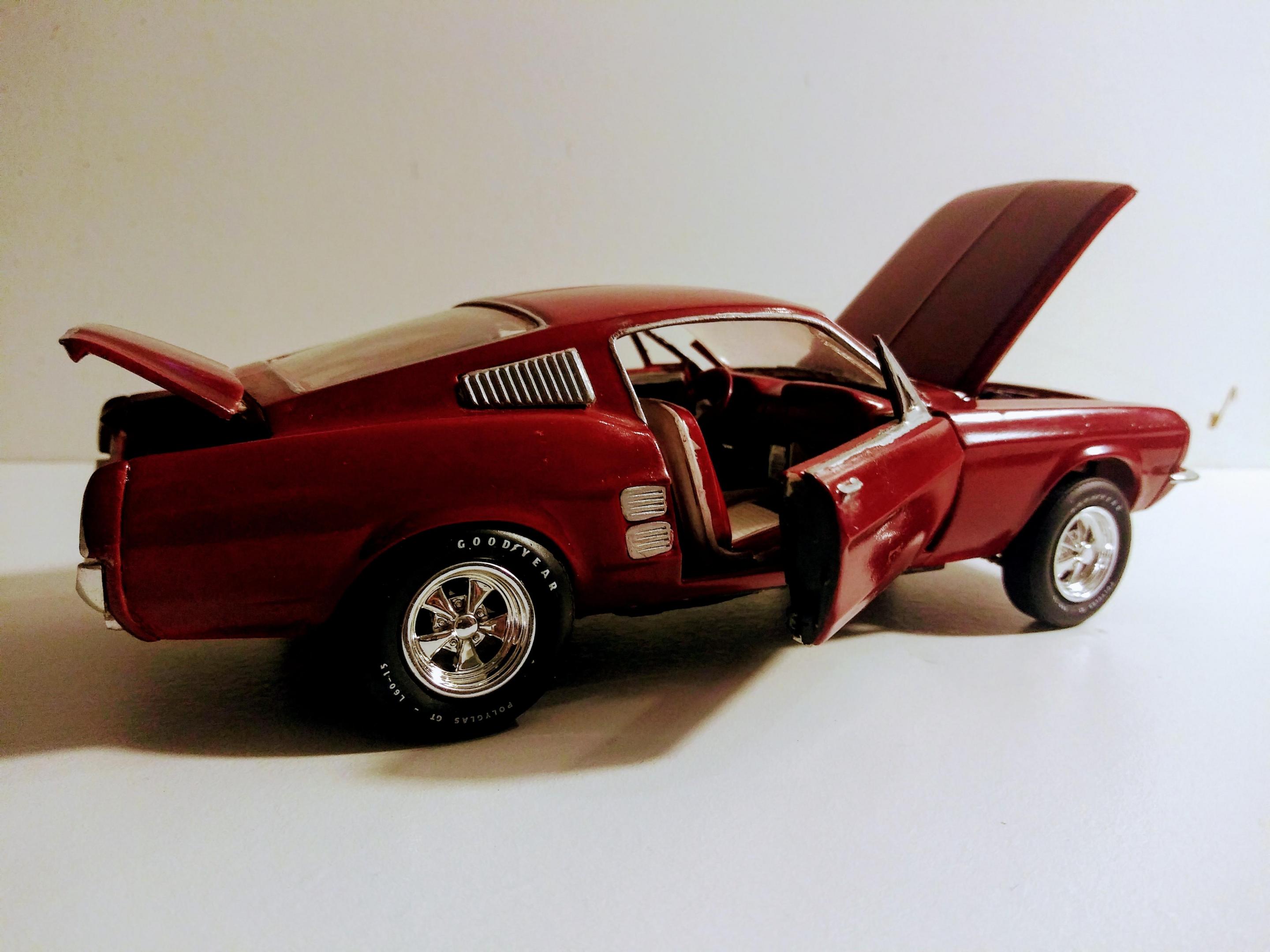 I thought I'd share this with you folks. I took a break from cleaning and organizing yesterday when I found this box of build-ups I rescued from the landfill last year. The Mustang was pretty cool and although it had years of dust and nicotine, I thought I could clean it, So I soaped it up, took a toothbrush to it, added some new wheels and tires. and reassembled it. Here is the result... It's a BEAUTIFUL MESS! ? The original builder has opened the doors, used copper wire for the hinges, brush painted all the details. I think he put forth his best efforts so I thought it was worthy of saving...