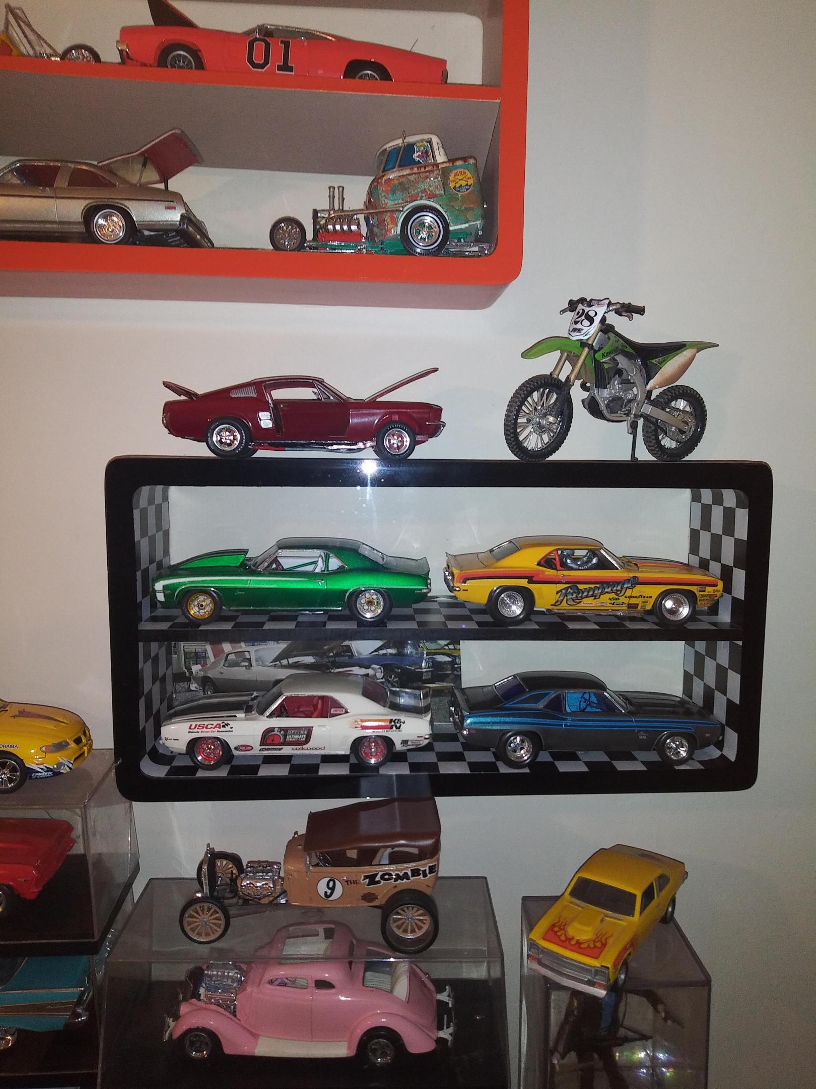 Man, the Monte Carlo is looking nice and I like the Fortunate Son Mustang too. I'm declaring the 64 Mustang done... atleast it's in the case. I still have to locate the door handles, mirrors, and other small parts that are in a sandwich baggy somewheres around here. ? Why is it, that everytime I finish a kit I want to build another copy of the same kit?... Am I crazy for thinking like that? Probably... but I think I have another one in my stash. I'll have to go diggin for it... Later, fellers... -