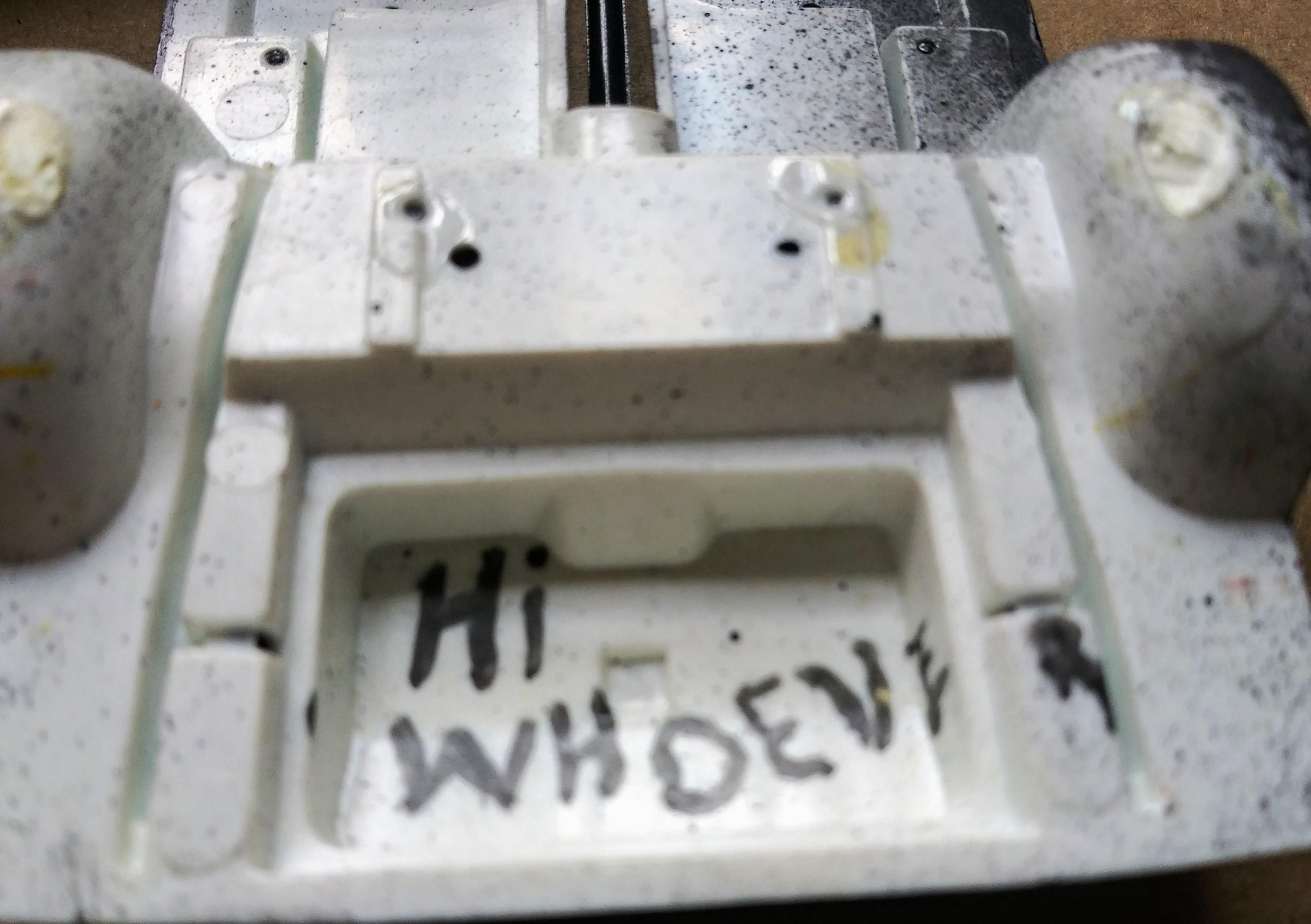 14. When I was younger I would write messages on the inside of my models. Like the date or whatever I was feeling at the time... I wrote the letters "Hi WHOEVE R" and "DONT DESTR 1/12/ 97". I guess when I got rid of it the first time I didn't plan on it ever finding its way back to me... ? This Mustang's History... I got the kit from Wal-Mart around 95 ish... Painted it red with white stripes on the hood and trunk (black inside and top). Displayed the car in my bedroom... got bored with it in 96 and desided to paint it yellow. Half way through the build my buddy comes over, sees it, flips out over it, so I gave it to him after it was finished. Fast forward...2003 I'm at a yardsale in my area and I see the familiar Mustang pace car box art and I think "I've built that kit before" unbeknownst to me that I actually built this exact one, til I popped the lid off and seen it! My old friend had left the state, moved away...and his mom was left with the model to sell at her yard sale...So for a mere 2 bucks it was once agian mine. ?