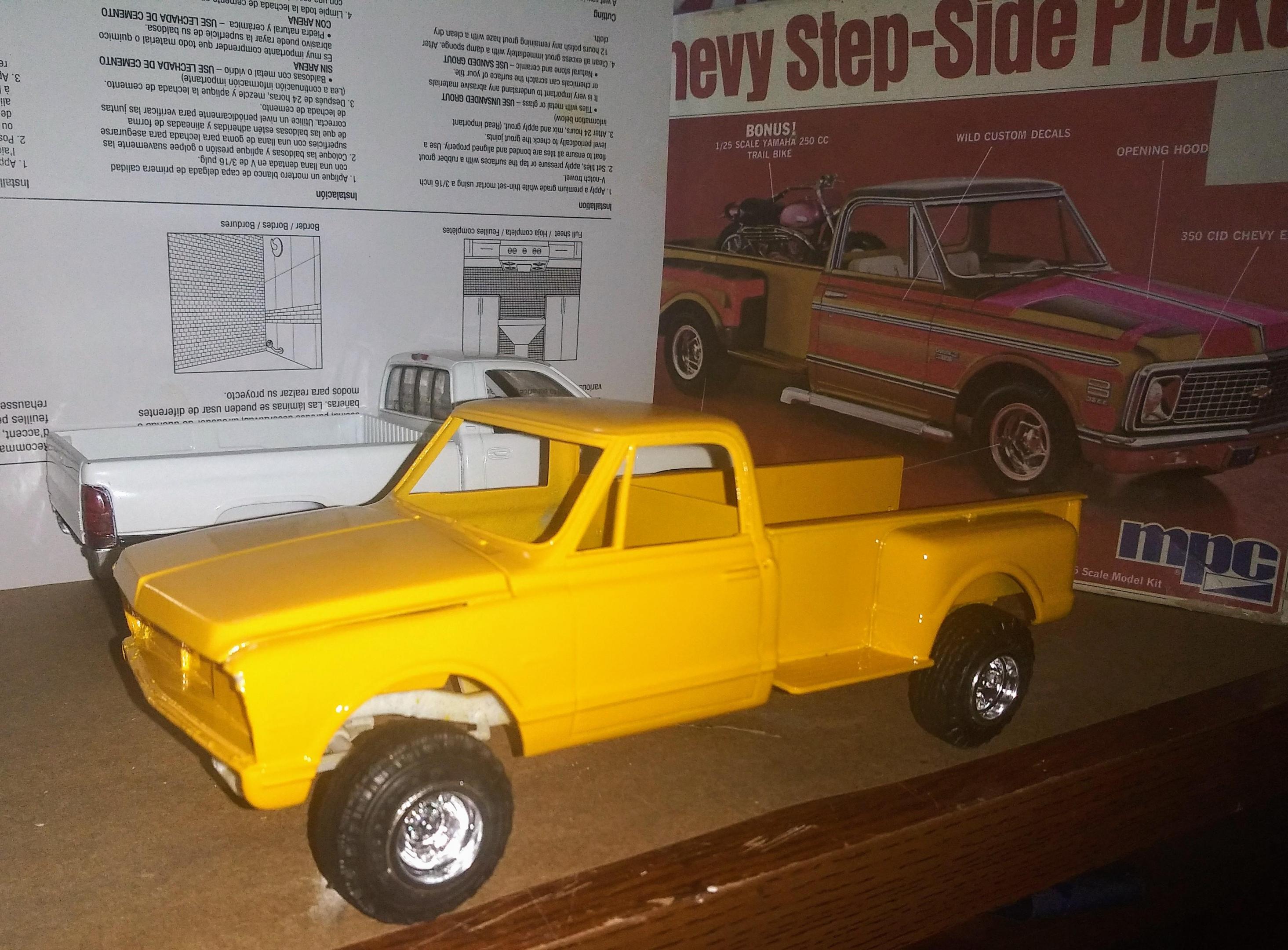Sorry I haven't been around latley to show any update progress, I've been really busy (I'll spare ya the details). Anywho, I totally re-imagined the Stepside after years of trying to get the decals where I wanted them ... So what better way to forget about my original plan? Strip all the gold off and start over...and paint it a different color too while you're at it! ??? I started over with bare plastic' re-did all the body work, primed/blocked it again... I figured TS34 Camel Yellow from Tamiya would help me forget about the boxart... I'll build the motorcycles to match. I know It wont be done before the deadline but that's ok... it will be done soon after... & way before it would qualify for the next round for sure...? I stretched a Crew Cheif Blazer frame for the long box and I think the 4X4 is the best fit for the Stepside long bed... Look for it soon in the finished section... Anyways thanks again for the tread I hope to get back to modeling "Full Time" soon... -