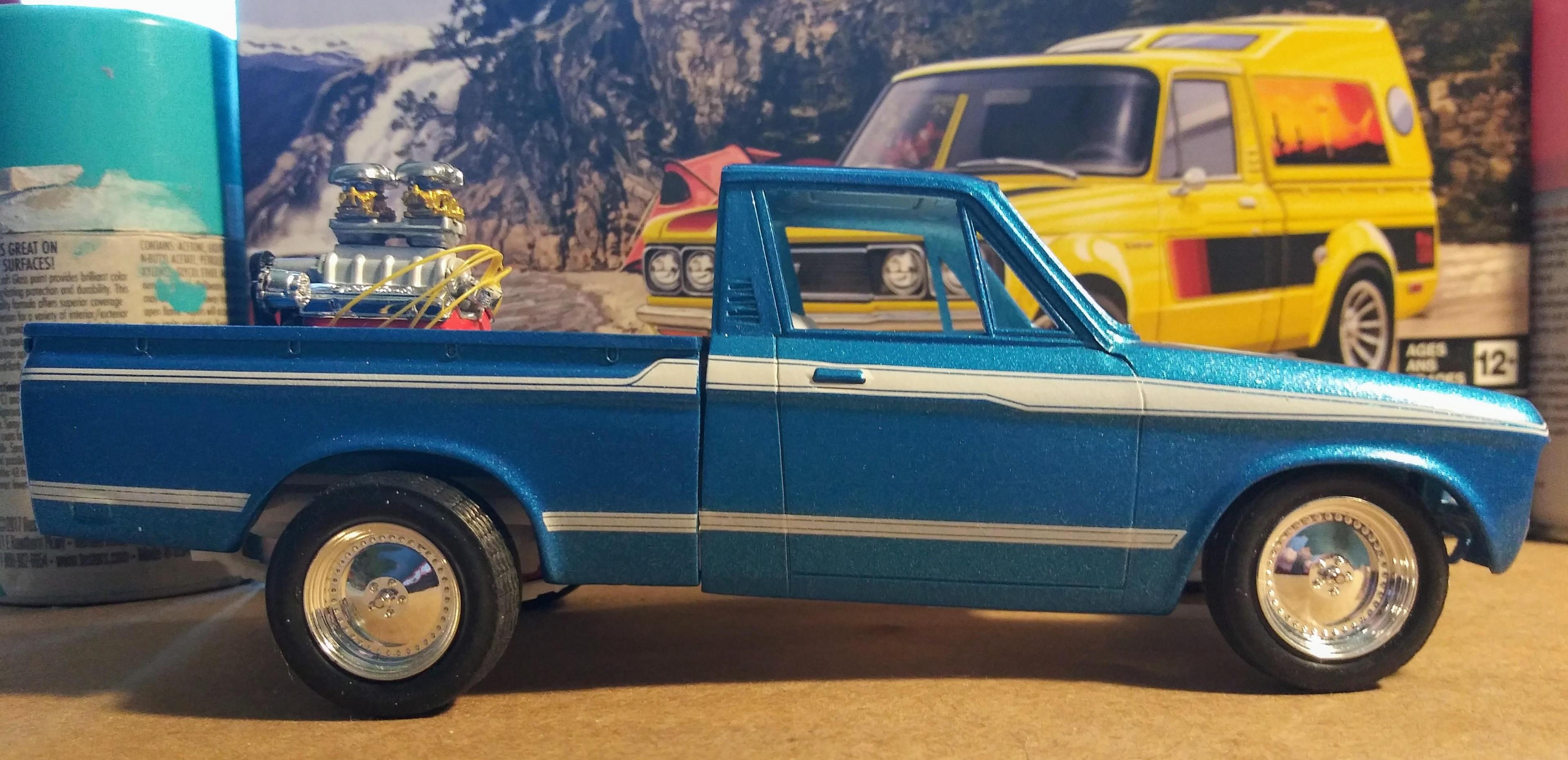 More Stripes ? and an engine in the bed Just for fun! I'm pretty sure I'm gonna have to glue the bed to the cab to insure those decals line up... The directions indicate that you have to put the decals on with the bed and cab together. I did do that but the bed isn't perfectly in line so glueing it is the easiest fix... The Luv Sport and Luv 4X4 stripe options are really cool. I may do orange and yellow or two tone blue to finish it maybe, we'll see...