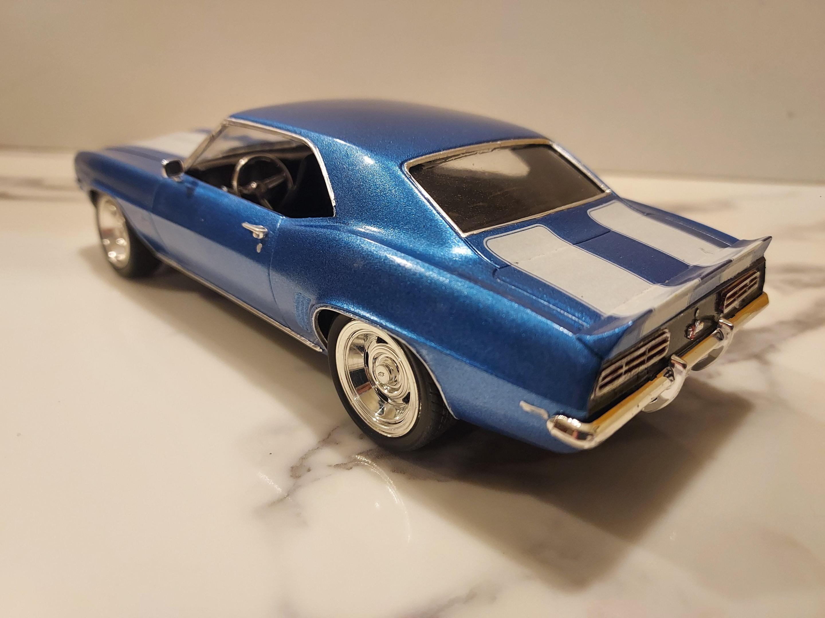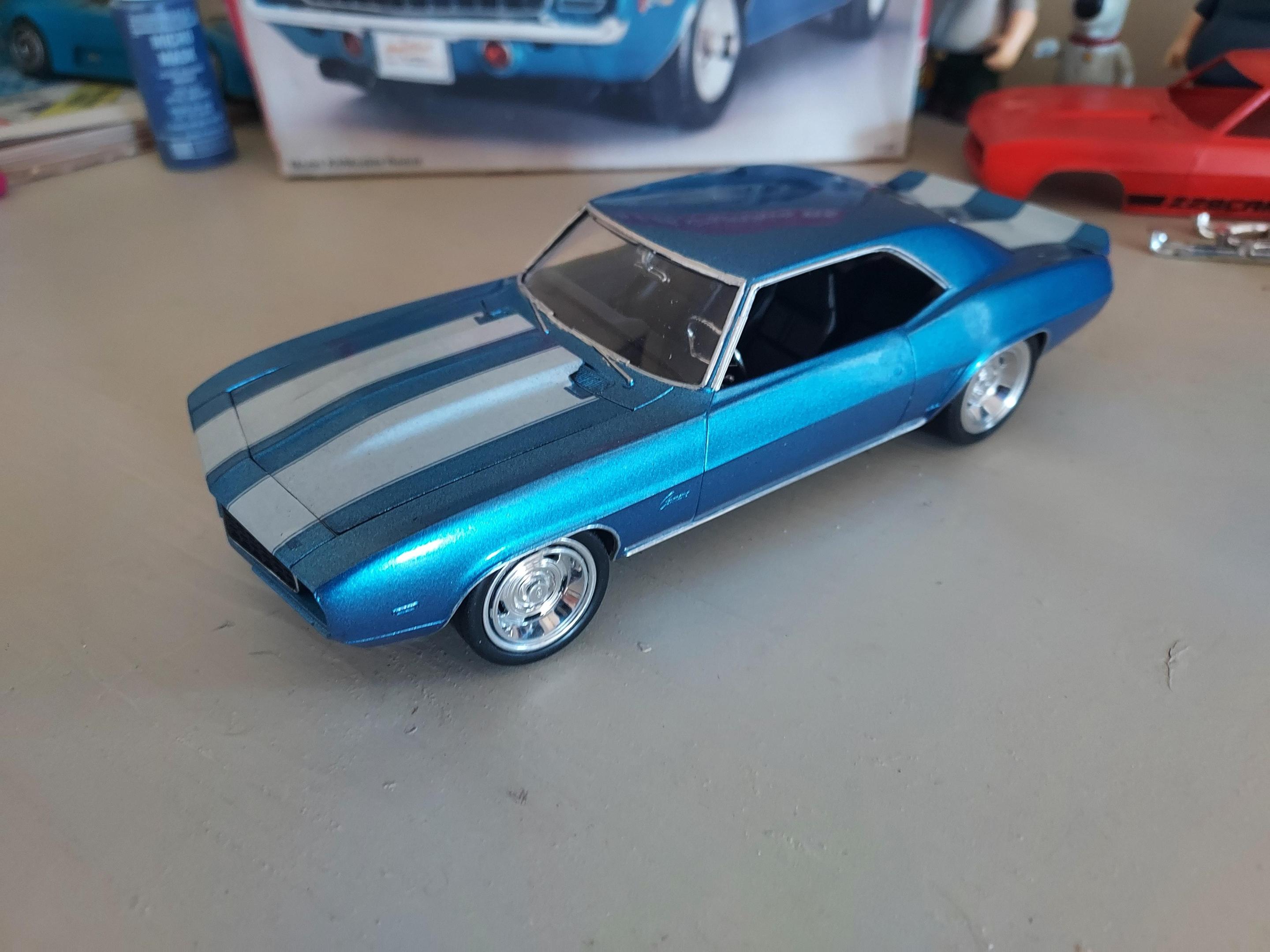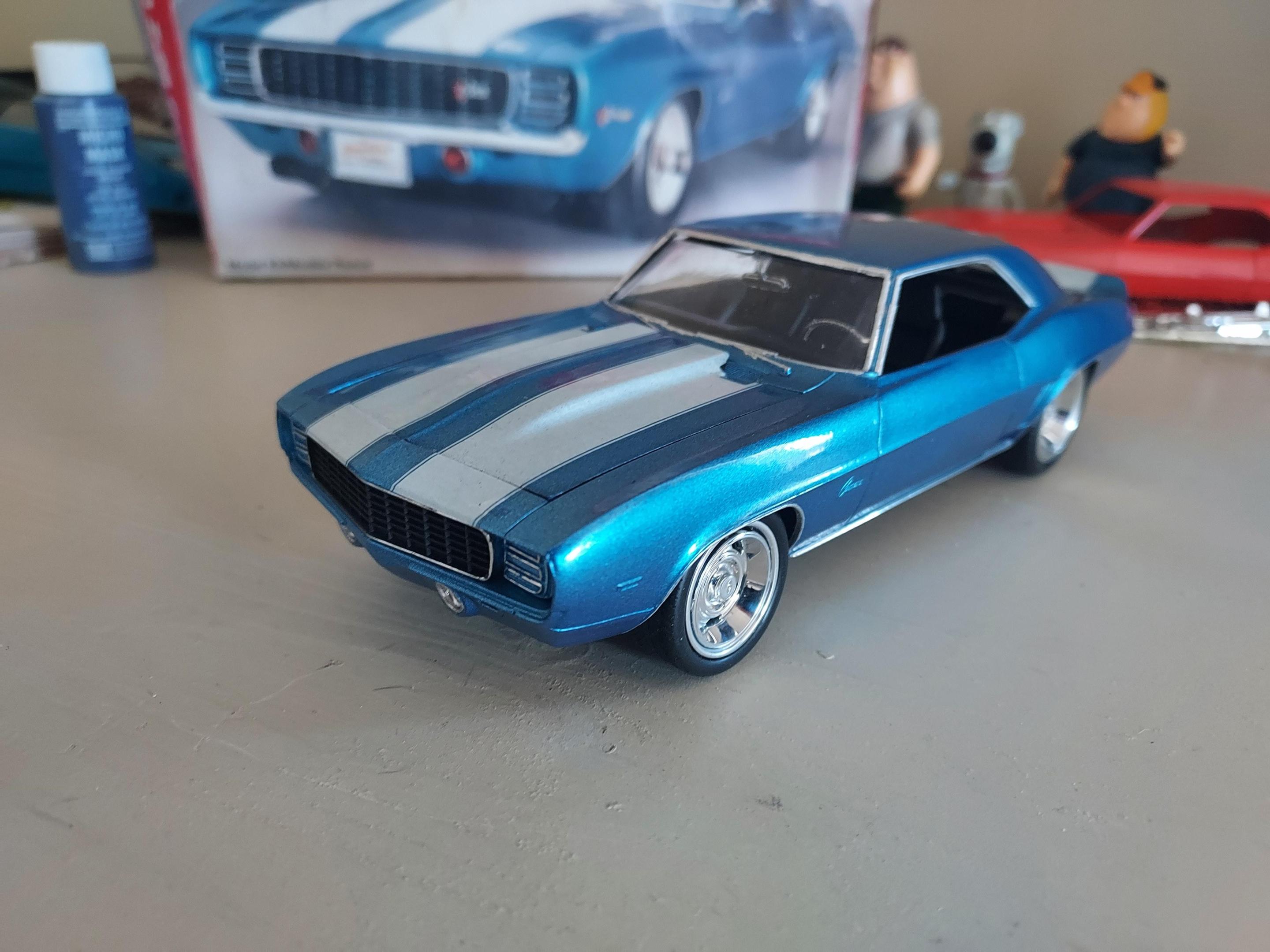 I finished this 69 Camaro for the 2023 RWYB CBR Community build with days to spare! I used the 69 Revell Z28. I went with a modest Pro-touring style look with the retro boxart. I had this build in mind for awhile because this is sorta-kinda how I built my first Revell 69 Camaro back in 91... Boxart, molded in blue/white stripe decals and black interior ?...I did clear coat the body with Testors clear. I built this one as a tribute to the original... with a modern flare. For the Cannonball Run I chose to run a 6.0 LS Yblock from the 06 Concept Camaro. For the interior I used front and rear racing seats to complete the look of style and comfort for going the distance from NYC to Cali. I used Revell 67 Chevelle rally wheels stuffed inside the MPC Deserter rings so they appear to be bigger. Like 20's and 22's ? anywho, here it is finished in Chrome Blue metallic which is close to Monogram blue metallic plastic and matches the boxart close enough... thanks for looking and Happy Thanksgiving to all and have a safe holiday season.