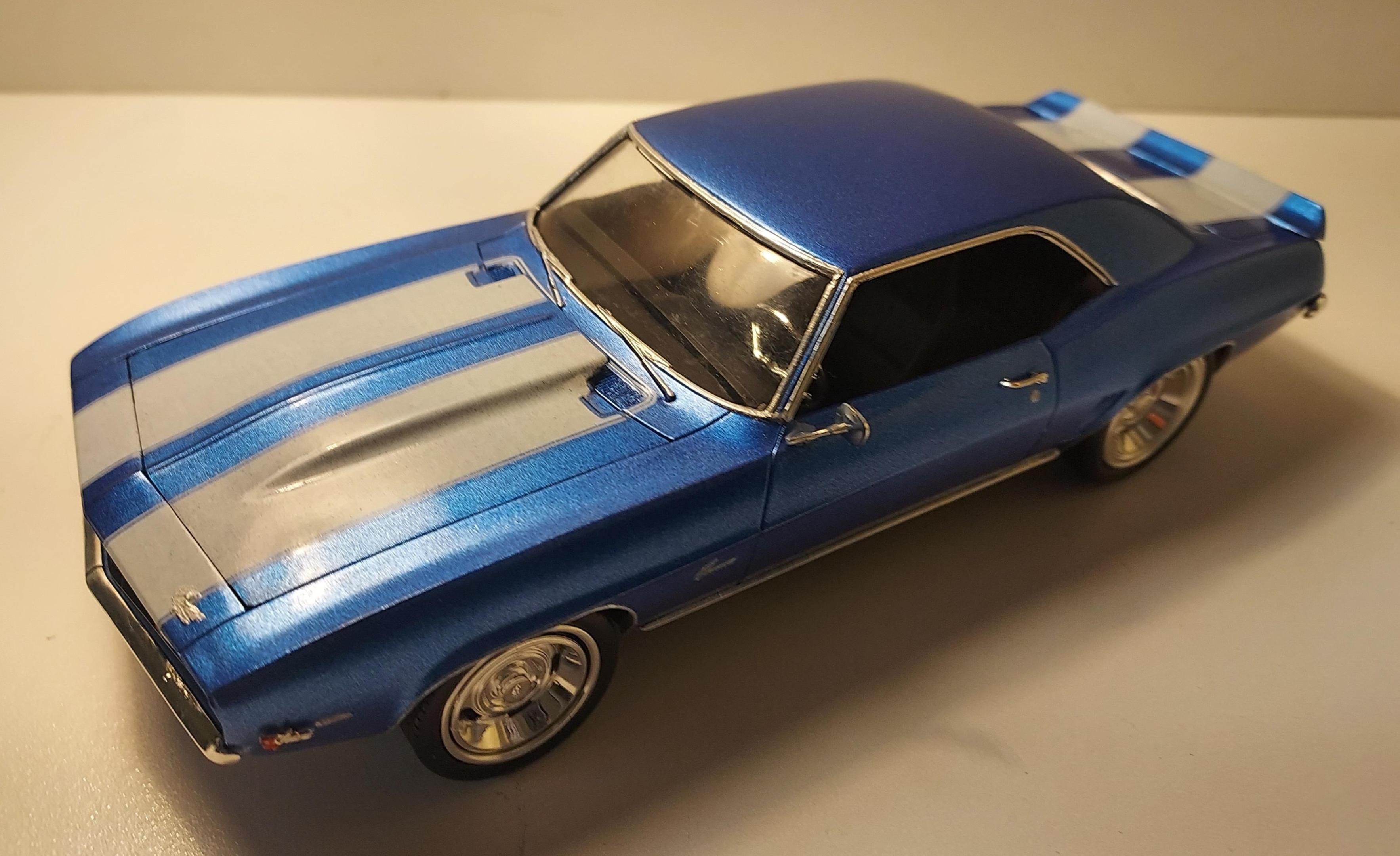 For my entry this year I went with something I love to build, one that is both classic and modern at the same time. For me, one that I'll never get tired of building, a kit that practically builds itself (on my bench atleast). My favorite kit, the Revell 69 Camaro!!! I took inspiration from the first Revell 69 Camaro Z28 I built way back in 1991 and built a tribute to that kit. I built this car as a Pro-touring style cross country cruiser. I replaced the 302 with an all aluminum 6.0 Y Block LS2 from the 06 Concept Camaro... (AFM) active fuel management boasts 30 MPG and 400 H.P. under high speeds. Backed by a 7 speed manual transmission it makes for some low RPM high MPH Flat out racing. Wheels and tires come from various different kits such as a Revell 67 Chevelle and the MPC 84 Deserter 4X4 and complete the 20/22 inch big style Pro-touring look. The interior is Pro-touring as well with 4 bucket seat for comfort. The paint scheme is just a simple boxart style that inspired me as a teenager. The color is Chrome Blue metallic with white stripe decals and clearcoat. I followed the box closely as a fun way to call out the inaccuracies of that original boxart. The blacked out taillight panel and the cowl stripes are two details that stand out. Those cowl decals were meant to be boarder stripes for painting the white inside the grates. I had fun re-creating that design. Overall, I like how the build turned out and at last I'm ready for the Run!