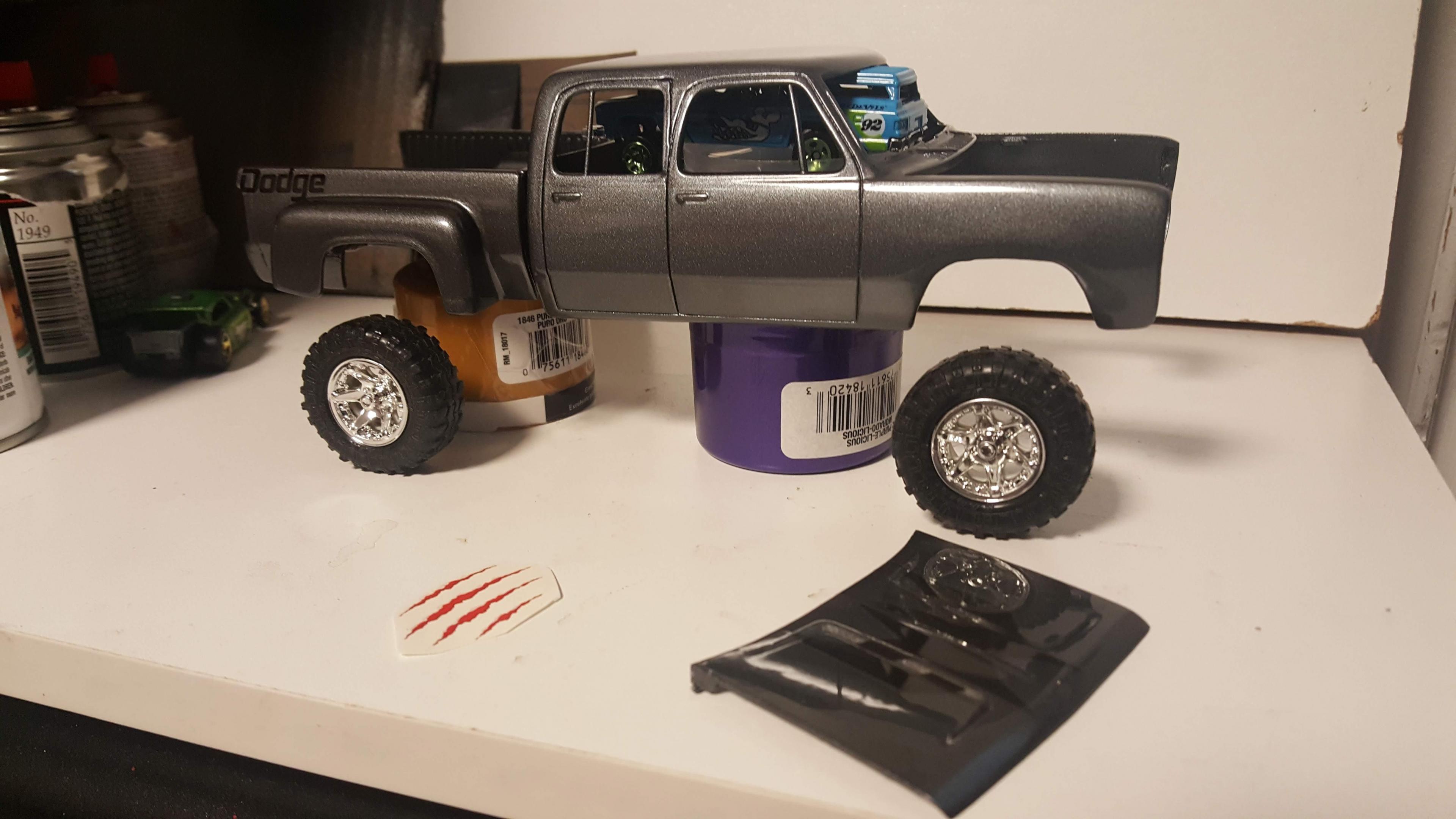 Thanks... I did the best I could with what I had to work with. I'm gonna build my own, starting from scratch with a virgin kit... I'll definitely refer back to yours. The level of dedication shows in your work. I tried to save the drip rails and the bodyline under the windows but they were sanded smooth in some places. If Trevor ever finishes it I'll post some pics... He was gonna use a diesel engine and duel wheels. I painted it as a Preditor special edition... (Like the Transformers Camaro or the Bullitt Mustang)... Here's the hood with the Preditor logo... Looking back, I think a two tone paint scheme is the way to go.