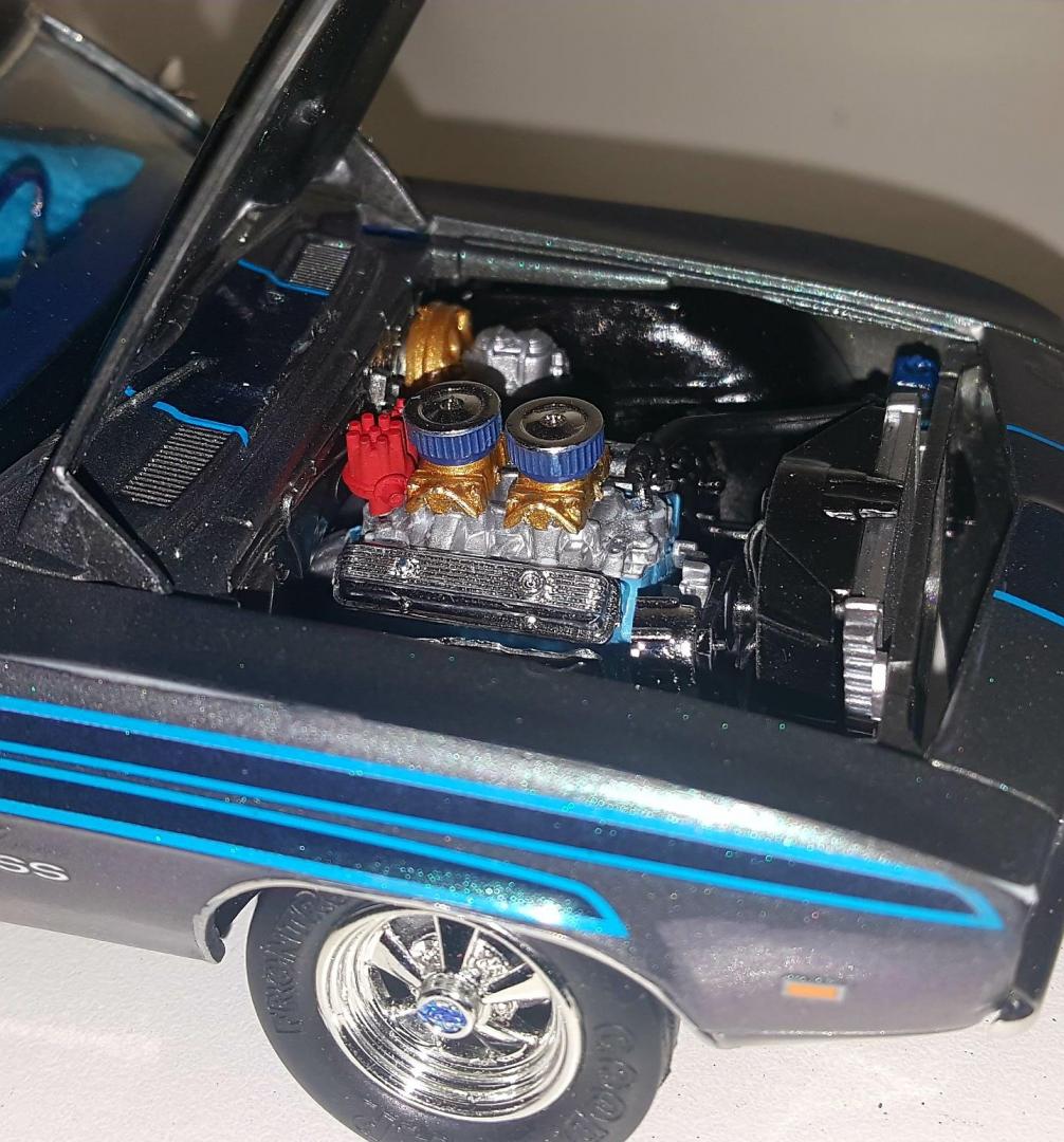 "Killing it Gene!" The Chevelle is 99.9% finished... well, as much as I want the build to be... My vision was always to finish the car the way I built the original one back in 1988, (minus my little cousin's fingerprint right in the middle of the roof... lol!) As I had stated before it is a replica of a 69 Chevelle, this guy in my town named Steve Fitzgerald owned. Like many street machines of the day it evolved over the years... But I built this way it was when I built the first kit. It was a Big block from the factory but he burnt a piston and replaced it with a 350 small block. It also had satin Centerlines on it which he later swapped for polished Centerlines around 91-92 (pretty much the last time I seen the car). I'd like to know where the car went now that I've been reminiscing about it. It was a show stopper... It had white interior 4 speed, deep sounding exhaust (before flowmasters) so, not sure what mufflers... We'd park in town and hang out and watch everyone cruise around. Good times! I like doing these kinds of builds because it allows me to provoke old memories of my younger days. As I'm working on this kit I'm thinking of the real car and the model I built of it back then too. Very inspiring I must say. Now on to finishing up the chopped Ford. I'm in the middle of packing for the move and doing small repairs to this house.. all while refinishing old furniture... (my new hobby) but I'll make time to get it whipped! lol thanks agian for this thread, it really does work! -