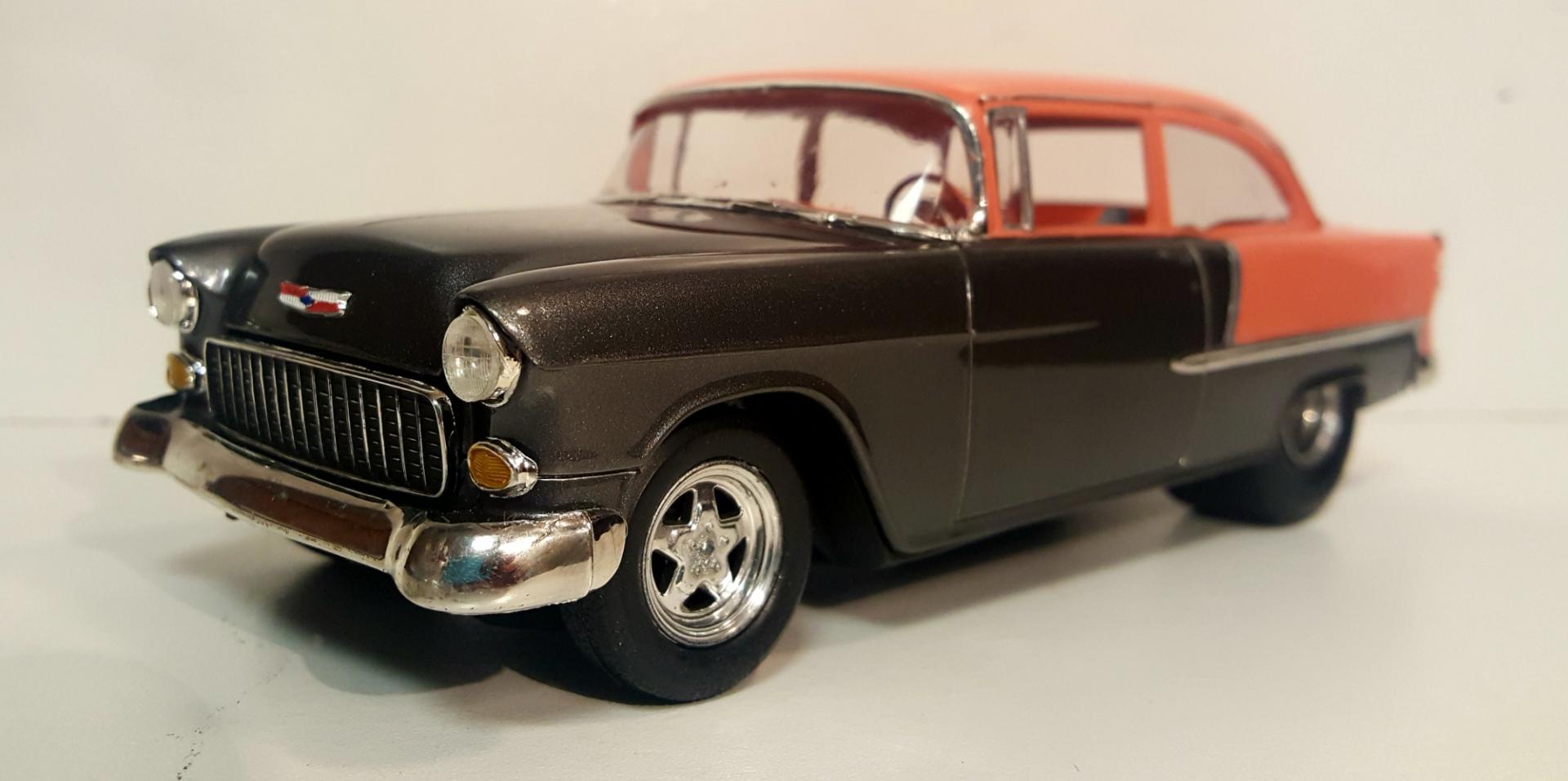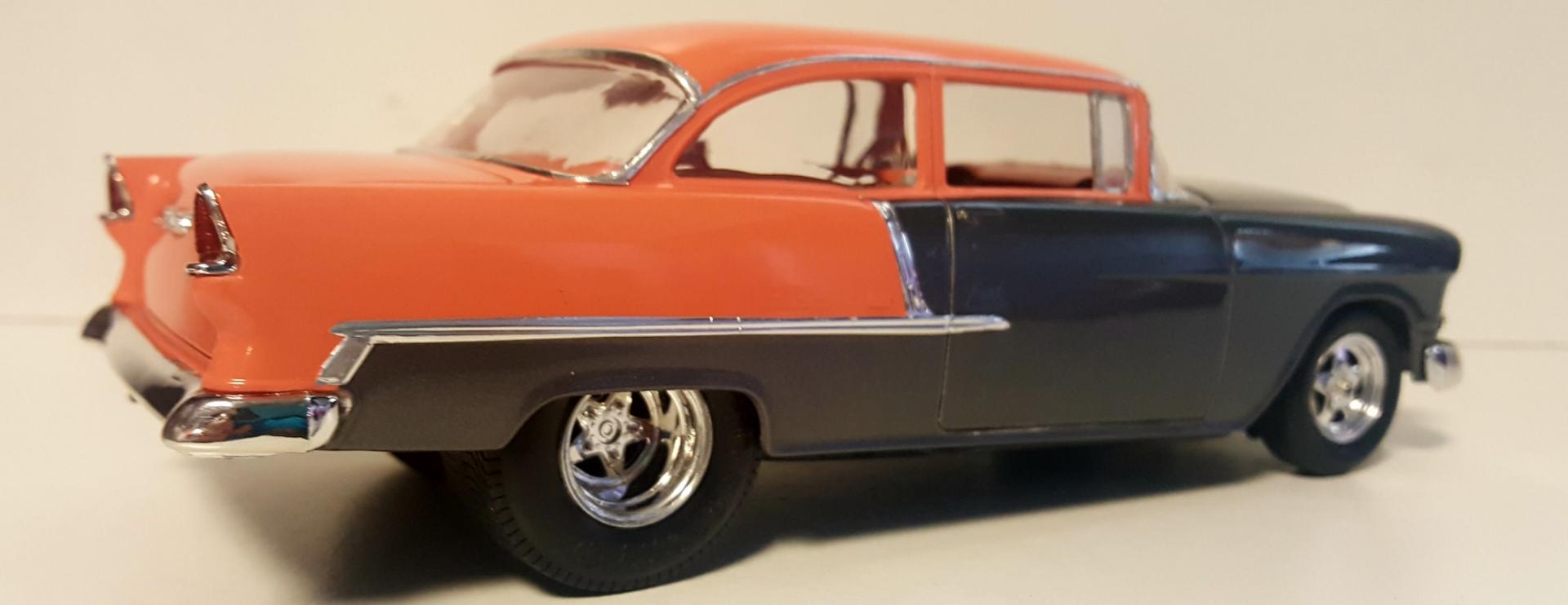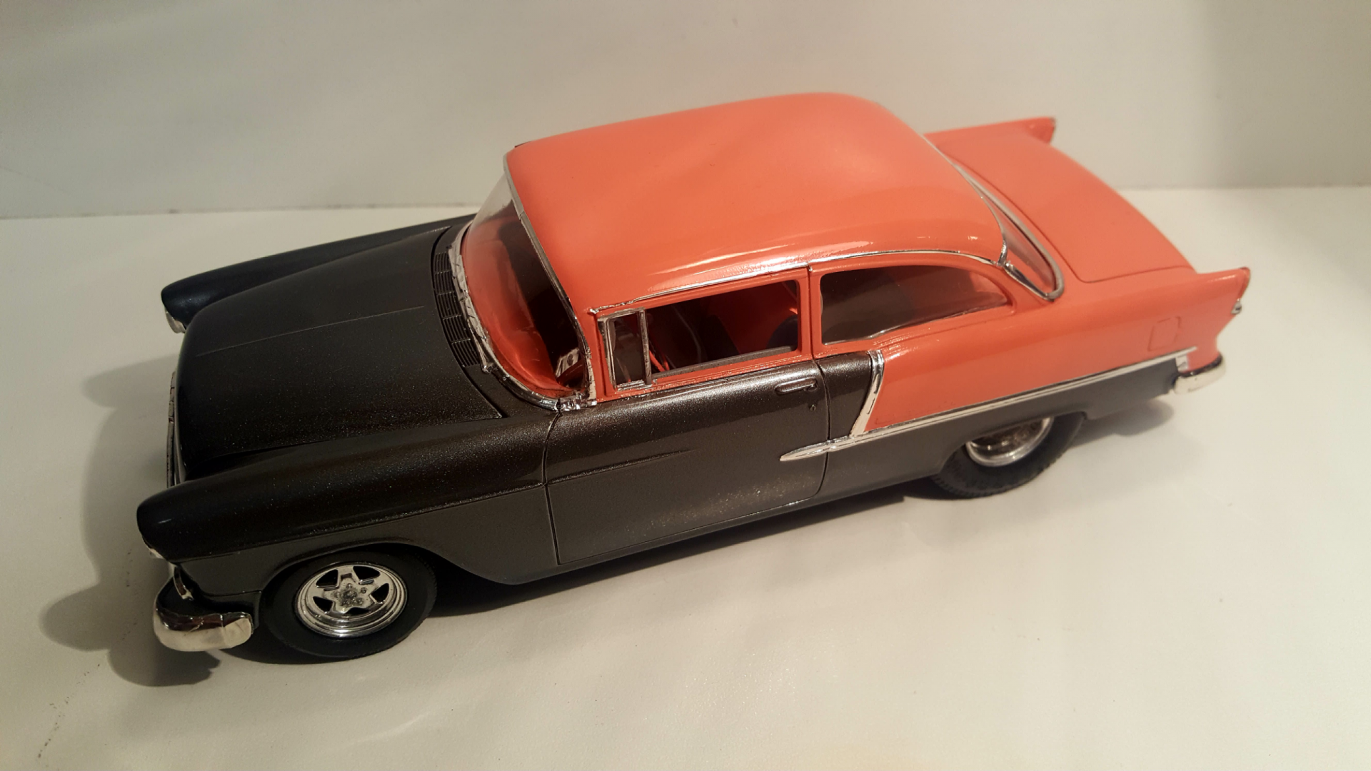 I'm more or less experimenting here and I probably won't like the result although I love the real car painted like this... I always thought GM got it wrong though. I think the colors should've been swapped, (coral top and gray bottom). I've never seen a real one with the two colors reversed. So that's why I decided to do it now... the colors I'm using are darker than the 55 colors but you'll get the point when it's done. -