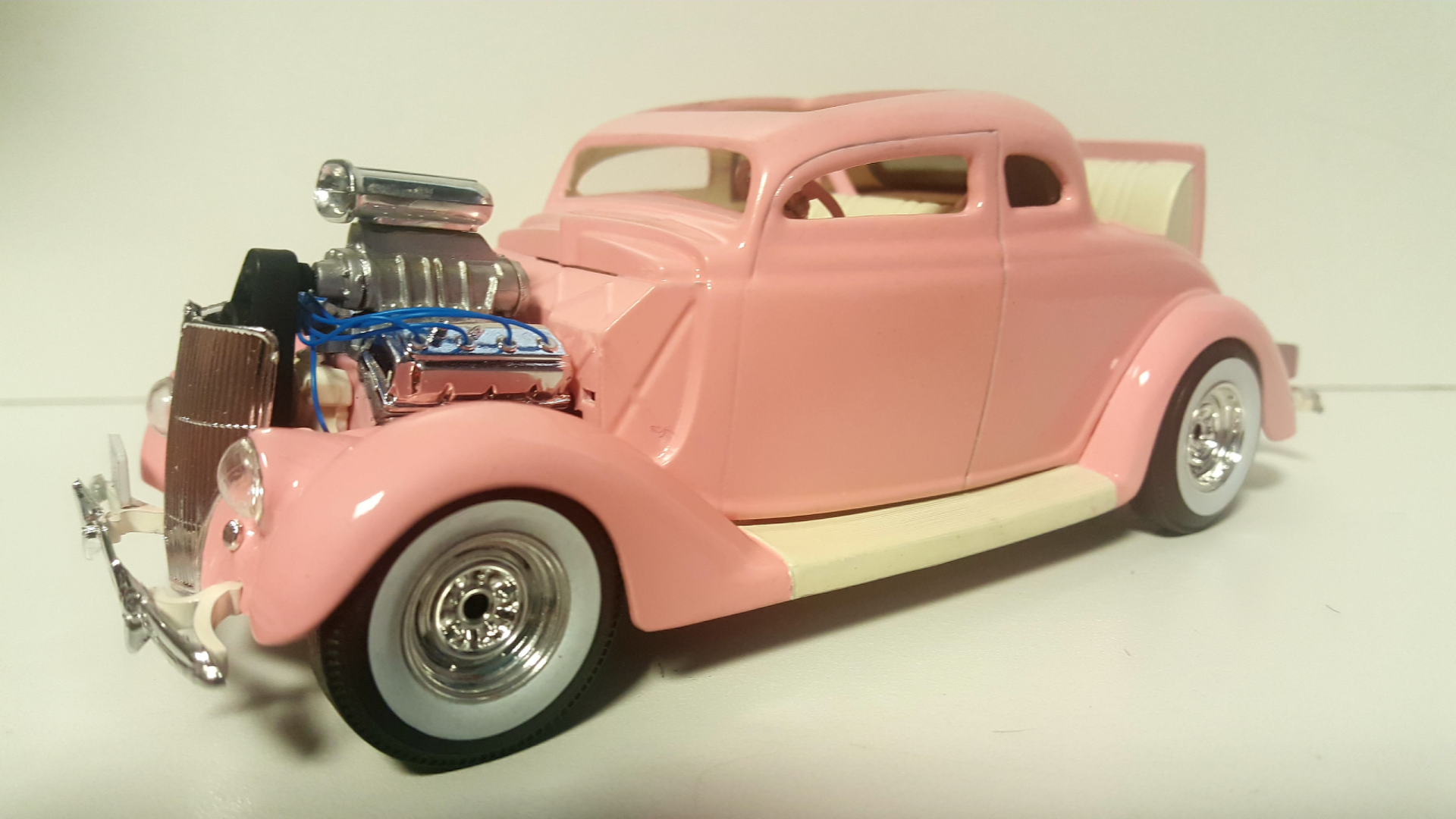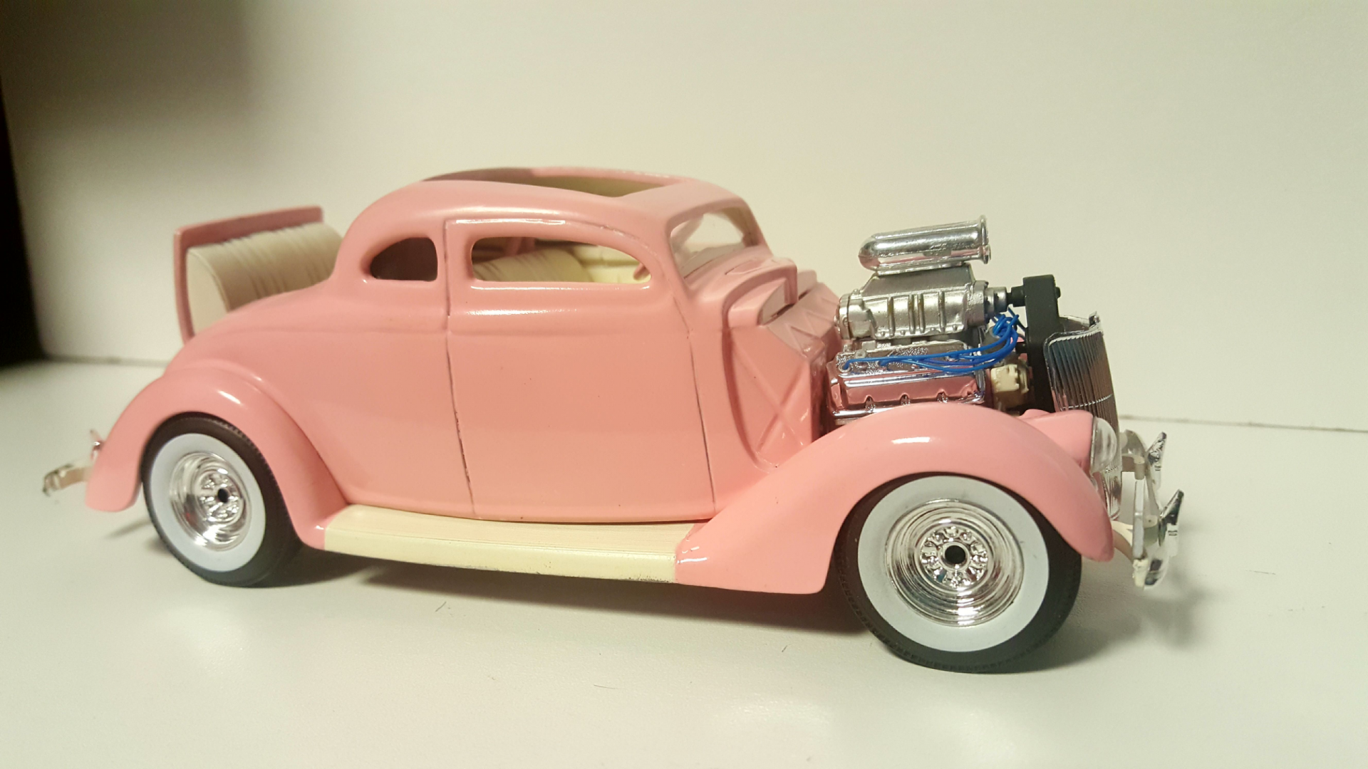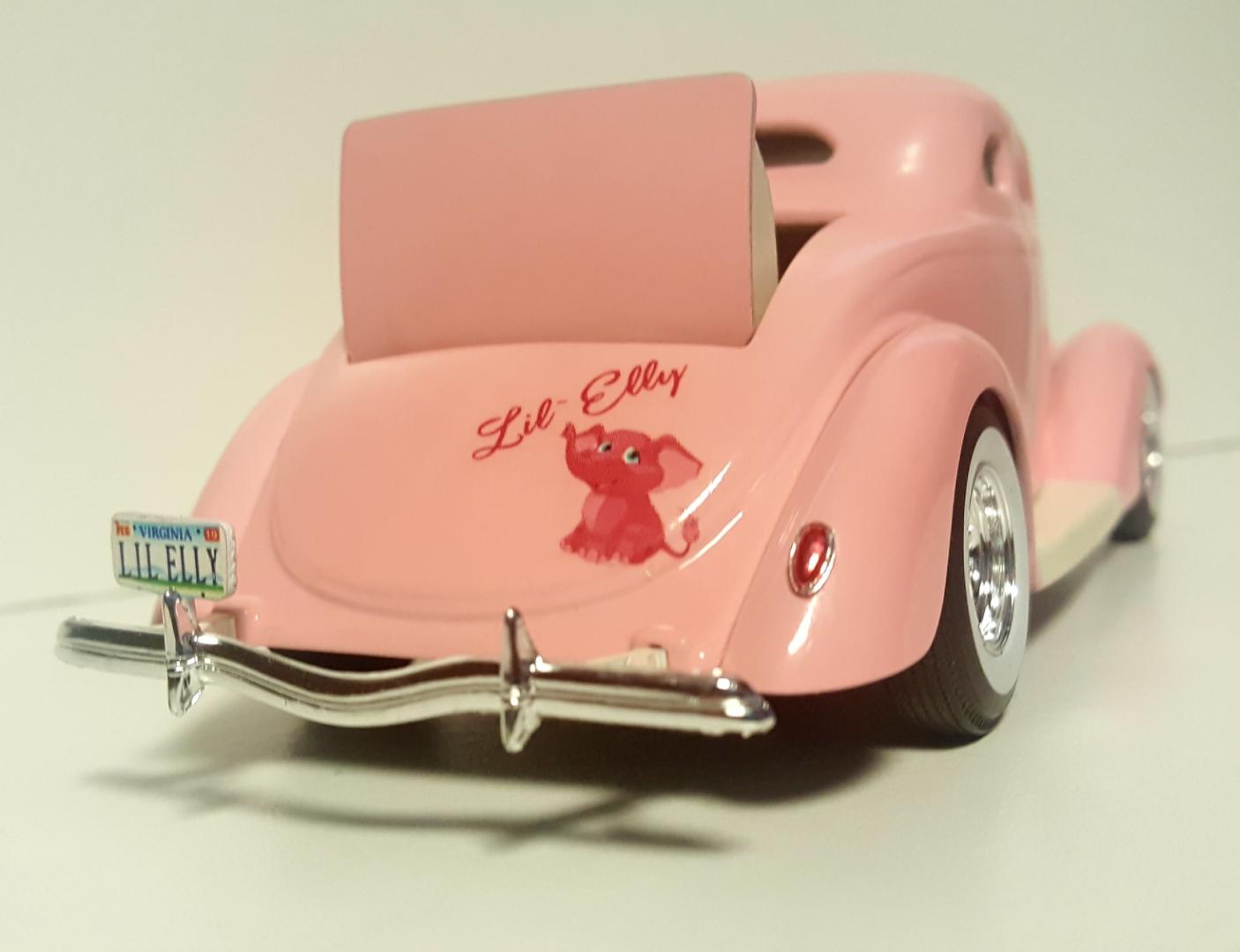 Pretty much when I got the paint on this 36 Ford I knew it had to be an early 60's inspired Custom. I kept the teardrop headlights but I chopped the top and removed the center out for another point of exit from the car. I wanted to chop the top so low that gettin in from the top would be easy by stepping on the running board. Although I couldn't chop it as low as I had envisioned I do like the overall shape. It's not my best work but overall the subject matter gets the point across. and aside from all that it's not typical of what I build so it gets me out of my norm for a change. I'm enjoying the build. Thanks for looking.... more to come. Oh and the "Pink Elephant" refers to the Hemi and It's pink. I named it "Lil' Elly"... -