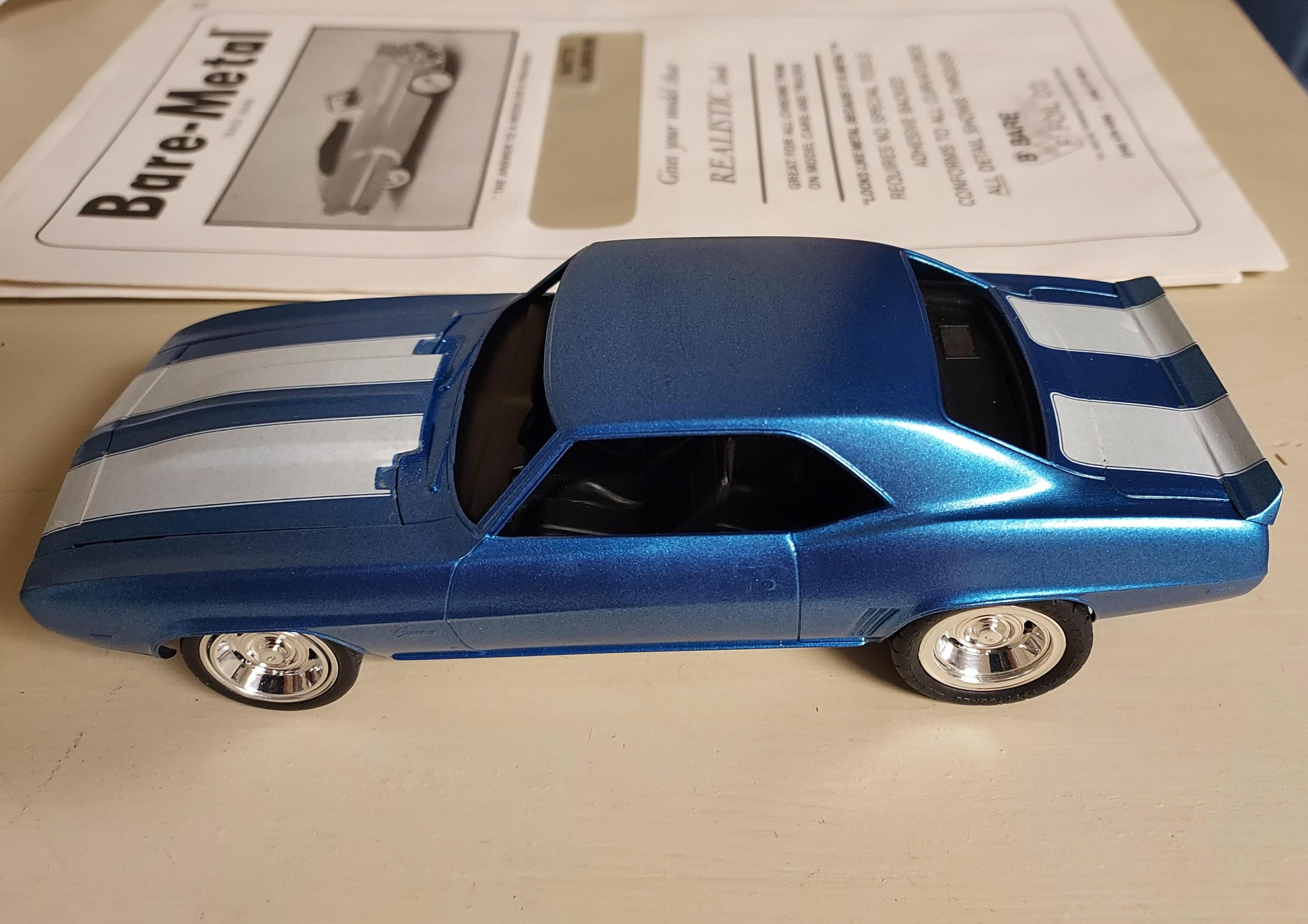 Quick mockup with stripes on it. I ended up puttin too much pearl on the stripes and I didn't cut them close enough so I had to go with a new set. I'm planning on adding the pearl to the applied decals hopefully that will work. I do like the color with the first coat of clear. The blue looks close to Lemans Blue... a factory color for 69. -