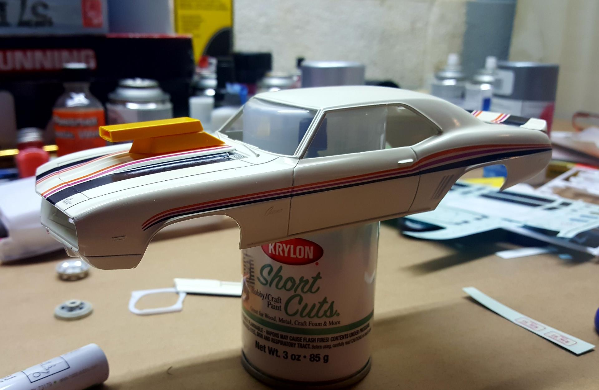 Back at the bench busy applying some decals... I desided not to alter the decals to fit the 1/25th kit. I built this kit with these decals before and I cut them down to fit but I never liked the result... I'll bury them in clearcoat tomorrow supposed to be in the 60's. One thing I can't use on the camaro is the 1:24th hood scoop... I'll have to find a 1:25th snorkel scoop... Can anyone think of what I can use? I don't want the scoop to be permanent, it will just sit on the hood for display. Thanks for any suggestions...