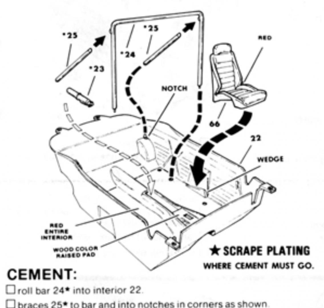 I'm intrested to see pics of your grill when it's finished Snake... I've been looking at the original directions for color confirmation on the Cream camaro. I see that the interior tub didn't have a back seat. I had engineered a custom back seat to fit the tub. Apon seeing this, it makes me want to switch directions. I dunno... hmmm?