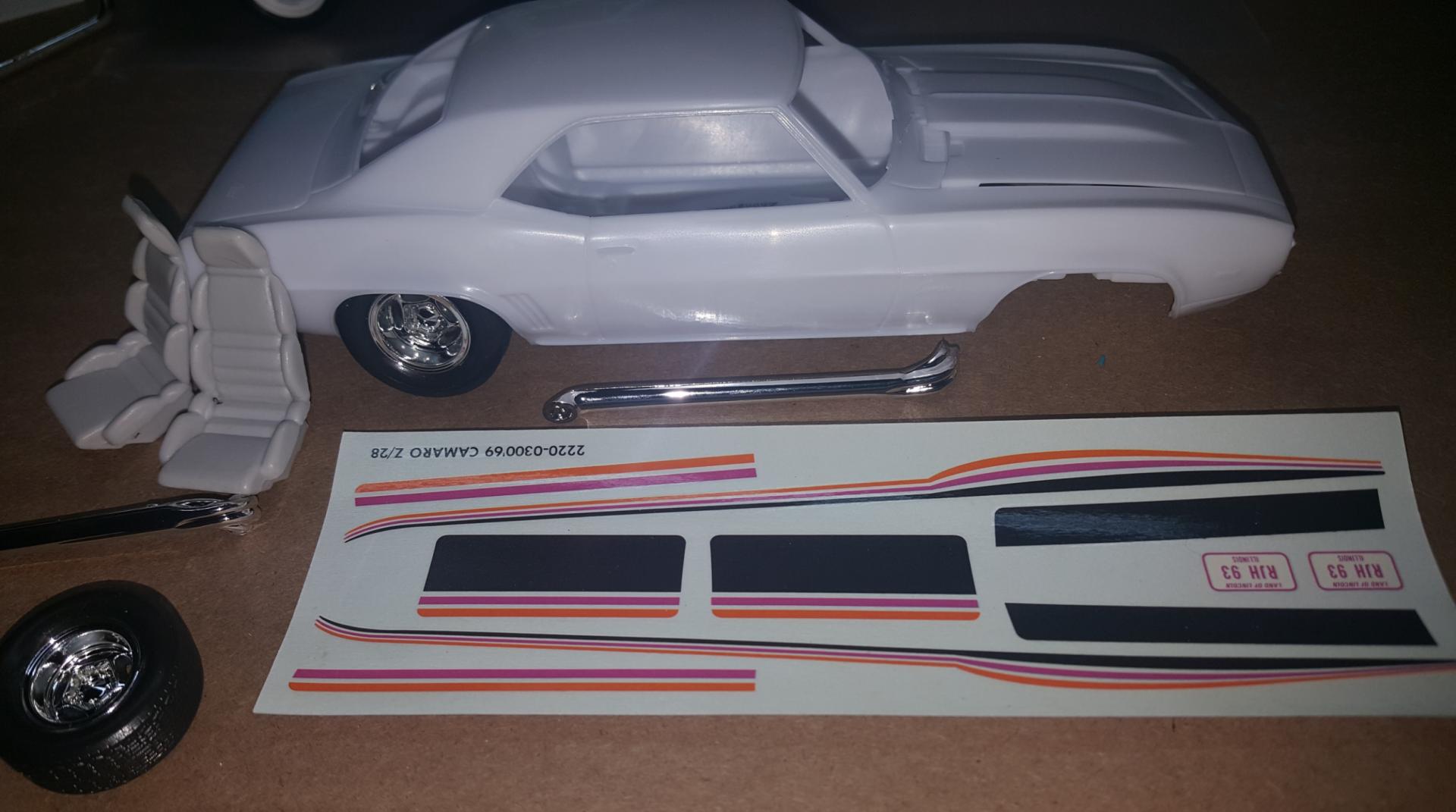 15. Here are some of the parts I'll be using. The wheels are "Spyder" type from the MPC 79 trans am and the side pipes from the AMT 68 camaro. The decals are the only thing I'll be using from the original kit.