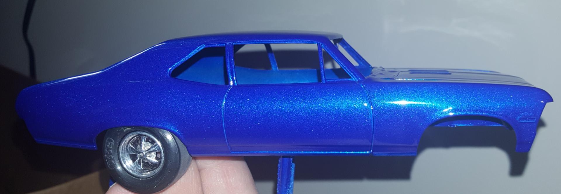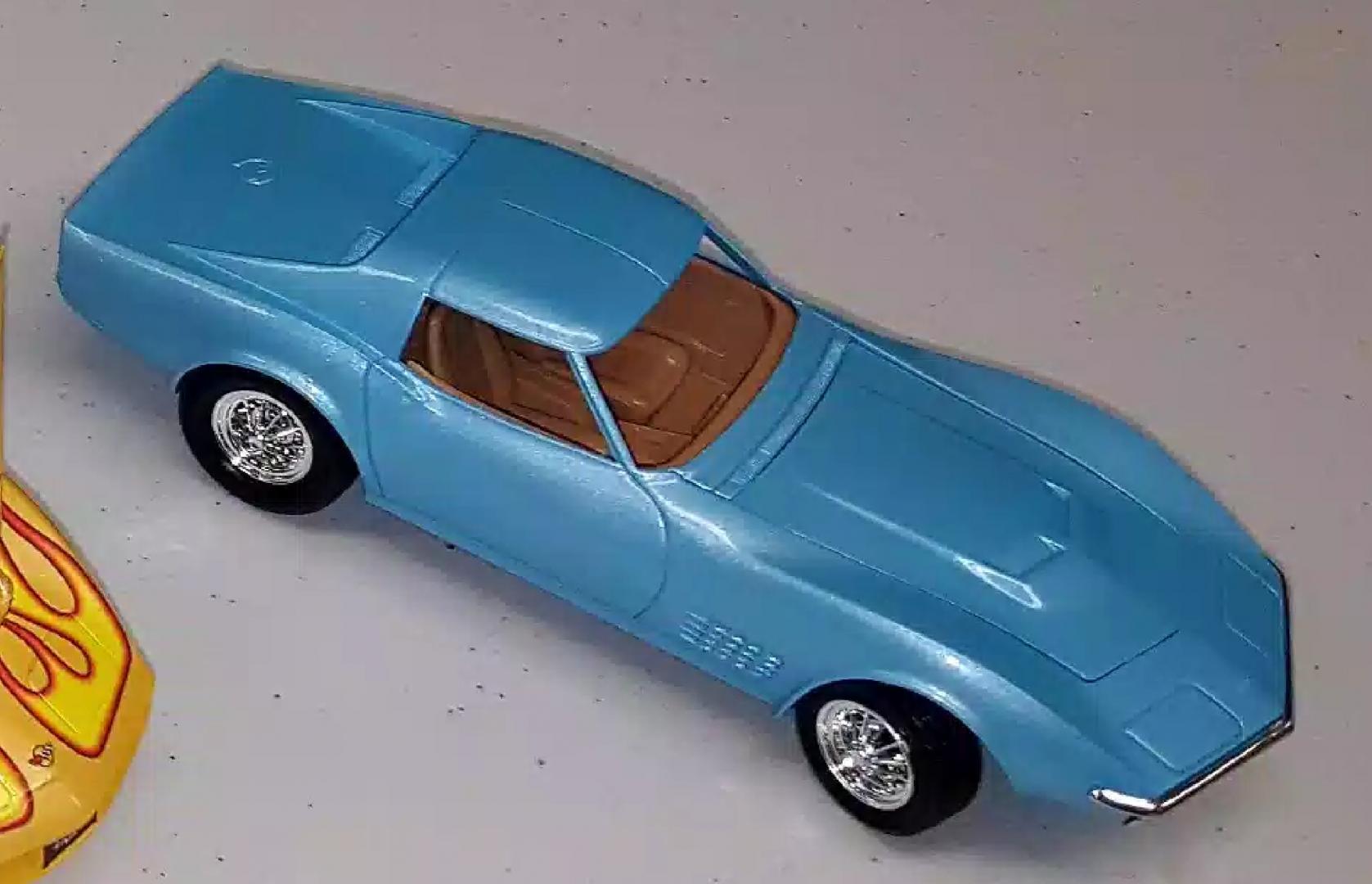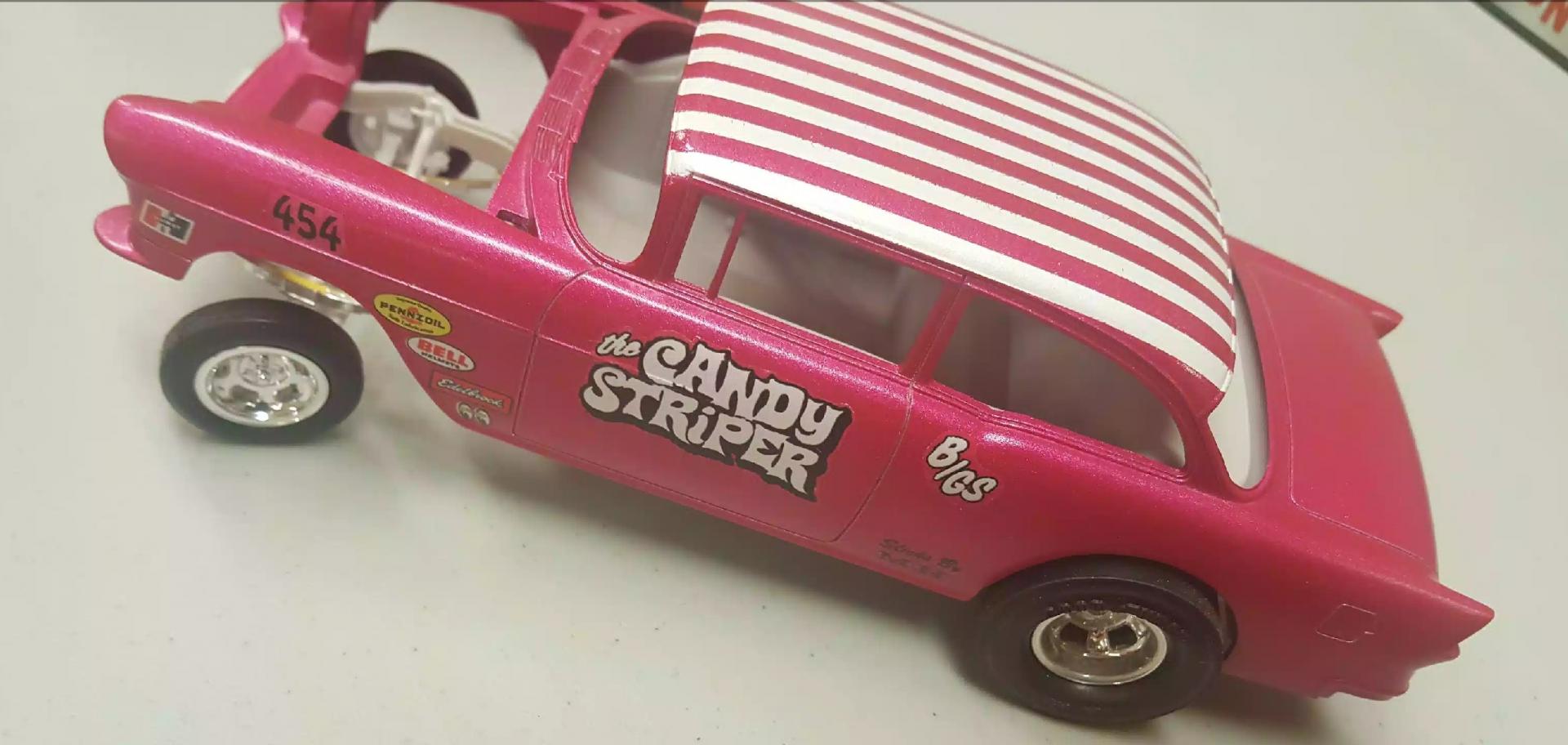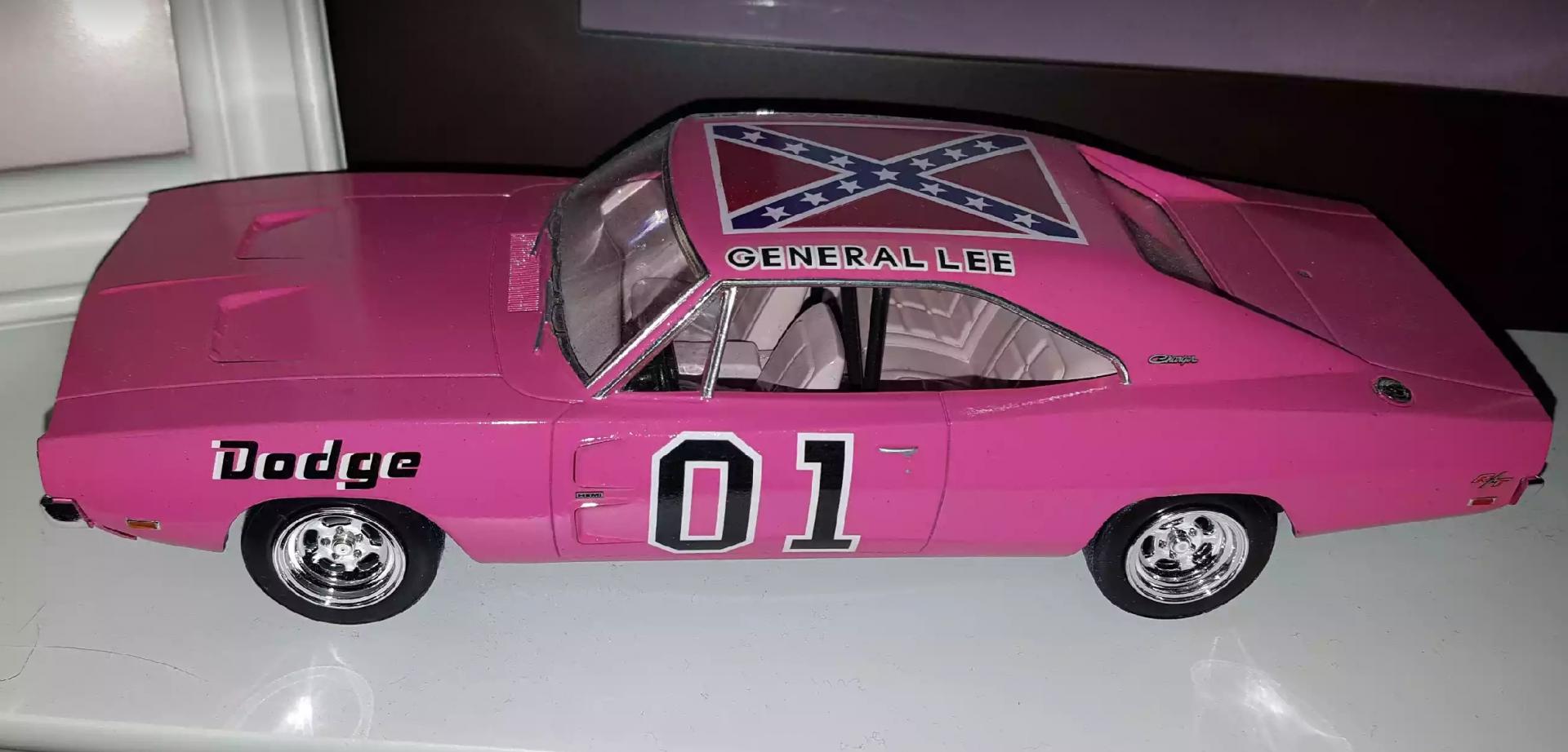 4. Here is my thought... you may get the desired result if you use Testors White lightening pearl as a top coat. (Hobby lobby stocks it). I'm afriad if you are just starting out, the nail polish/airbrush route may seem too complicated... not that the airbrush method is a bad idea. I painted a pt cruiser Hot magenta by Modelmasters (General lee pictured) with the White lightening as a top coat. It looked like the 1.1 mustang pictured. The blue vette is Testors baby blue with this same technique... and it totally changed the color. You could use Testors Electric pink (Candy Striper 55 Chevy) with the White lightening over it to lighten the color a bit. I would do a few sprayouts on plastic spoons to see which one suits the build. The spray cans will be the simplest way to go I think, good luck with it... I look forward to seein the progress.