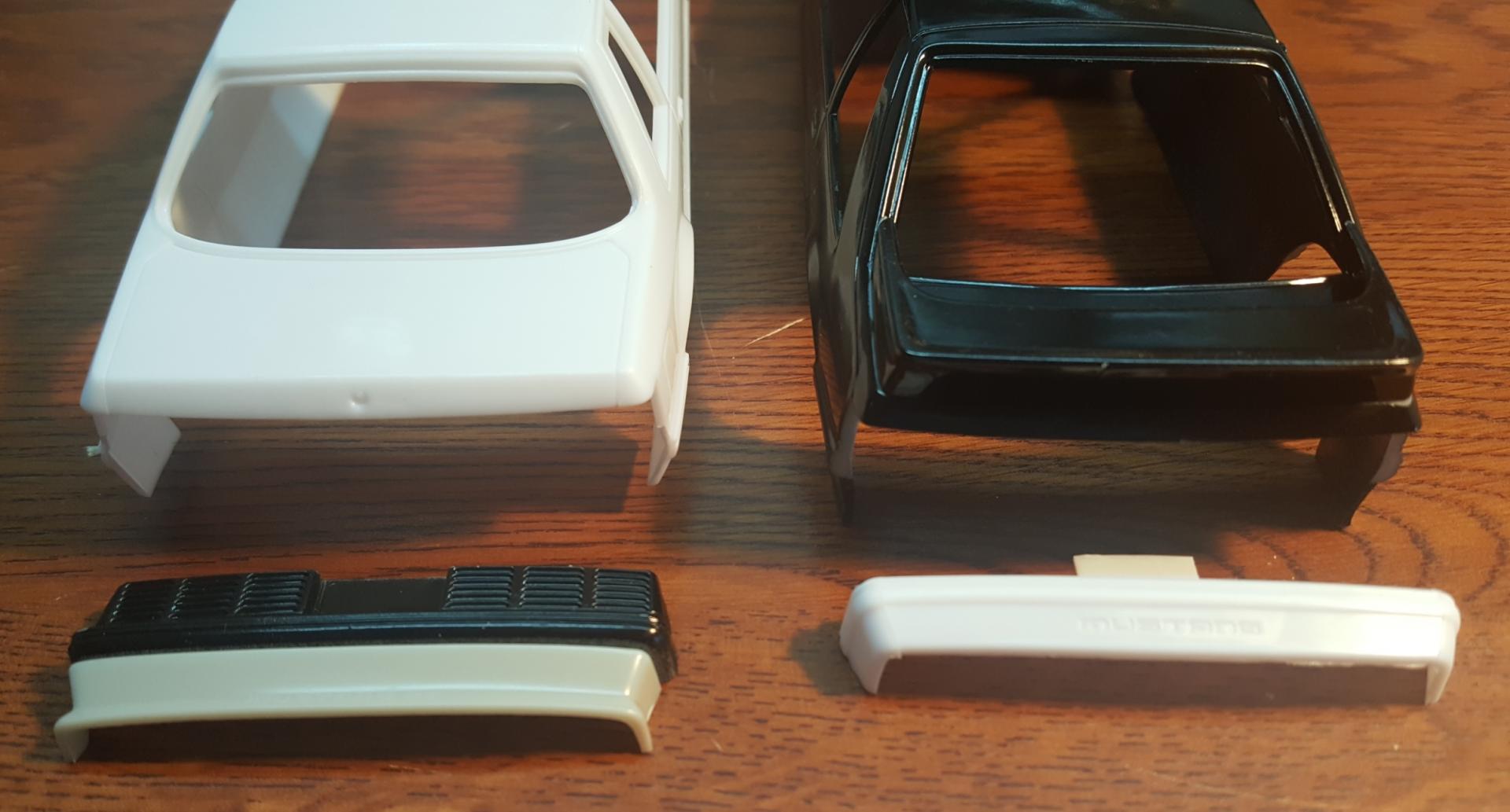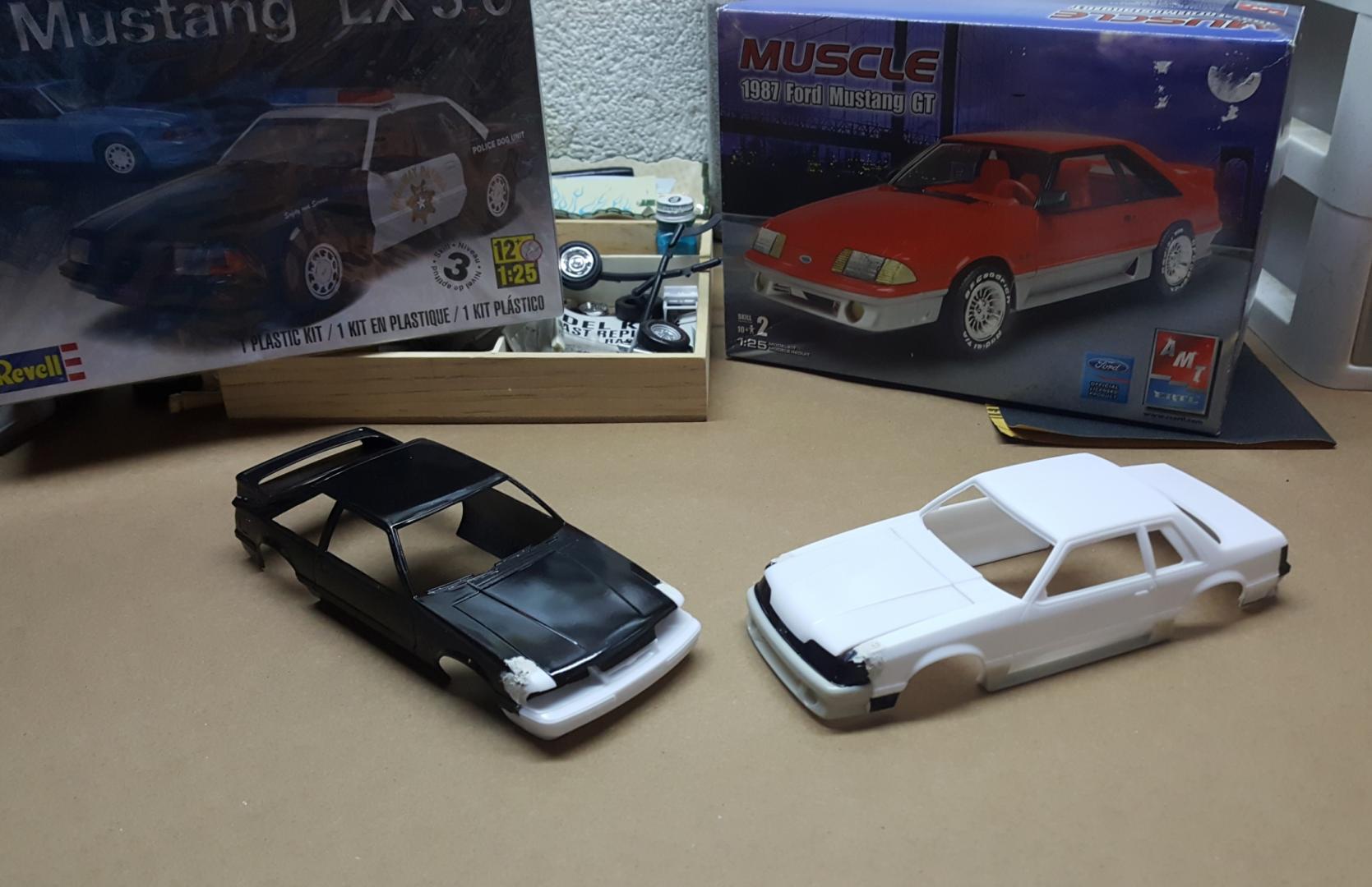Yes, even though both kits are 25th scale the Revell car is slightly bigger... I added the brace between the fenders on the hatchback to push them out for a closer fit. Then I assembled the front ends to the bodies with welders glue. Next I'll be adding filler to merge the panels so they are a closer fit. Probably won't be 100% but... meh. Lol! I try not to take myself to serious. or I'd never finish anything. On the notch car I was unable to get the smaller GT parts to fit closer so I just "bonked" them onto the body. I'm hoping with a little filler work it'll look better. I'm thinking I may have a spawn for a resin project if there is a need for a Foxbody GT Notch. They look pretty tough I think.