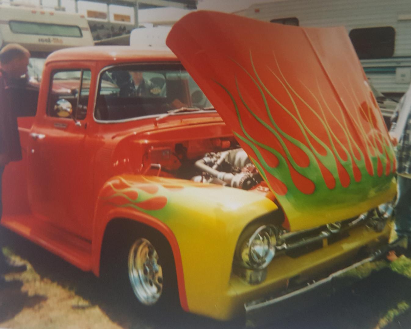 This truck was at Carlisle Pa. in 2000 and it was the first ford powered F series truck that I had ever seen. That's why I was so drawn to it. I live in Va. and when I would see them at shows they all were SBC. This guy in my town had a real nice 56 called the "California Raisin". Purple with the Cartoon Raisins painted on it. lots of billet aluminum on a chevy 383.. Show winner! I'm not a purist I'll take any combination. But it's nice to see Ford power in a ford. These days it's not as uncommon to see Ford engines in them. I guess swap kits have been invented making it easier to put a moderen ford V8 in a 50's ford truck. -