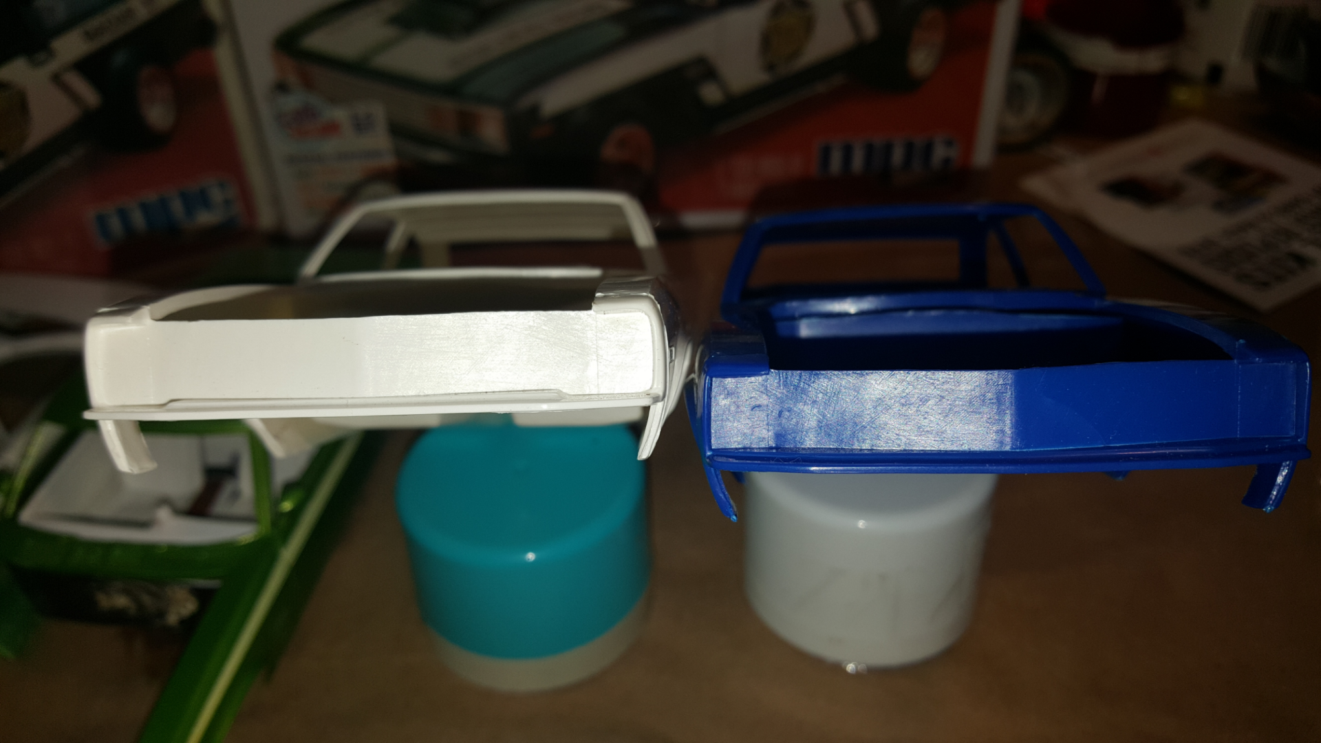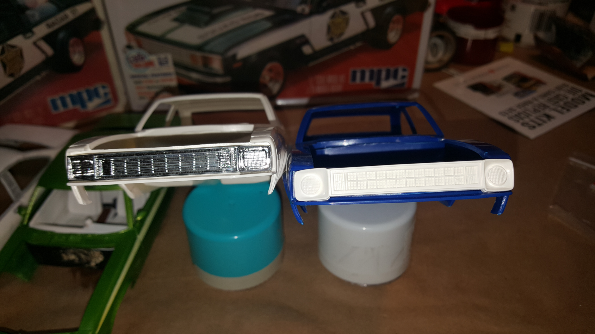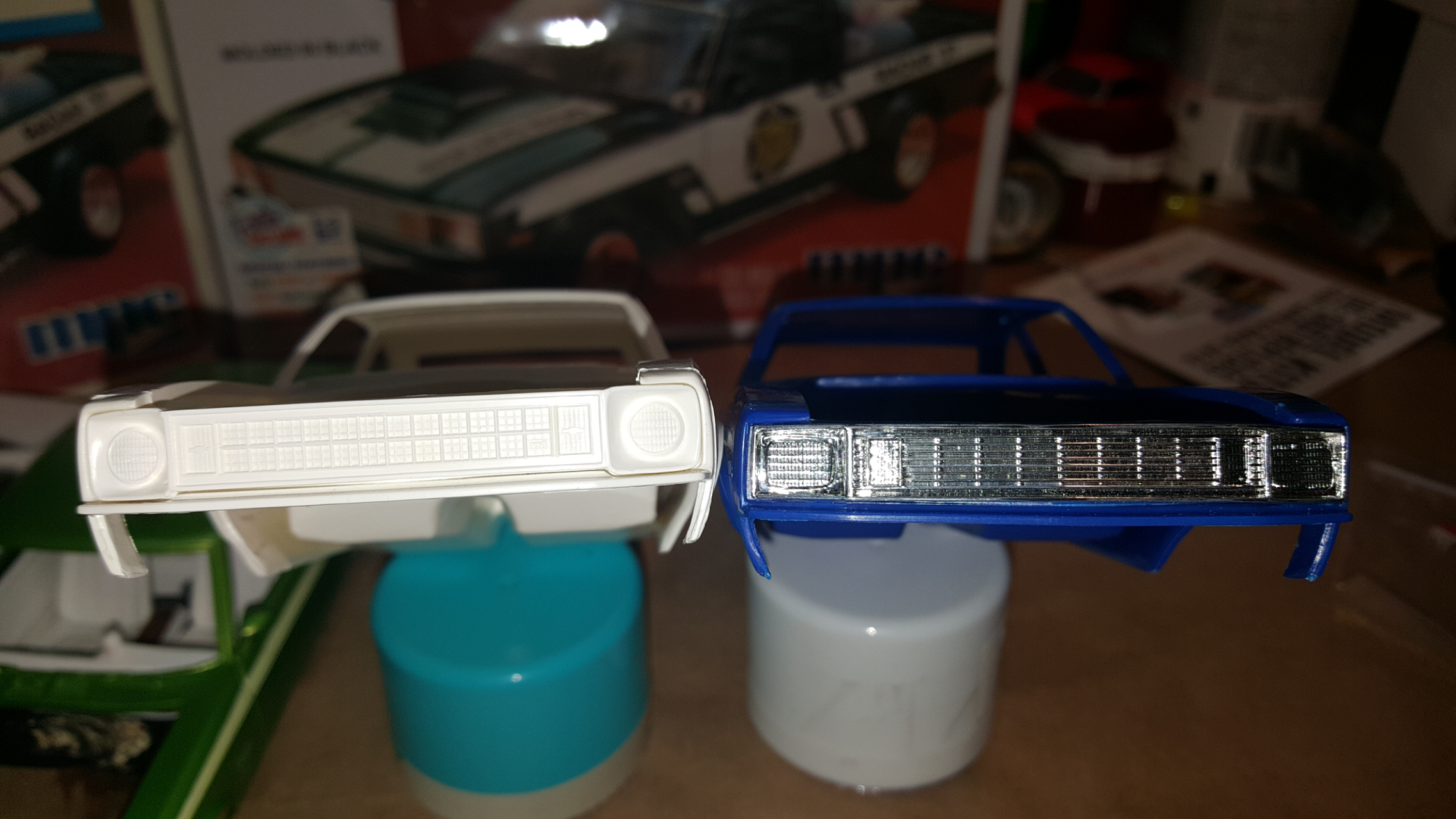 The difference between the 79 and 78 are minimal but I'll show the differences here. I have a fresh 79 body (blue) and a fresh 78 body (white). The 79 fender extensions are square in the top corners and this prevents the 78 grill from working also the 79's bumper filler goes all the way across and the 78 is only raised in the middle allowing the headlight buckets to rest in the correct location. Corrections can be made to the 79 body to allow the 78 grill to fit by cutting the center out and seperating the bumper filler panel away from the body. Not an issue. Some filler putty can be applyed for the turn on the 78 fender extensions. Hopefully you can see the differences in my pictures. I have a front end from the 78 that I would sacrifice for the sake of making a seperate frontend to glue onto the 79 body. Please don't think that I'm nit-picking the project I am your #1 fan.. I love what your doing here and I'm happy that it's going so well. THANK YOU FOR MAKING IT HAPPEN.