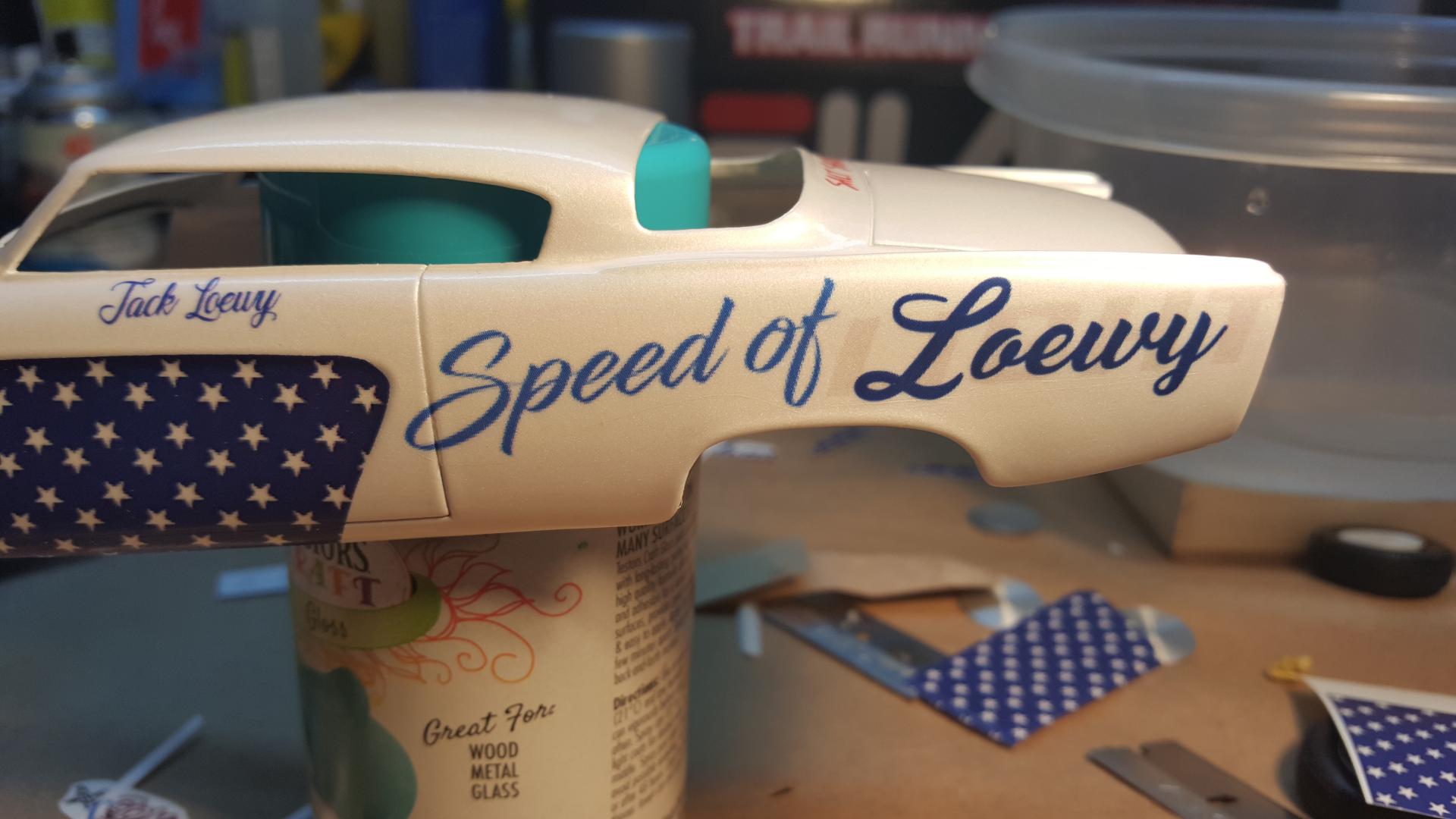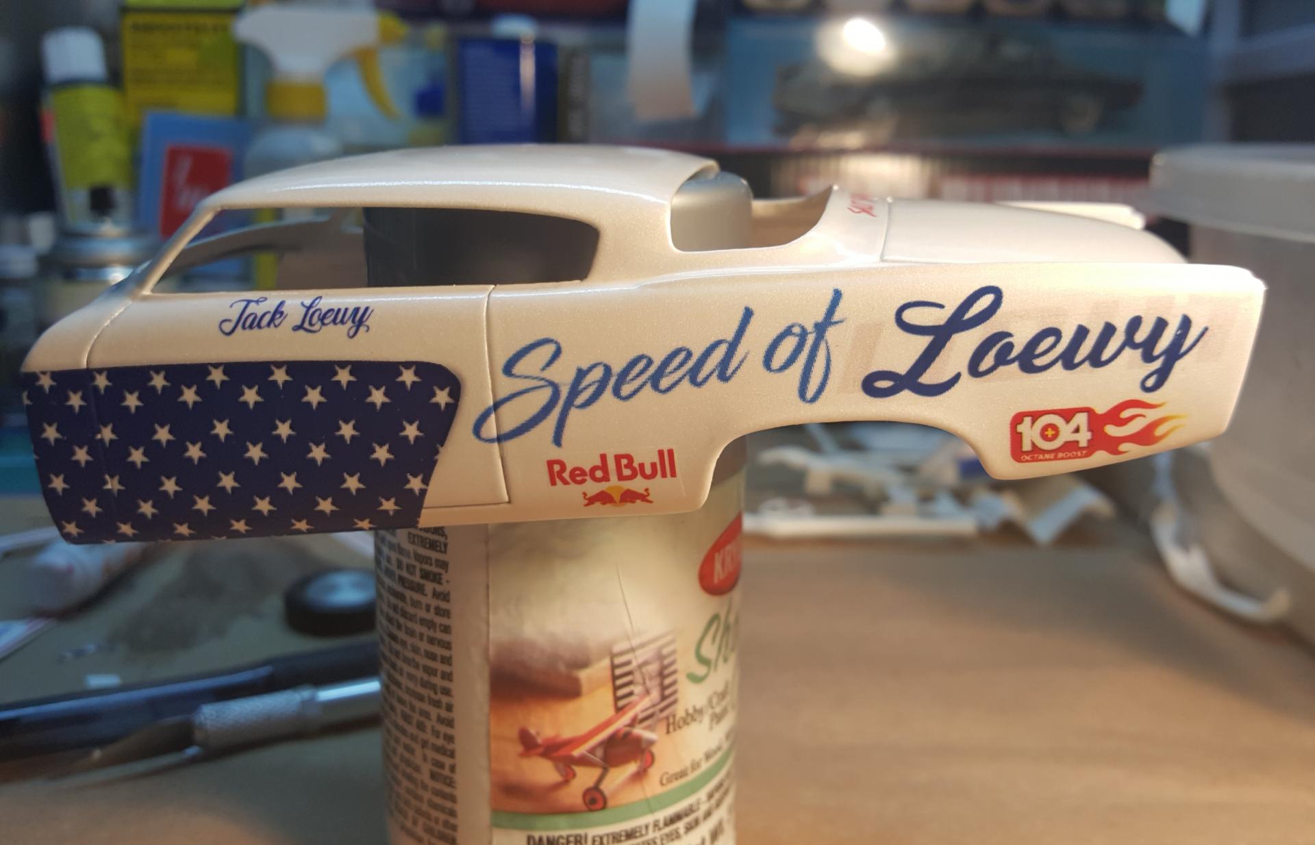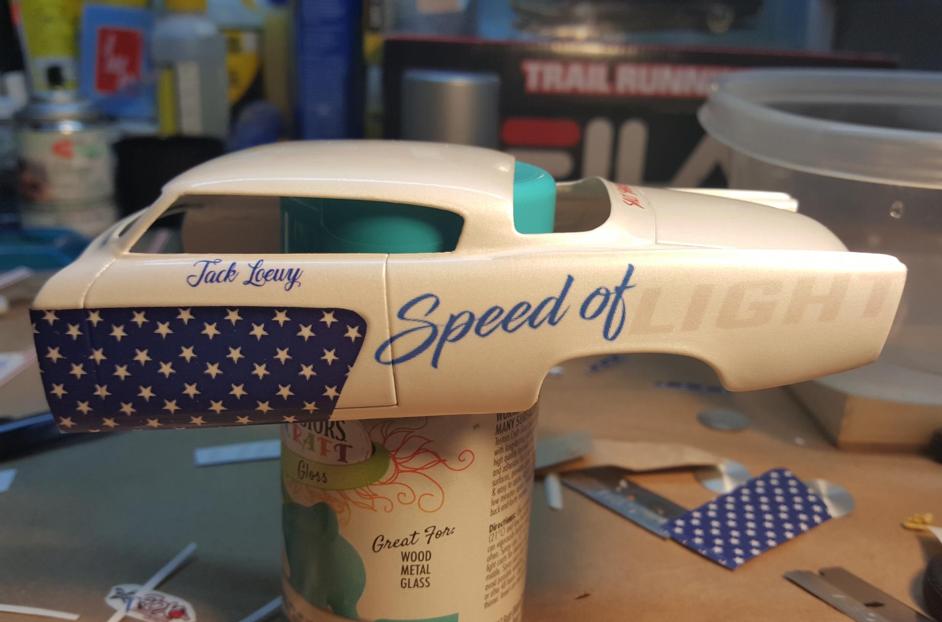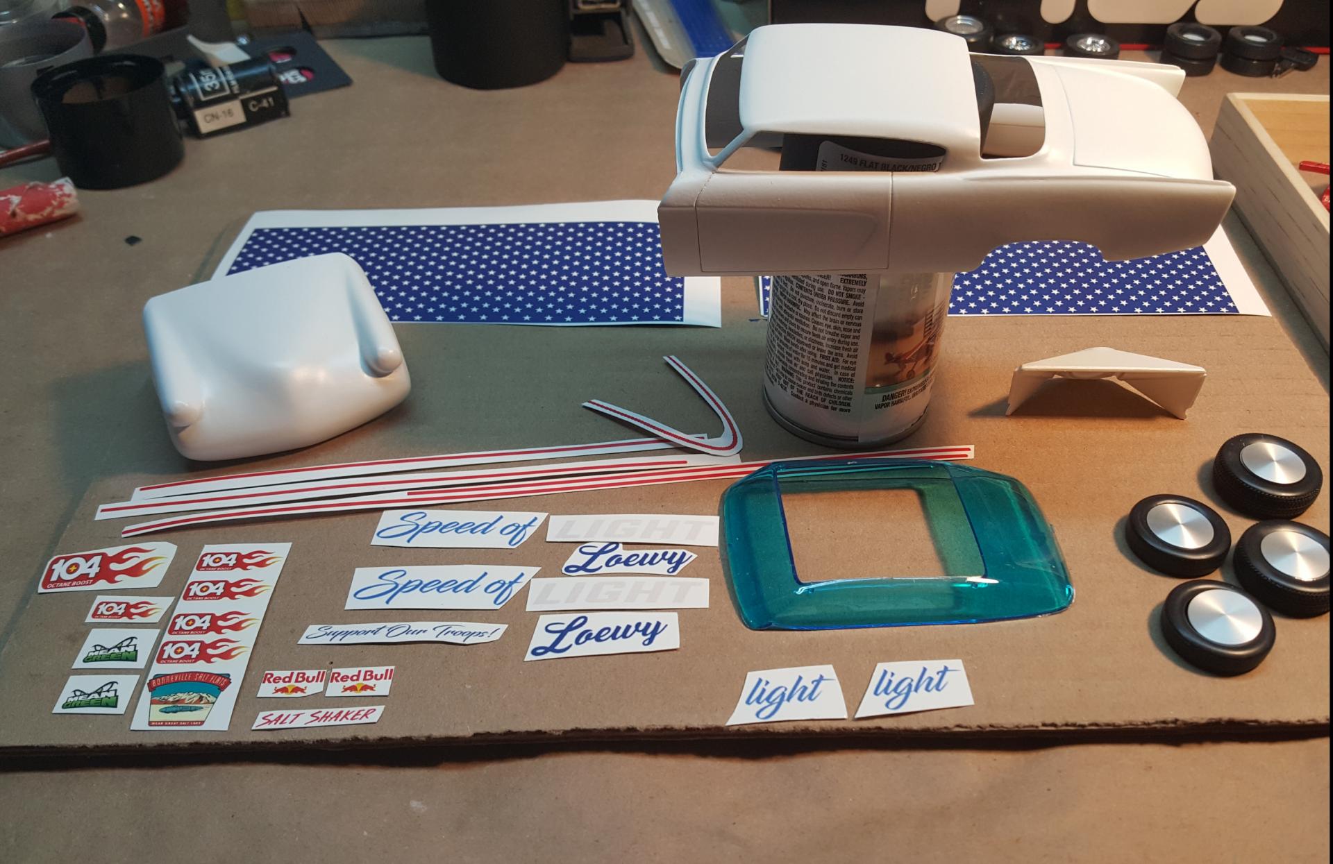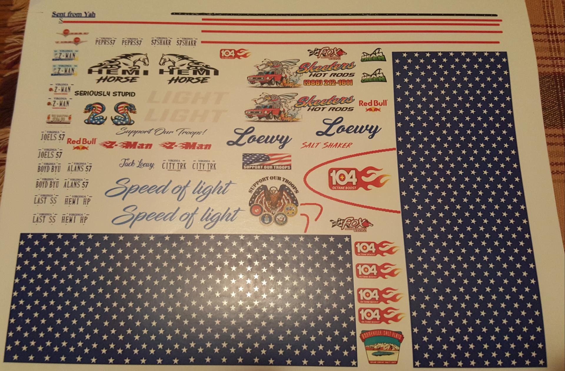 3. A sneek peek at what decals are going on the car "Speed of Light" will be on the quarter panels as with a twist I desided to tie in the Loewy name... Raymond Loewy is famous for the 53 Studebaker. The car will officially be named "Speed of Loewy" however you will be able to see the Light behind the Loewy name... 104 Octane booster was the only sponsor on the original build so I desided to add it to the Sponsorship on the build agian. The car is gonna be a phantom racer as if Raymond Loewy's Grandson would've became a Bonneville salt flats driver. Loewy's only daughter (Laurence) had a son she named Jacque so I gave the driver the name Jack, "Jack Loewy" as the driver on the door. Here is a pic of the decals separated from the sheet, The car will be white with stars on top and sides with the red stripes around them, it's gonna be USA themed. Thanks for looking...