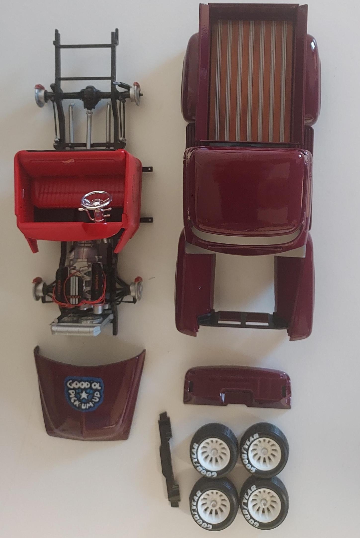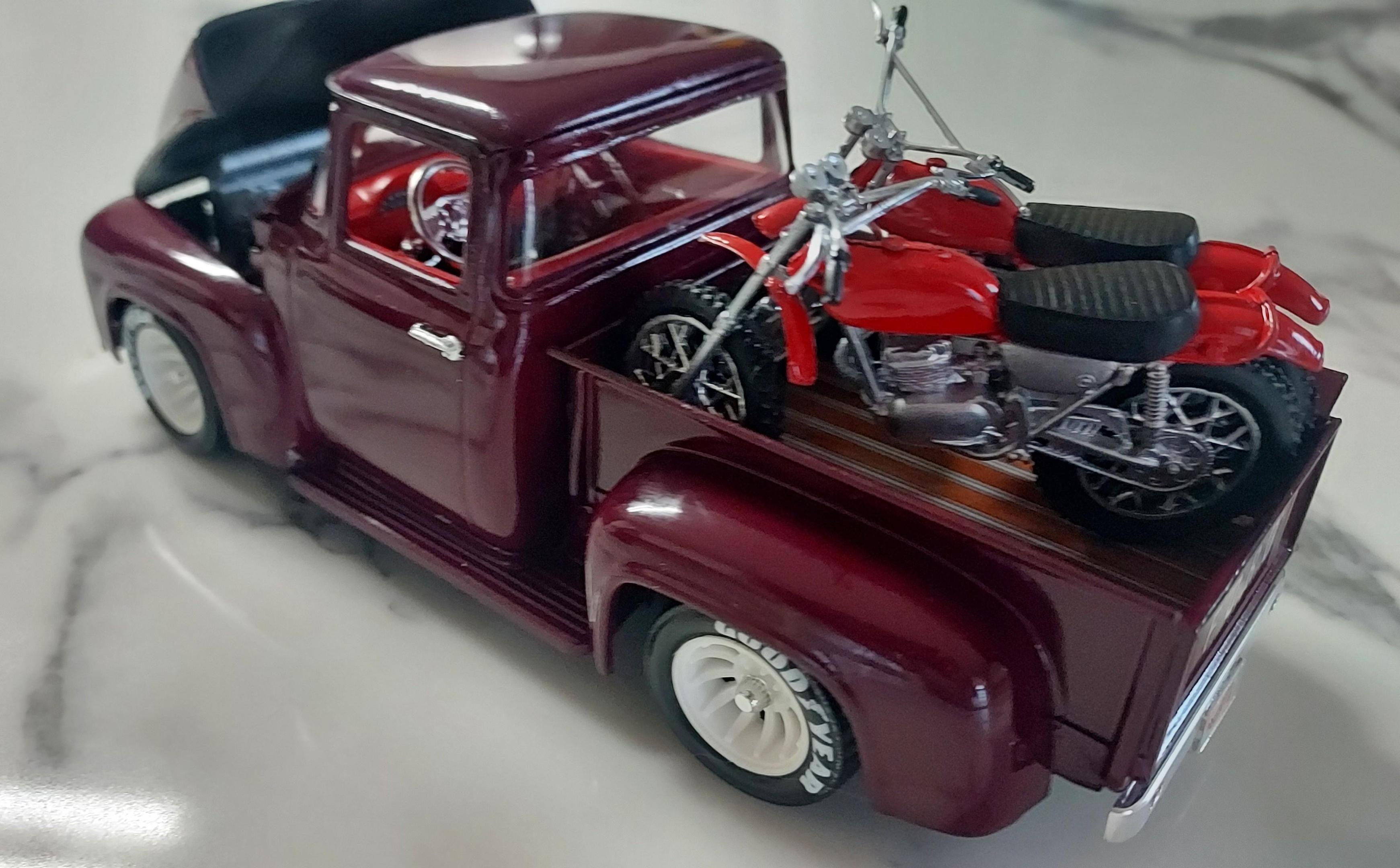 This Build is a Tribute to the Hi-Tail Hauler SE Real Riders "Good'ol Pic Um Up" released by Hot Wheels in 1985. I started with the Foose Ford, I De-Foosed it as much as possible, shaved the embossed Foose Logo off the Tailgate, added F O R D letter decals. The wheels and tires are from the Monogram Chevy Luv. I used 4 back wheels and tires stripped the chrome and added center caps from the Monogram 53 Chevy Belair... Signature Real Riders Good year decals came from an AMT Nascar. The Color is Candy Scarlett under 3 coats of Wet look clear. I added the "Good Ol Pick Um Up" Hood decal to complete the tribute. The dirt bikes are from the AMT Parts Pack. Basically this is a Box Stock build with a few minor changes (wheels and tires and decals.) Thanks for looking and have a Good'Ol Day!??