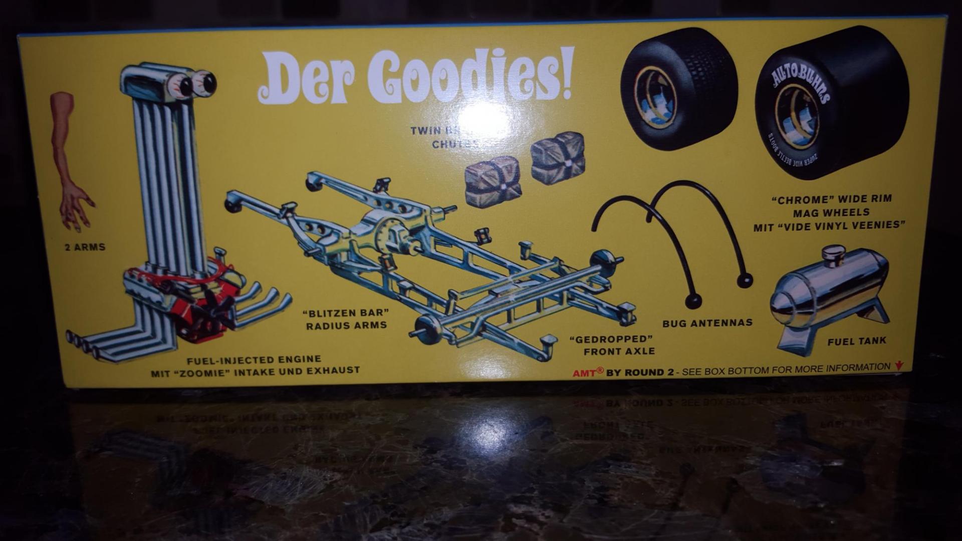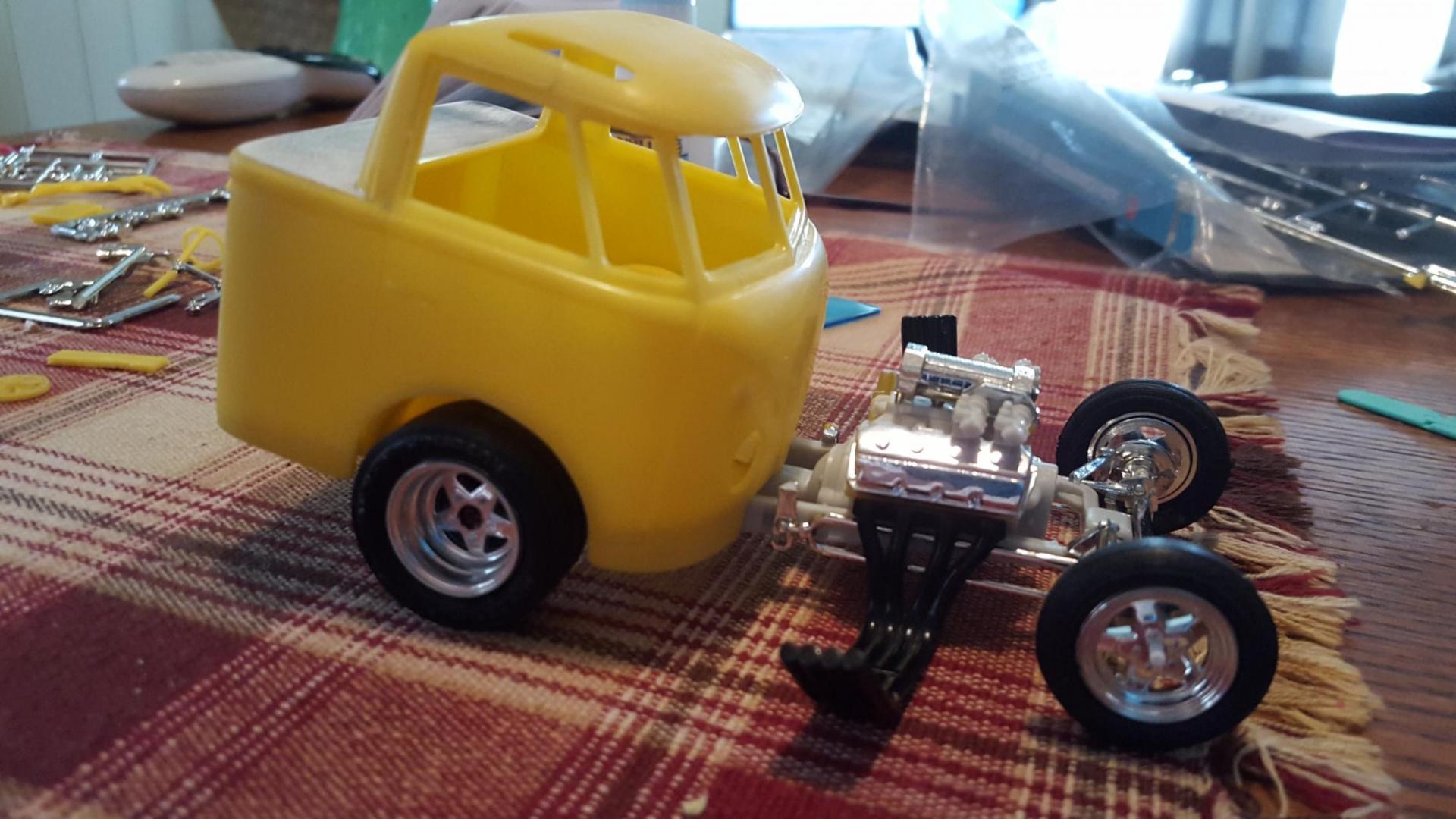 10. Well, I'm back from our monthly club meeting and I thought I'd share our next club challange theme. The Der Beetle Bus! Now for some of those who haven't seen this kit, I'll admit that I wasn't excited about it and had it not been for my buddy I probably wouldn't have thought twice about the model. That said, I'm glad he took a chance on this kit. The Der Beetle Bus is a reissue and has all kinds of cool parts inside even if you didn't build the kit you can use the parts for other projects especially if you like building Gassers or Street Freaks. I knew if I was going to build the kit it would have to be reimagined so I inlisted the help of a fellow club member to take on the design and mock-up. After 4 or 5 ideas this is where it begins. On a side note the other ideas are being built as well. With this kit I believe the possibilities are many. A cab over dragster, a Gasser, a pick-up with separate bed or an elcamino of sorts with the cab attached to the bed, fill in the windows, chop the top or cut the top completely off. That's just some of the ideas mentioned. Just a cool little kit to chop up and do it your way. I'm Starting on this kit from the current state it is in now which has been severely chopped and kit bashed. I could use some imagination from some of you guys to help get it rolling. Any ideas will be considered and appreciated. Thanks alot in advance!