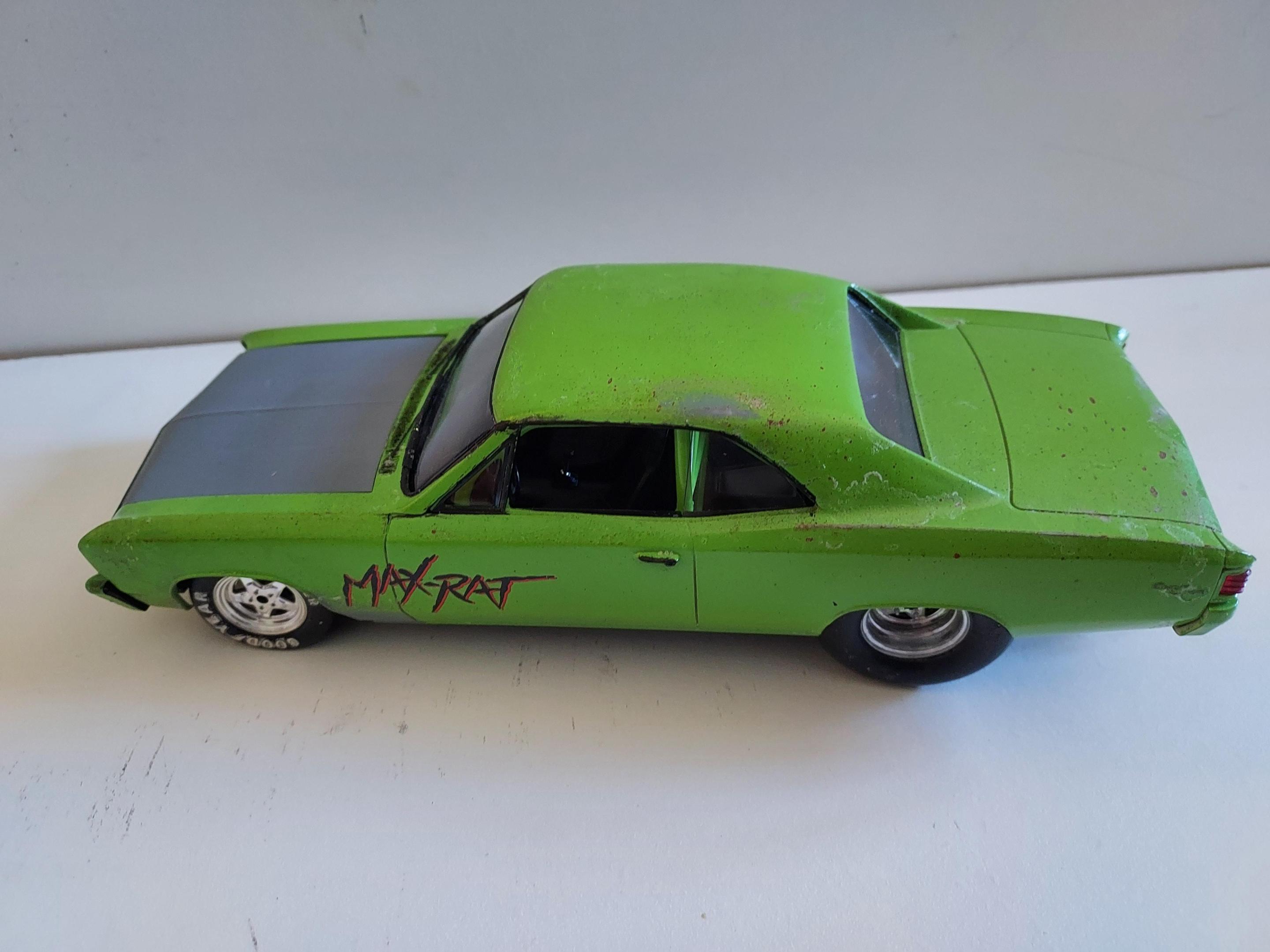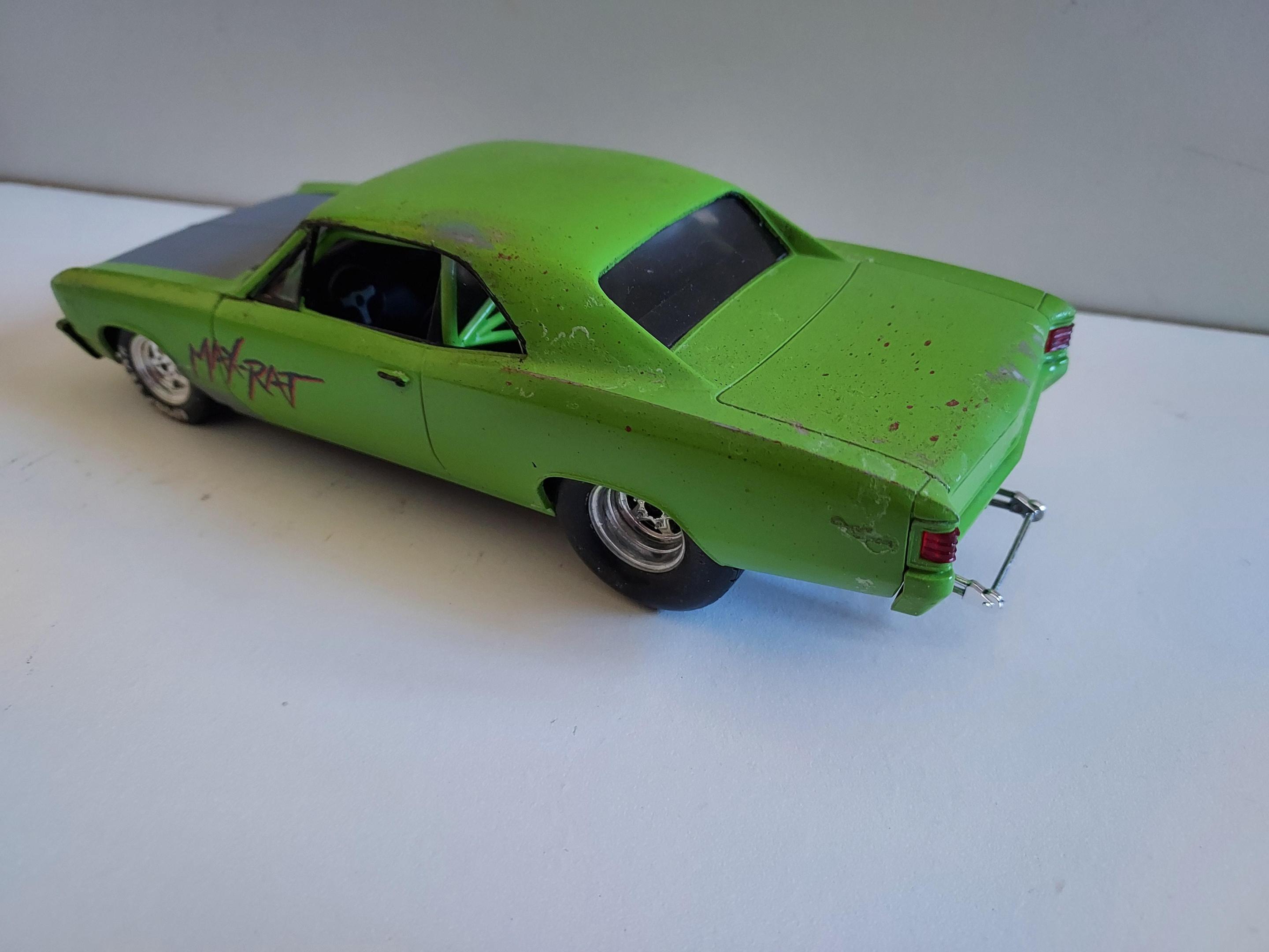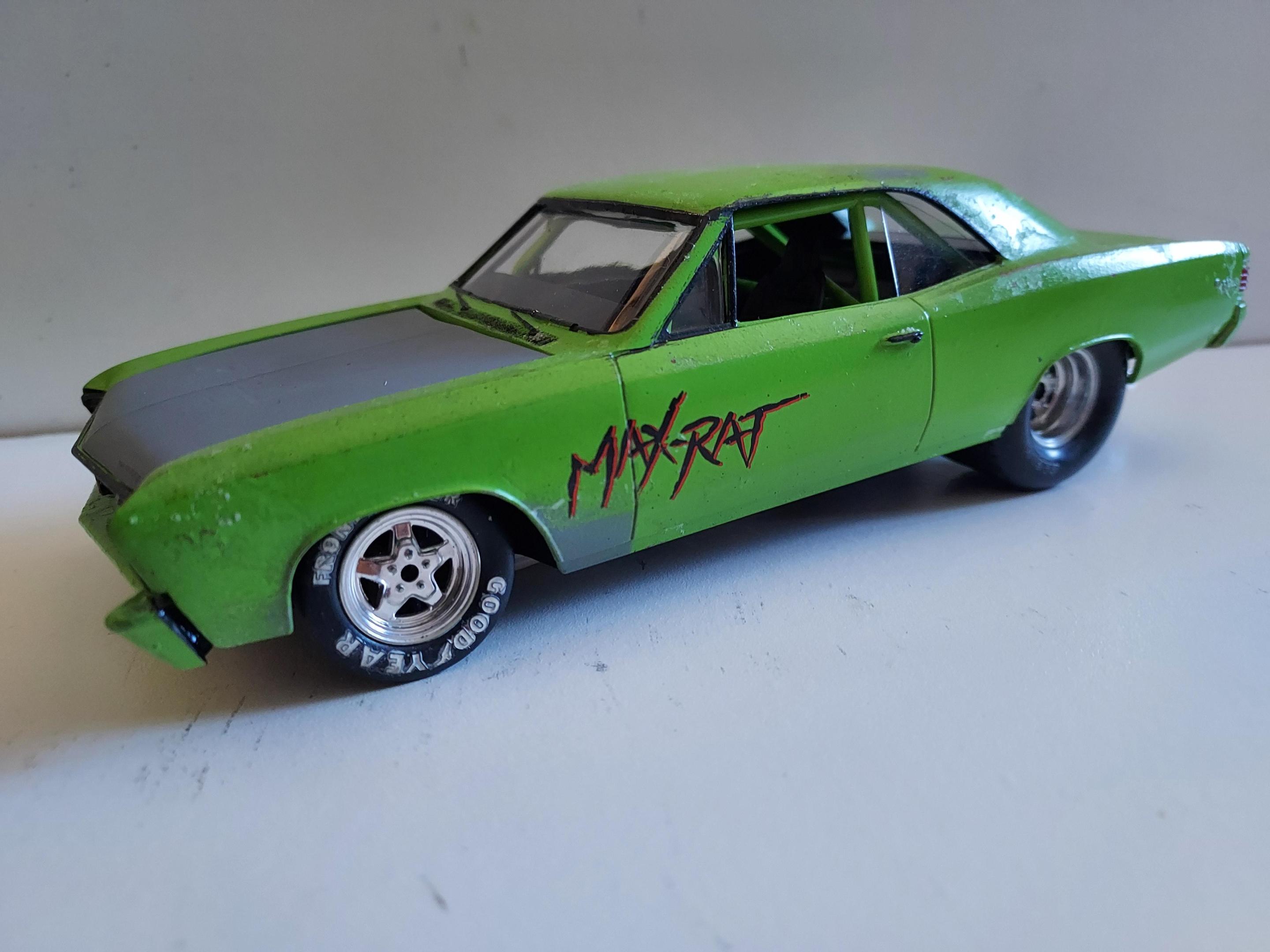I finished this AMT 67 Chevelle Pro-street as the familiar MaxRat Revell late 80's street machine. My vision was to build it as if it was kicked around and survived 30 some years of abuse. I'd imagined it changing hands several times and each new owner may have changed different things. The original hood was swapped for a stock hood because the Intake was changed to a single carb (for reliability) sometime in the late 90's. ??? Also the next owner liked Weld Pro Stars so gone are the Centerlines originally used in 1989. But after all it still remained with it's original Lime Green color scheme. A little primer here and there to repair rust bubbles perhaps. I got a feeling that one owner didn't care for the custom taillight assembly so he replaced it with the stock SS panel. The clearcoat is peeling, she's rough around the edges, a little dated, a tad worn out but she's a survivor! Thanks for looking and hearing my story ??