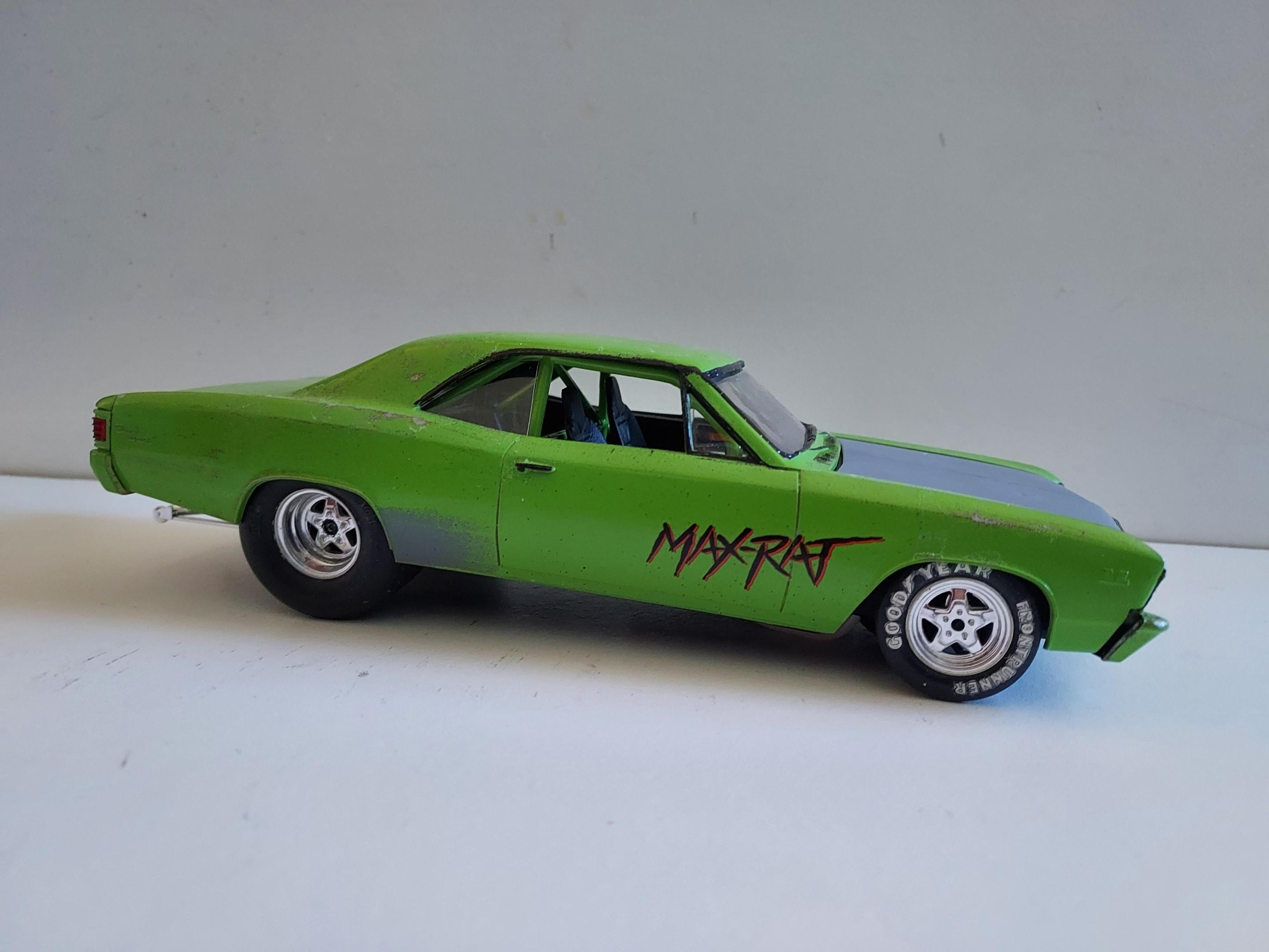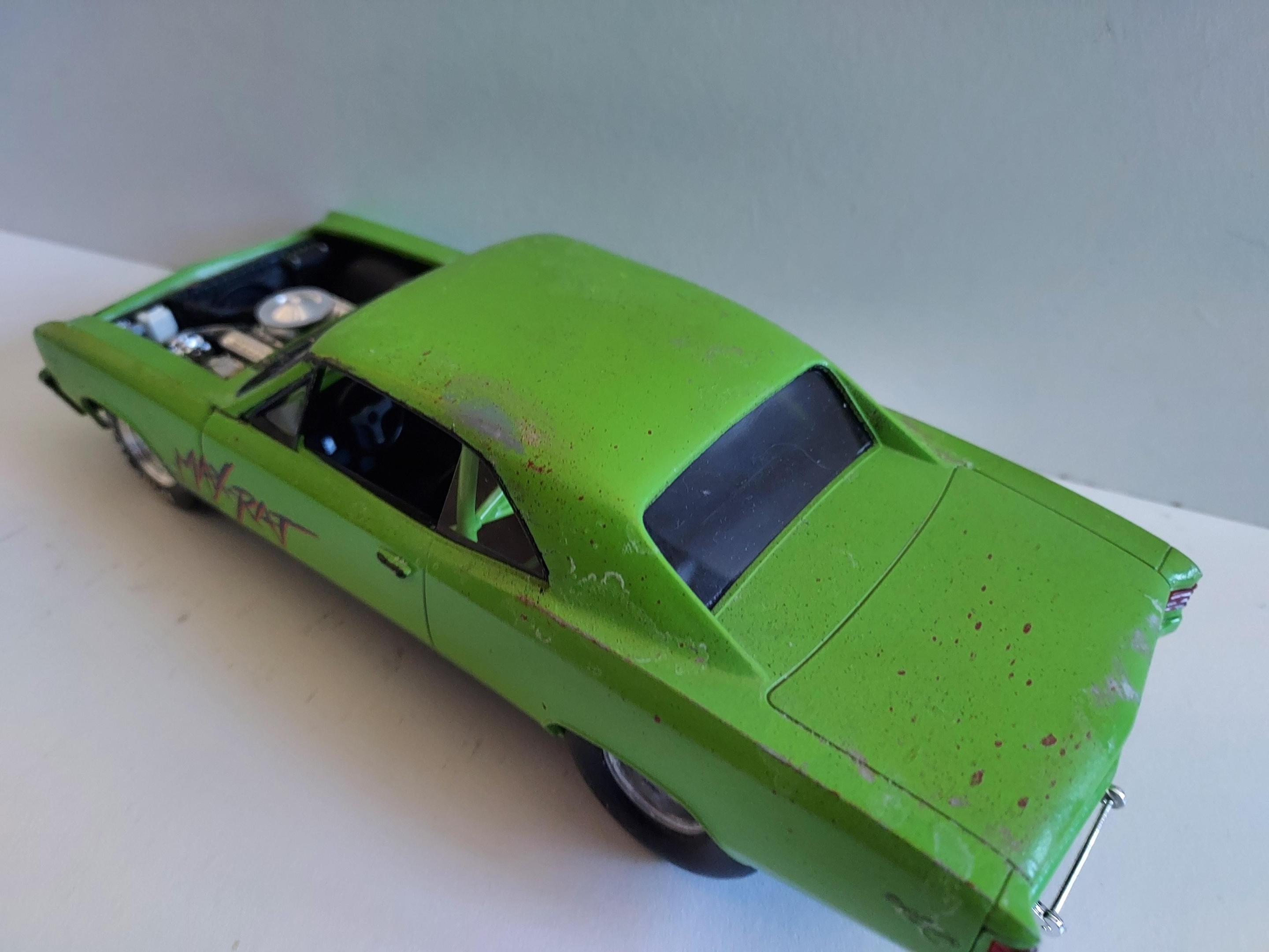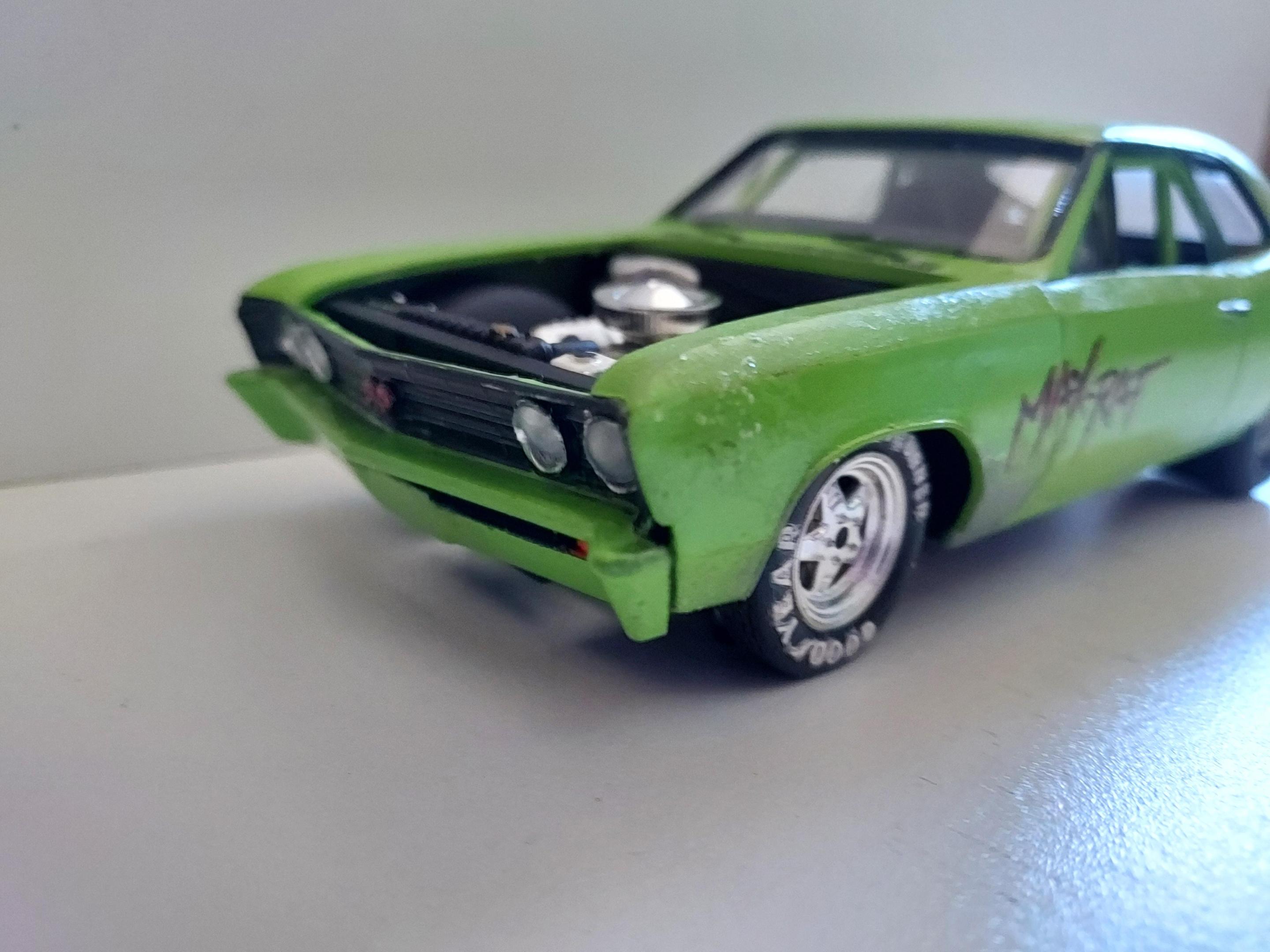 I finished this AMT 67 Chevelle Pro-street as the familiar MaxRat Revell late 80's street machine. My vision was to build it as if it was kicked around and survived 30 some years of abuse. I'd imagined it changing hands several times and each new owner may have changed different things. The original hood was swapped for a stock hood because the Intake was changed to a single carb (for reliability) sometime in the late 90's. ??? Also the next owner liked Weld Pro Stars so gone are the Centerlines originally used in 1989. But after all it still remained with it's original Lime Green color scheme. A little primer here and there to repair rust bubbles perhaps. I got a feeling that one owner didn't care for the custom taillight assembly so he replaced it with the stock SS panel. The clearcoat is peeling, she's rough around the edges, a little dated, a tad worn out but she's a survivor! Thanks for looking and hearing my story ??