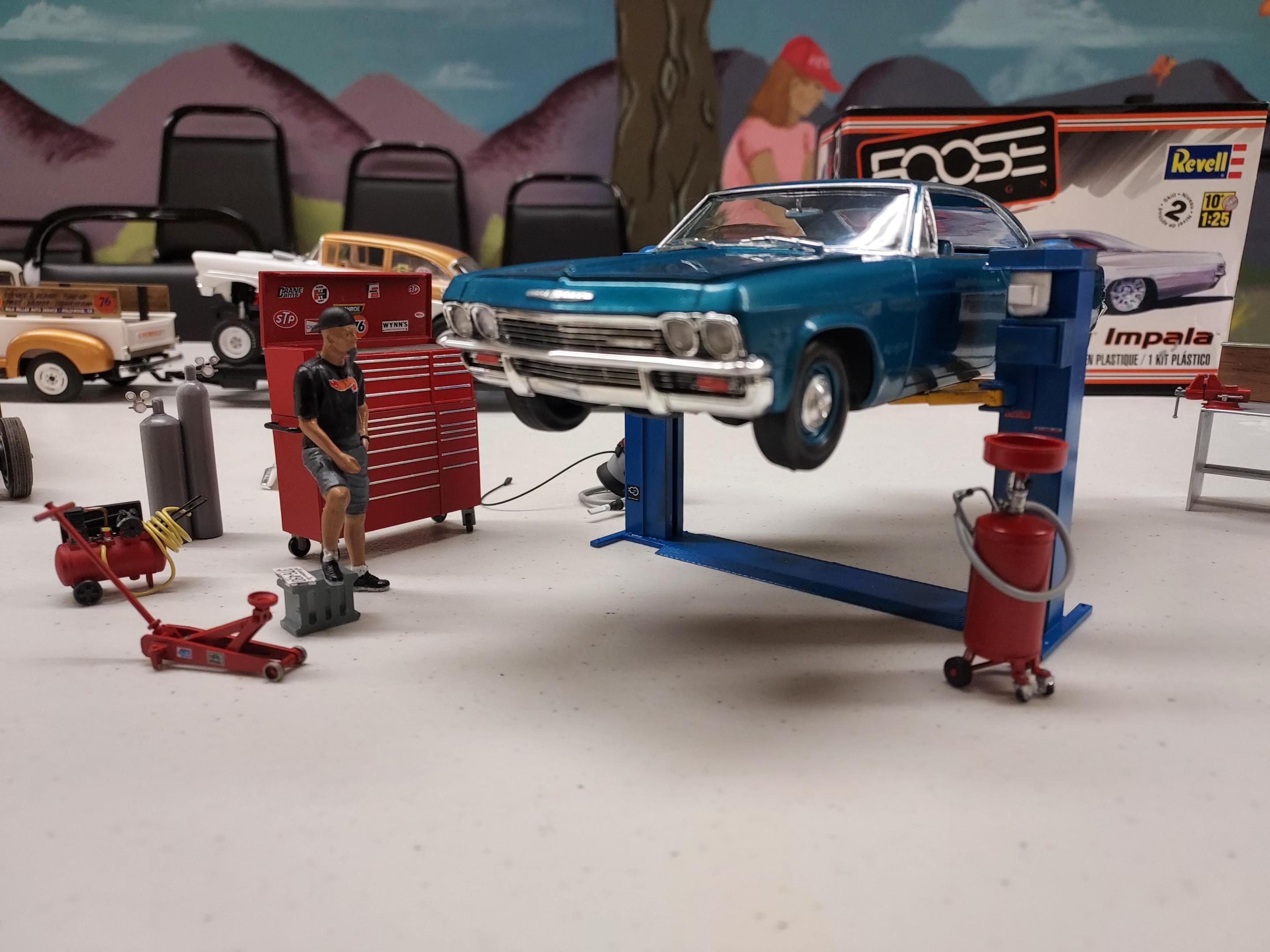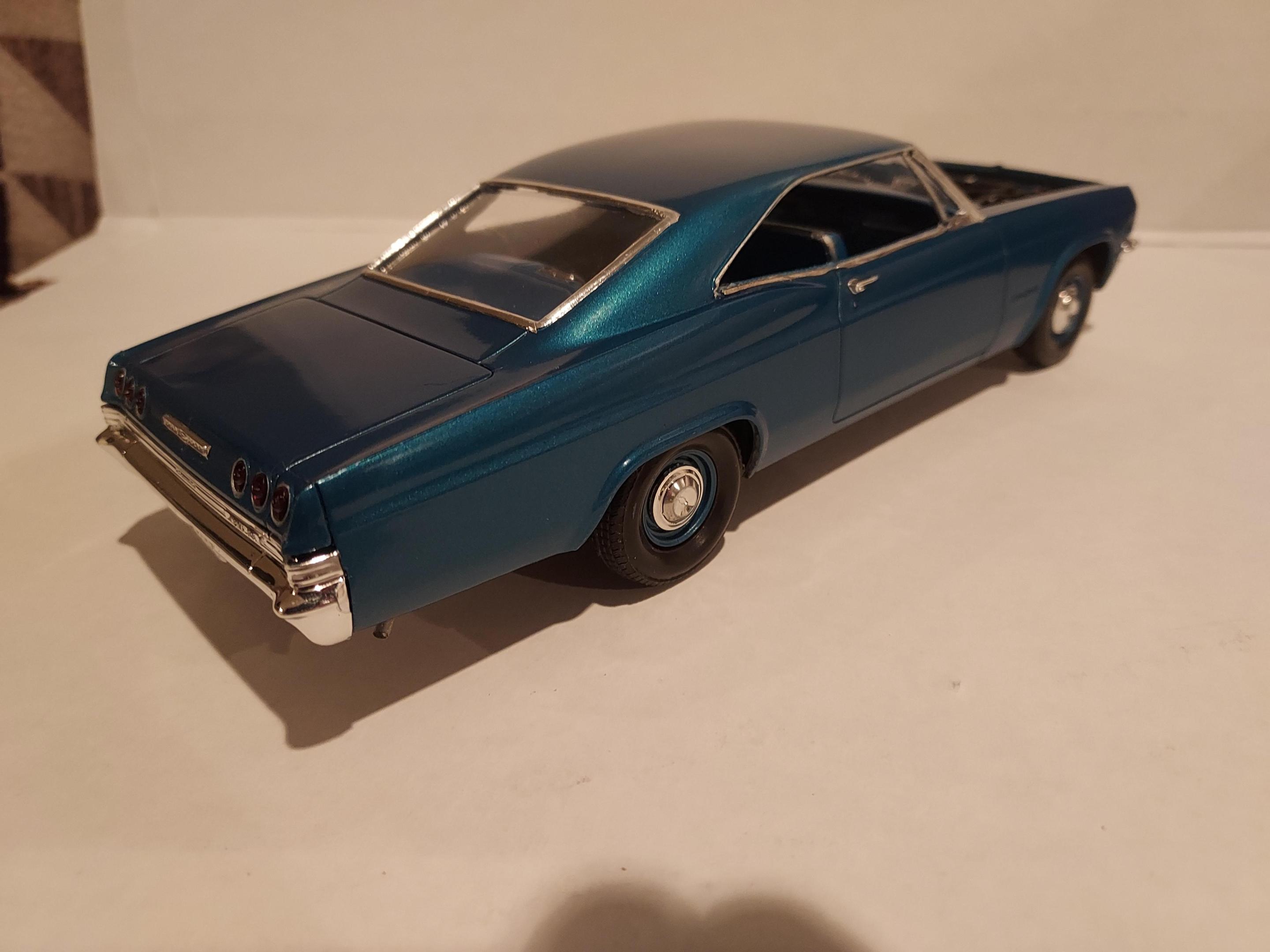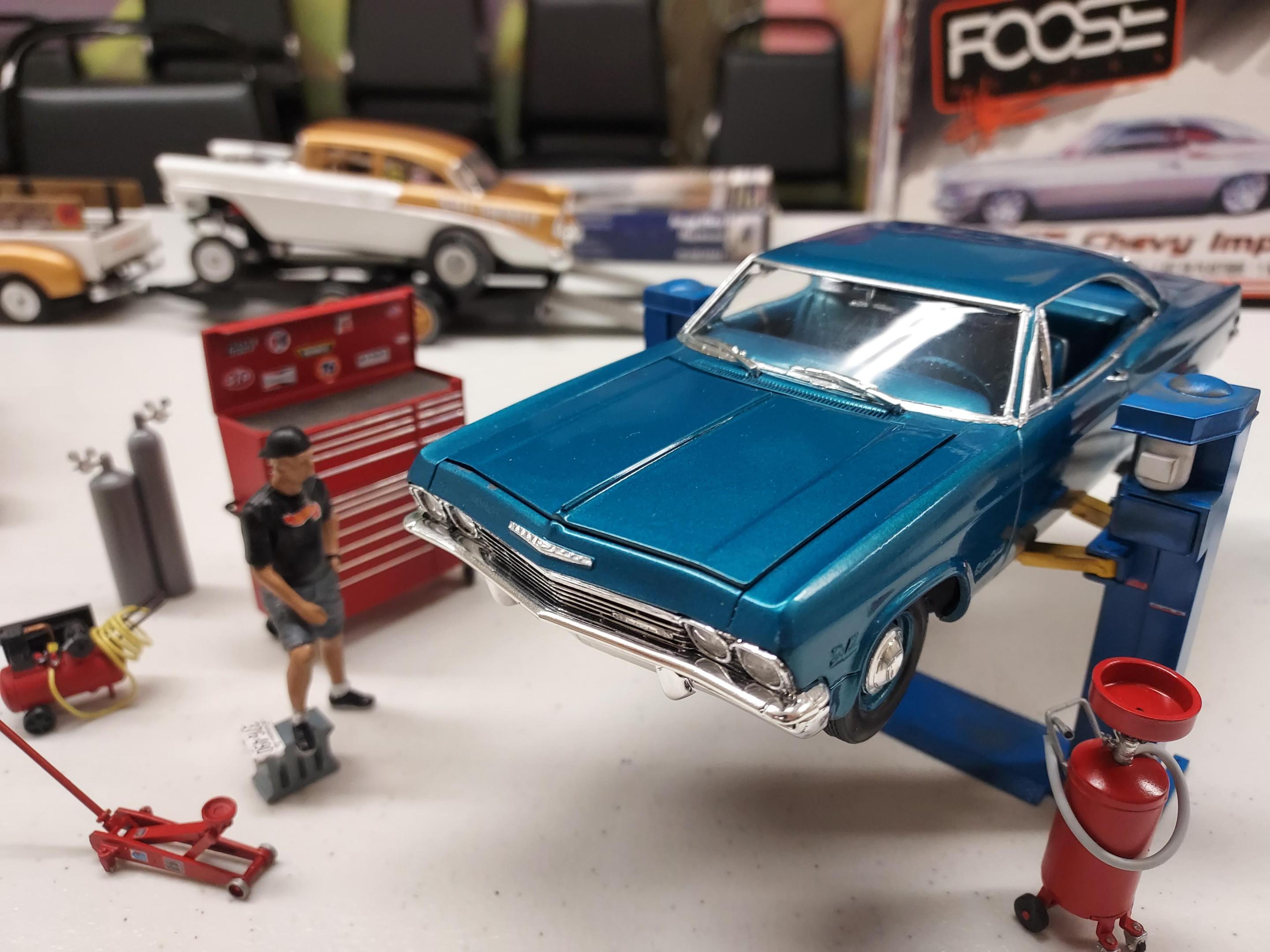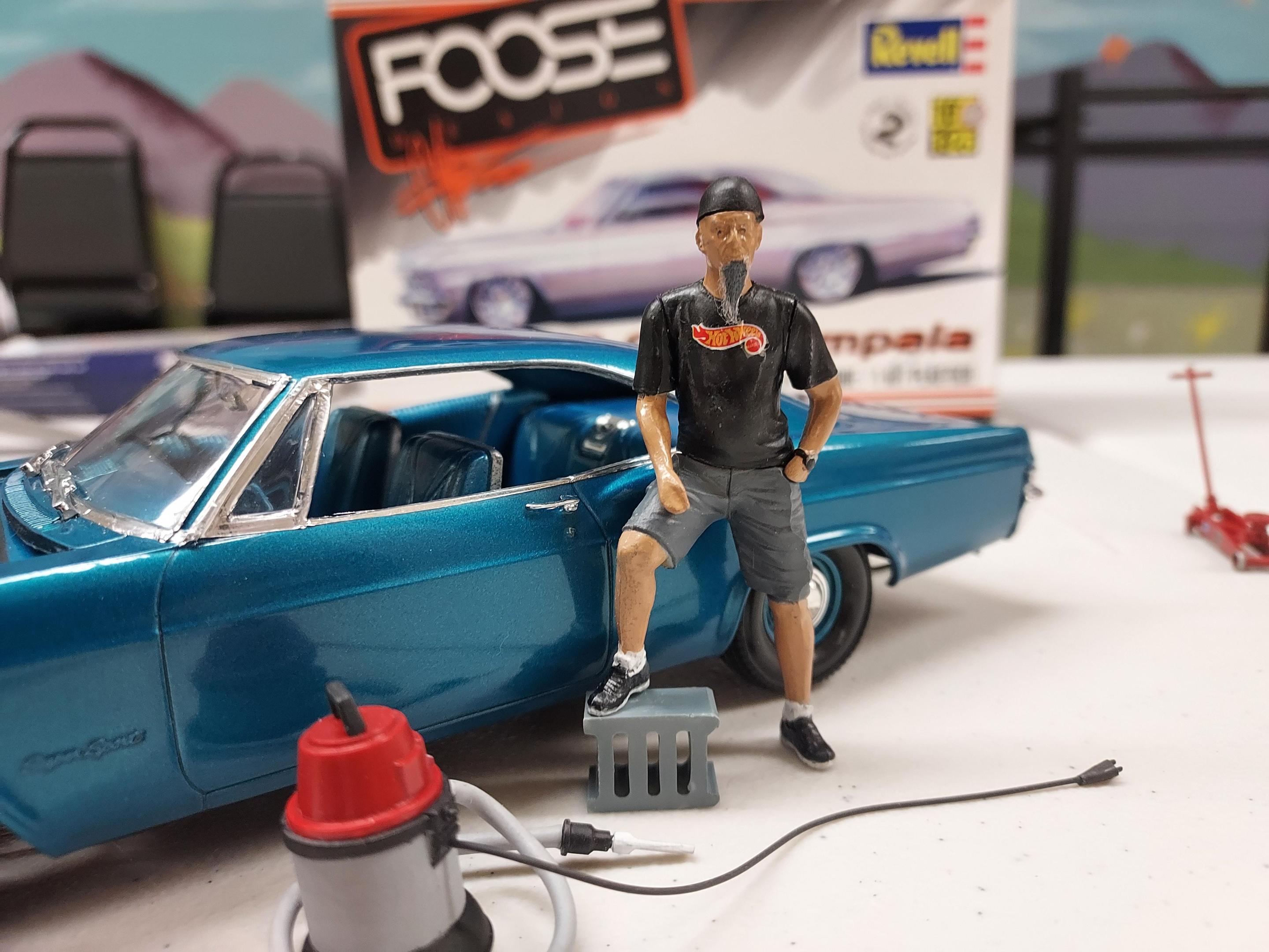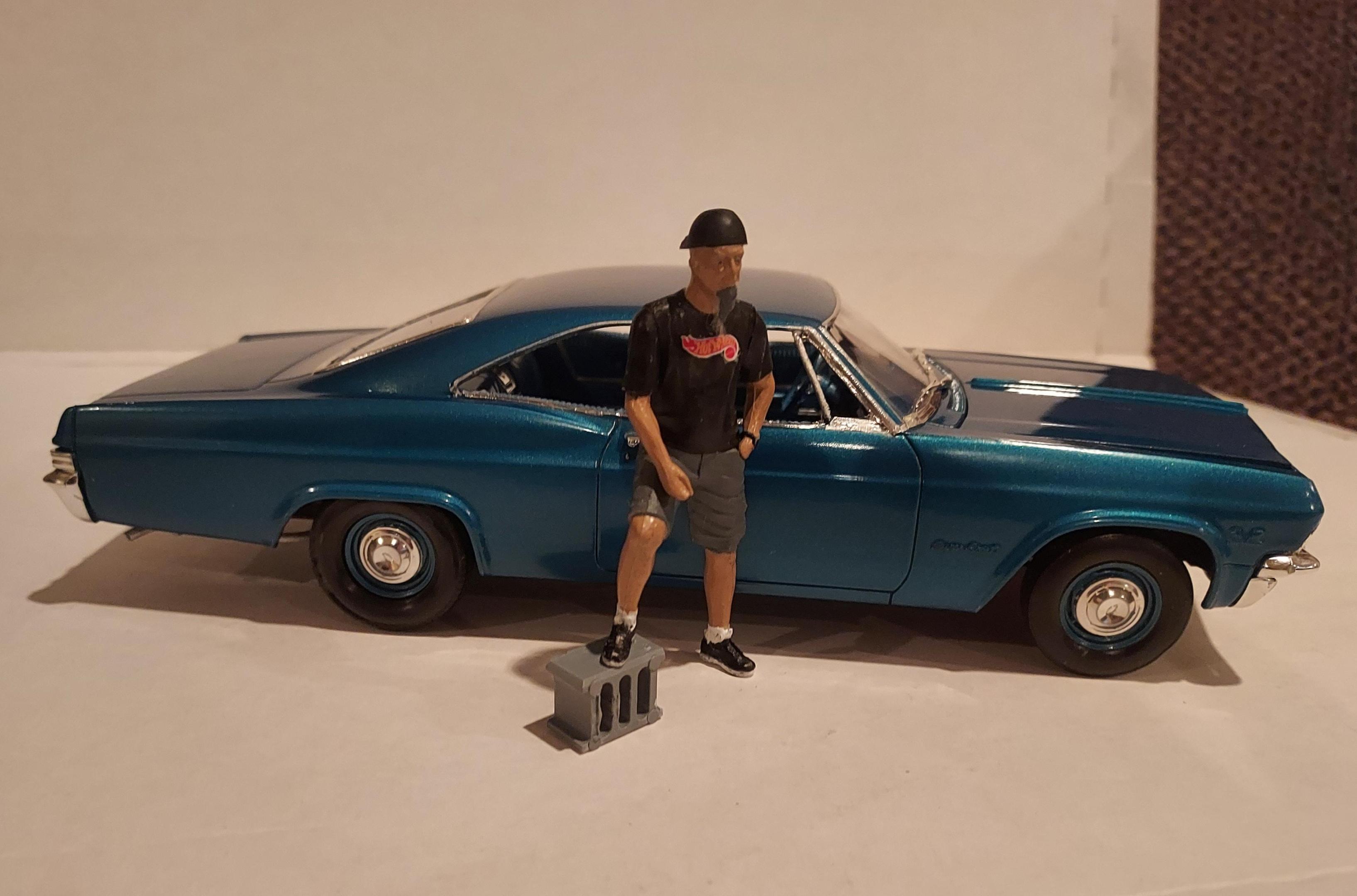 My local modelers club decided to Swap stalled builds, so I ended up with a fellow club member's 65 Impala. It was about 85% done and not really much of a challenge for me to get finished... I polished the paint added details to the engine and with final assembly it was finished. I had a "Jimmy" figure to paint which was an inside Joke in the club because the club member who owns the Impala is actually named Jimmy ? I normally can't paint figures but he turned out ok, I painted him to look like the real Jimmy...anyway, thanks for looking.