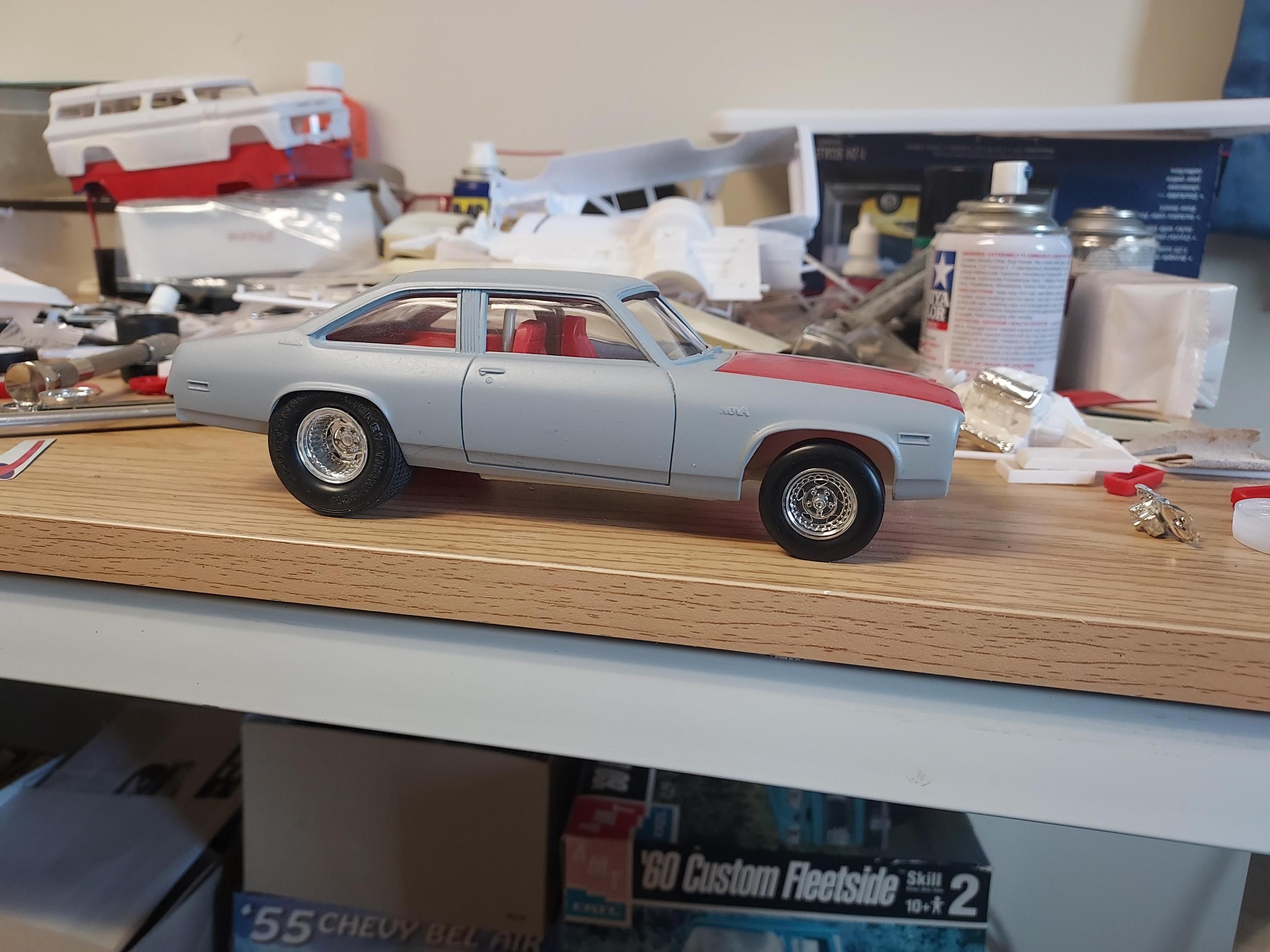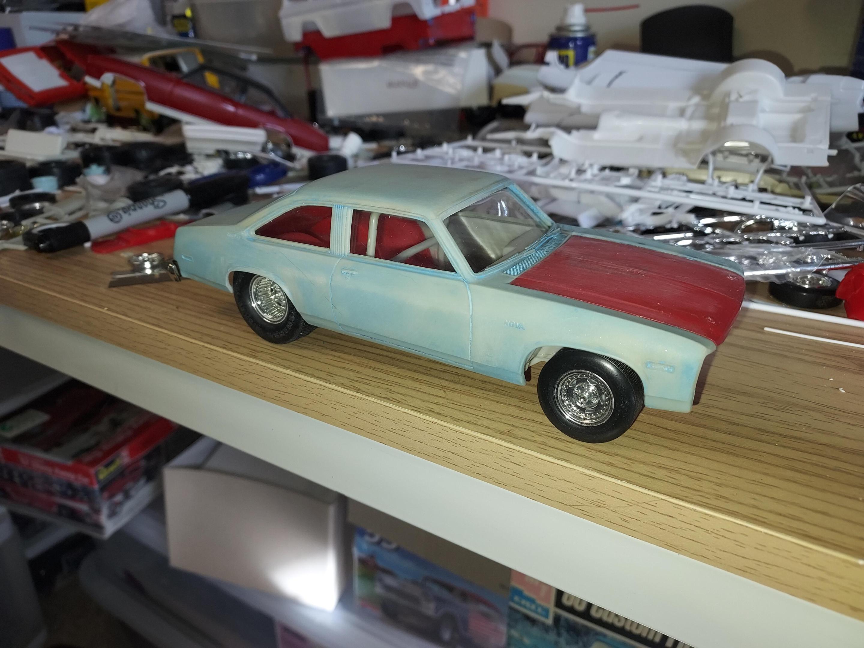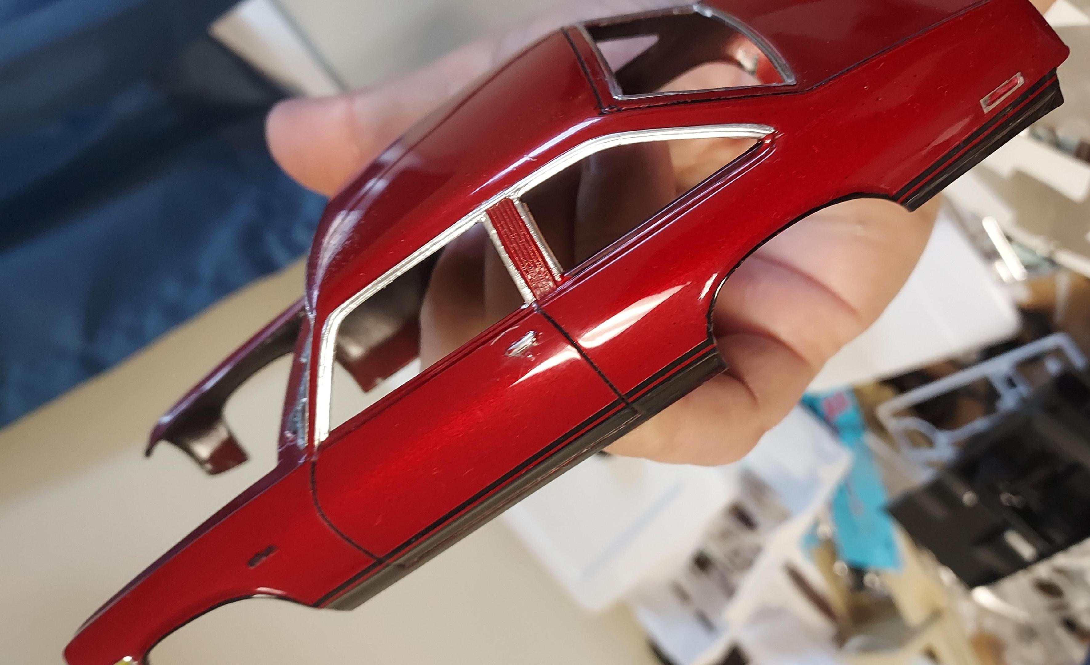 Dragged this out of my Disco Nova Junkyard this past Monday on a whim. It's been in my collection since they reissued it in the early 2000's... I got a case of these because of my love for the real car. This build will be from the leftovers from those kits. Although it's not my favorite kit, I'm gonna put together the best offering my skills will allow. ? Only things different from a box stock build will be wheels & tires, Intake & carb, and the shifter... so far ? I'm including pics of it along the way (last two pics) I've stripped and painted it 3 times now. This current paint job purely an accident as I couldn't decide on a color so I closed my eyes and pointed at my paint rack. I picked Testors Firey Orange... Wasn't really happy with fate's decision so I thought I'd add Tamiya Clear red over that to see what happened. Candy Apple goodness is the result. ? added some black SS stripes at the bottom to break up the Red. Thanks for following ? Oh and this will be a short build as I'm almost done with it. Sanded and polished it this morning, Friday Jan 13th.