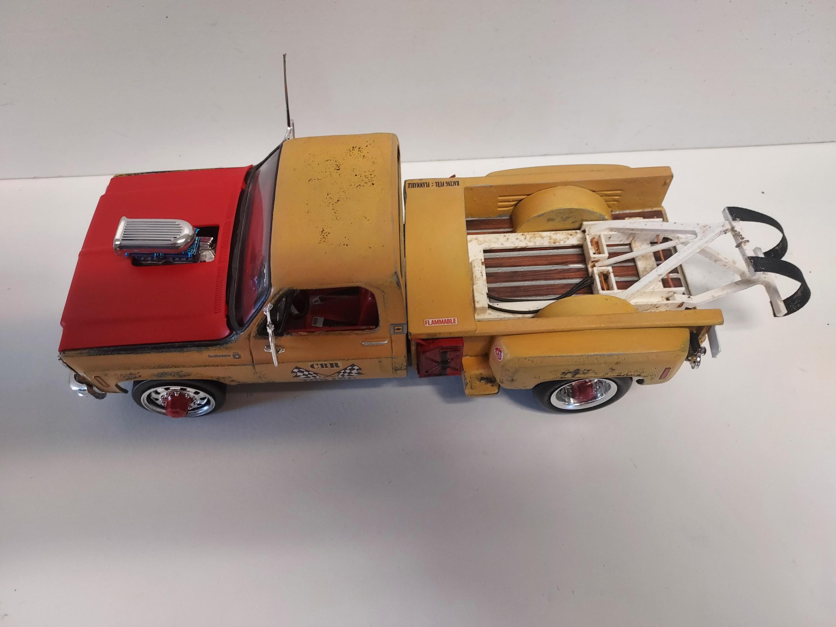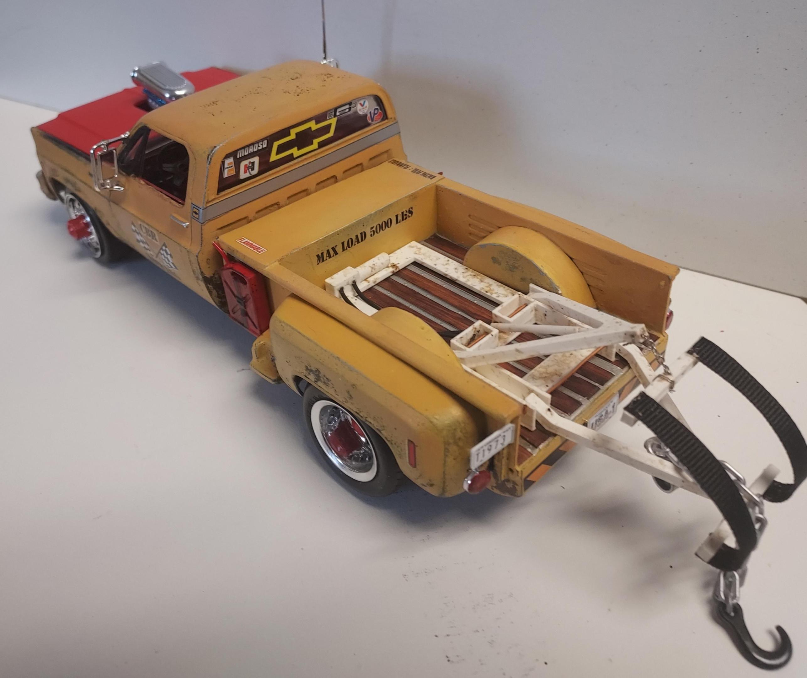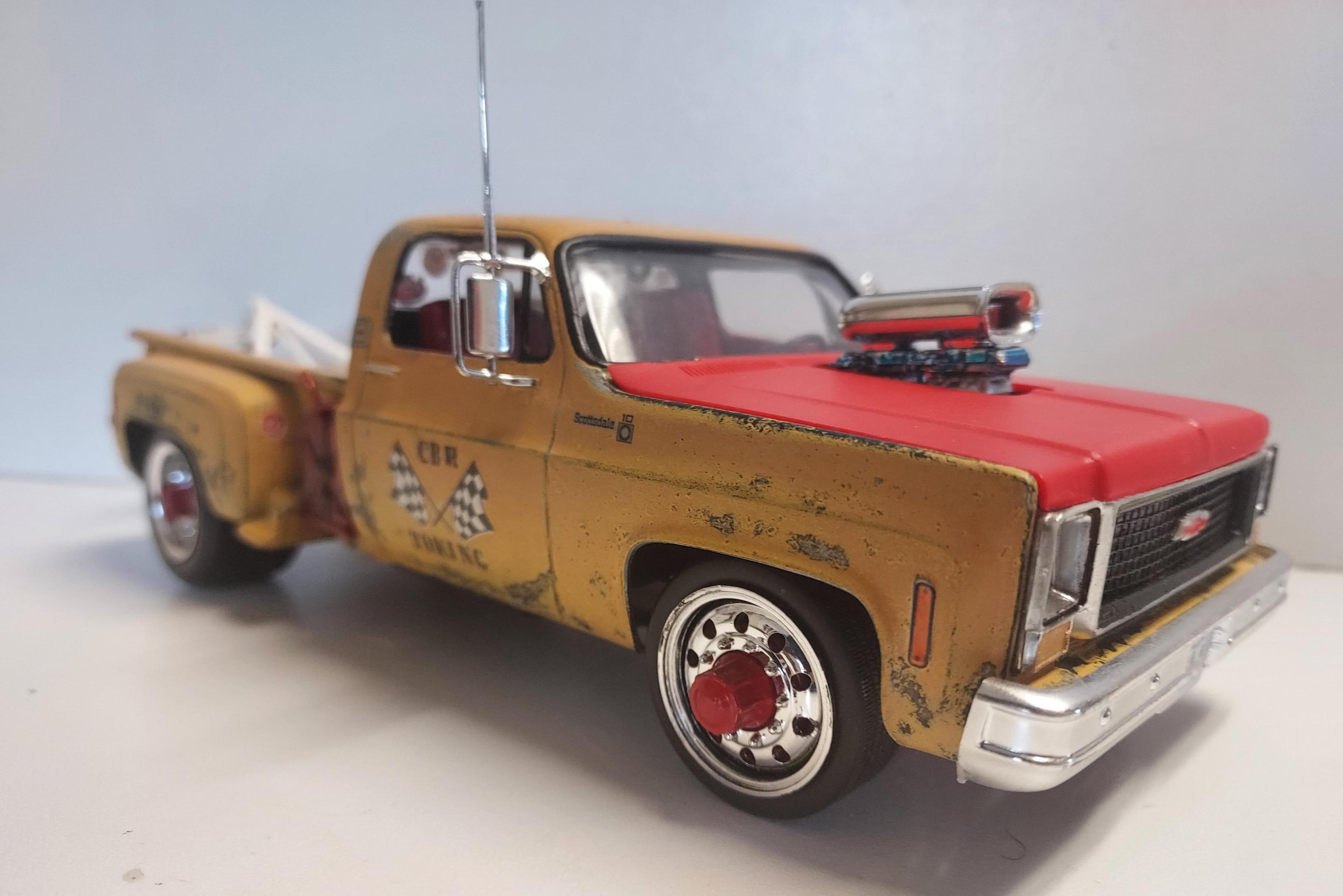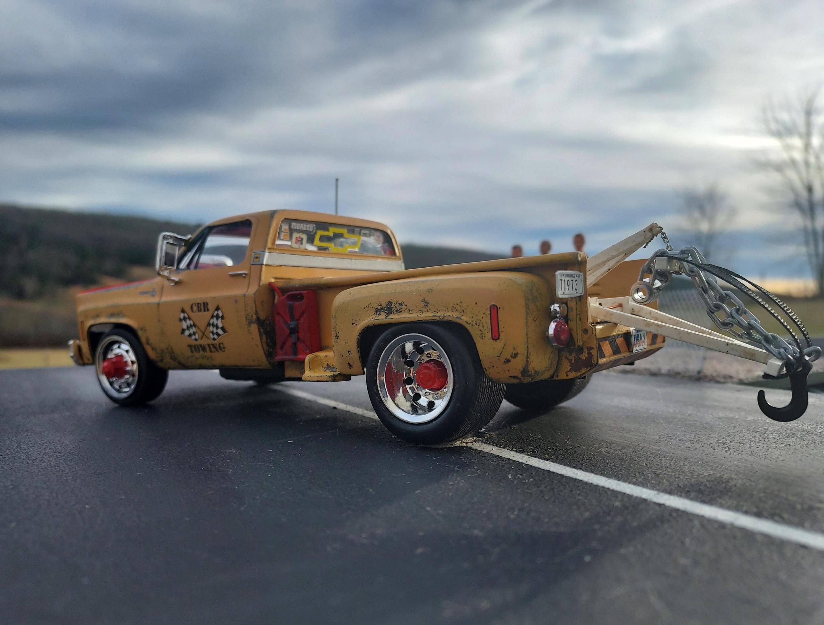 Here is my entry for the Cannonball Run Year Of Birth Community build. I used the Revellogram 76 step side and back dated it to a 73. Details include: stretched and widened bed tubbed and narrowed the rear-end lowered 4X4 frame 3d printed wreckerboom from BCSModels.com Chopped top Blazer details added to the interior Weathering from salt and vinegar process to rust and fade the paint 427 Big Block Road tractor wheels on Sprint (rear tires) fronts are Dodge Challenger It's a long bed stepside Pro-street Wrecker. It was a fun build I stayed focused as to finish on time...head over to see all the wonderful builds in the Finished thread in the Community section if you wish... Enjoy the photos and thanks for looking...