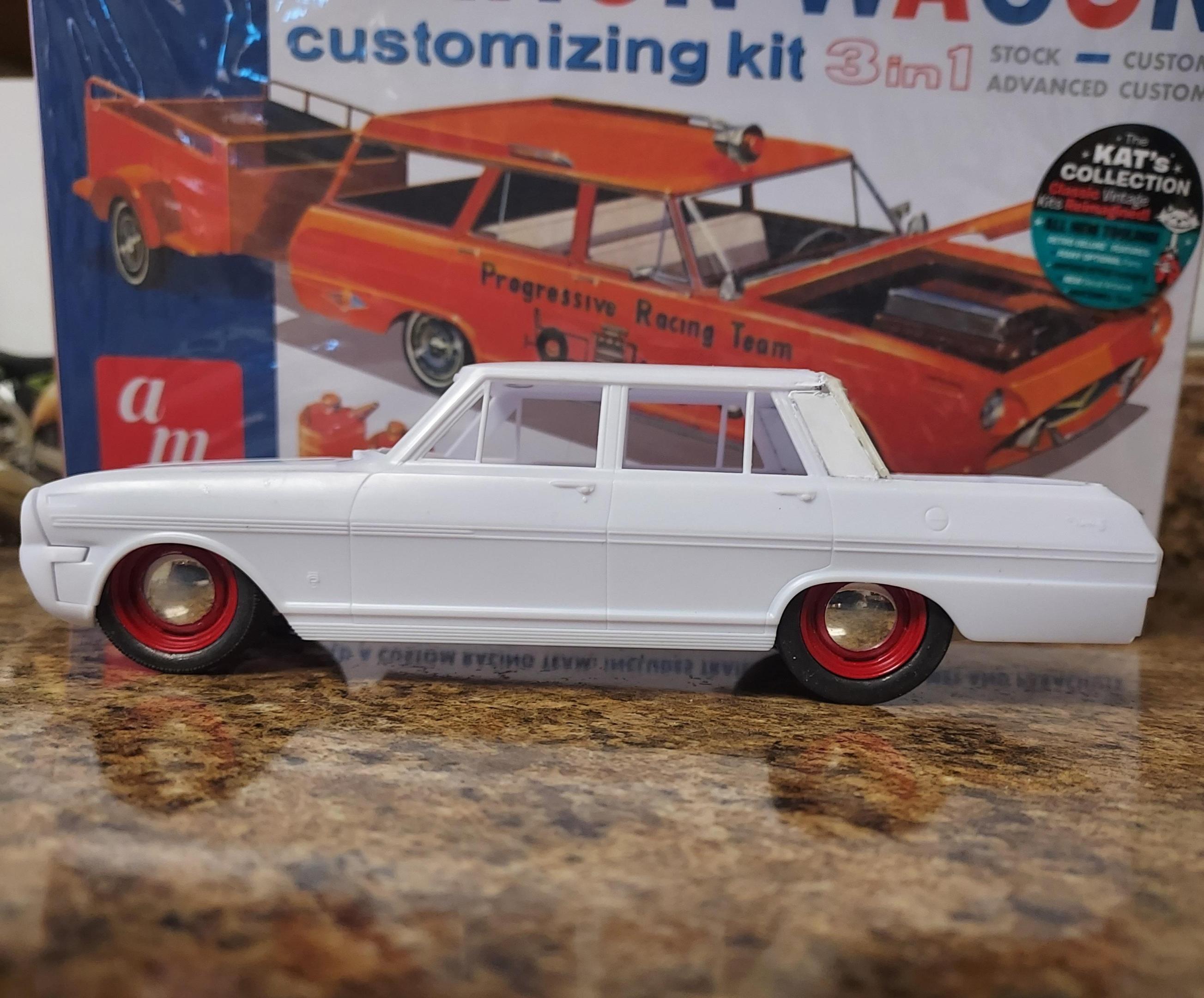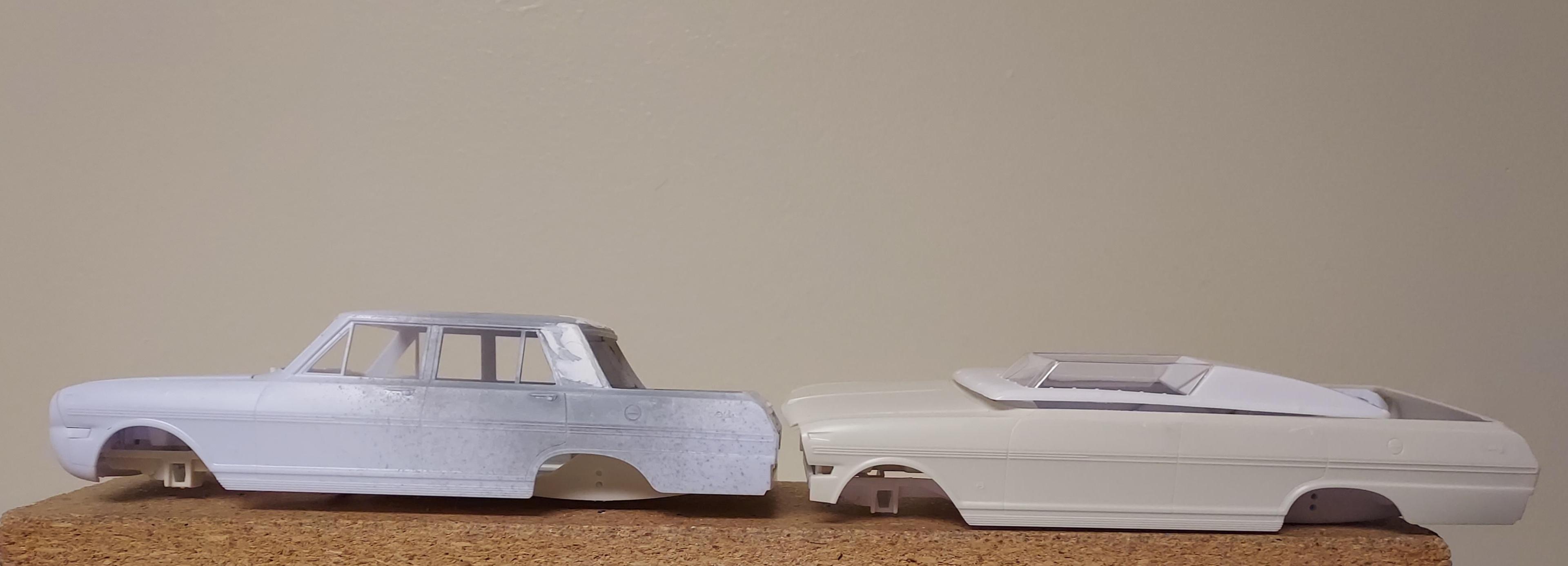 I kinda had an idea for the 63 Chevy II... I was trying to turn the wagon into a 4 door sedan. It started out going well until I looked at reference photos online. I seen alot of body differences. I definitely regretted cutting it up without researching. Now I'm thinking about using the custom parts from the kit and just continuing the build as a custom. Maybe someone took granny's wagon and chopped off the back of the roof because back then wagons weren't really the ideal choice to customize. I'm gonna move forward with this none the less. I've already sacrificed enough to turn back.