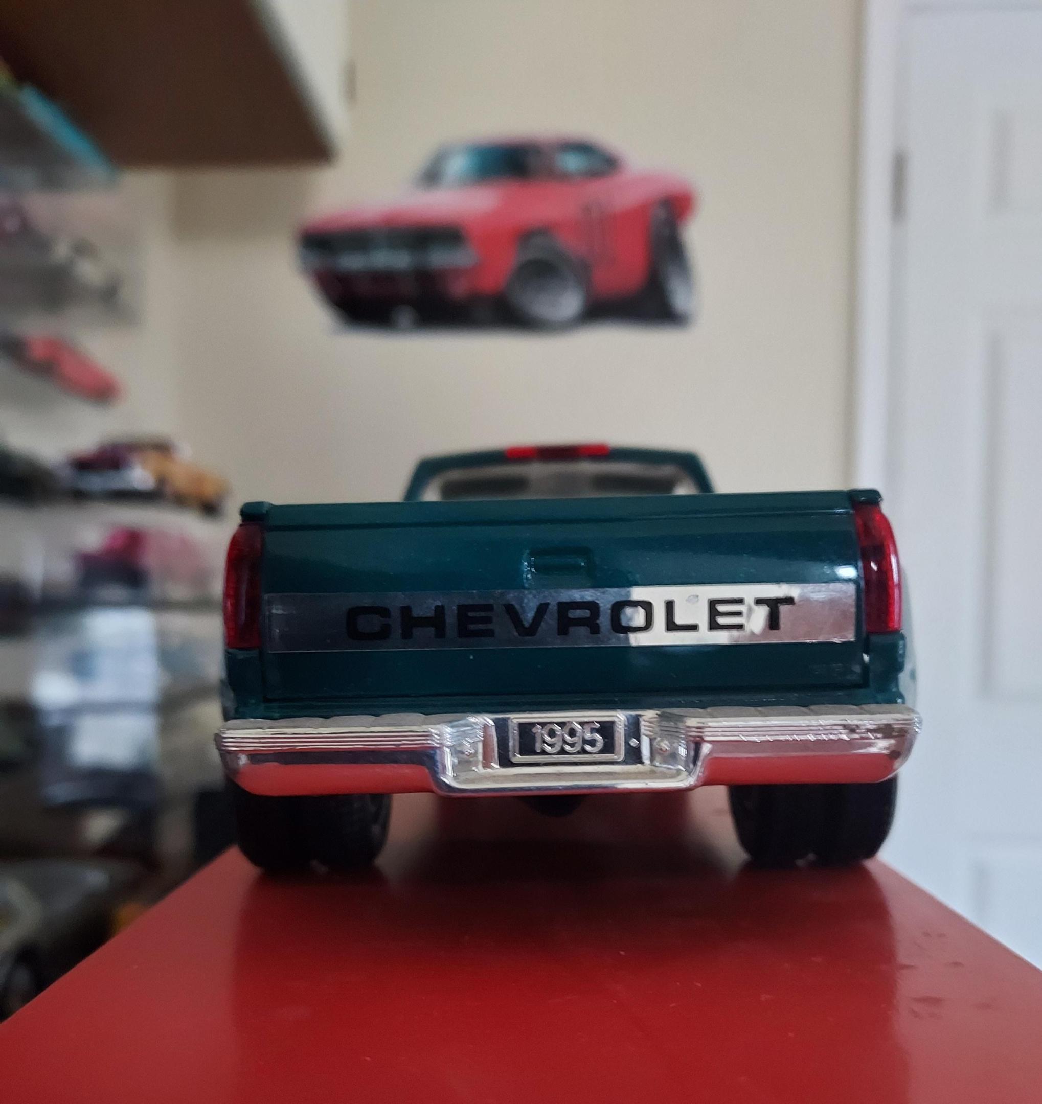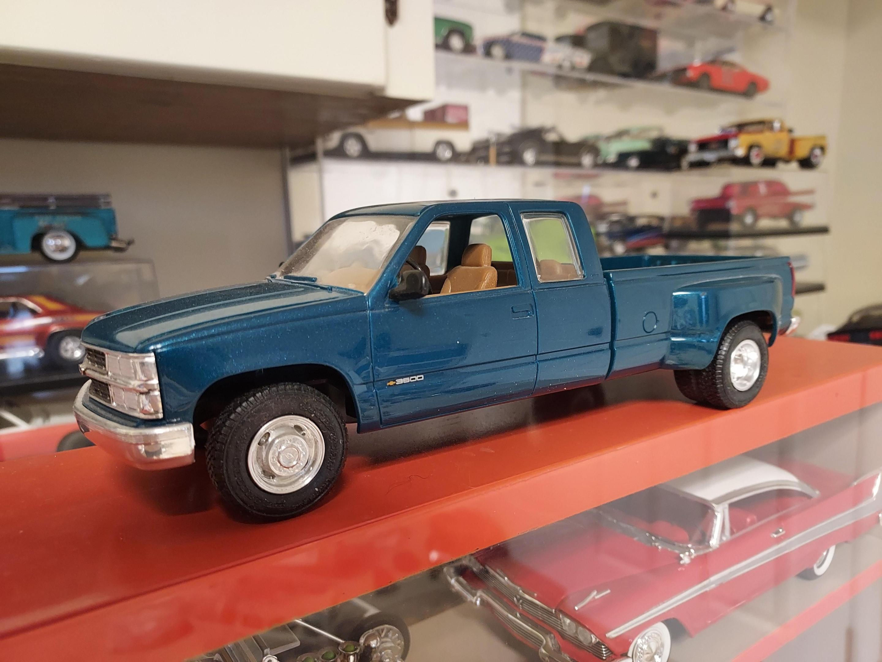 The "New Tooling" for this kit includes improving the grill and mirrors on the (promo) snap kit and early 1990's AMT model kits. The Chevy Silverado 1500 with the BYP Sport Package similar to the 454SS but with a 350ci 5.7L V8 with Automatic transmission. I'm not 100% sure but maybe the 5speed manual came standard with the 305ci? I'd be happy to see the Chevrolet Sport decals from Round II in Silver, Red, and Black. My Teal Promo dually is from 1995, atleast that's what the license plate says. Cool kits, I've built all the versions of it, glad to see Round II taking an interest in the truck.