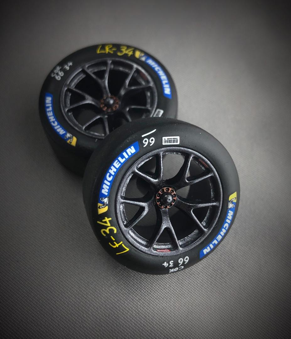 I prime and paint the wheel, then I use a Xacto blade and carefully scrape away the paint/primer down to the bare plastic. I then use either a yellow or red Sharpie to color the stripe in. -