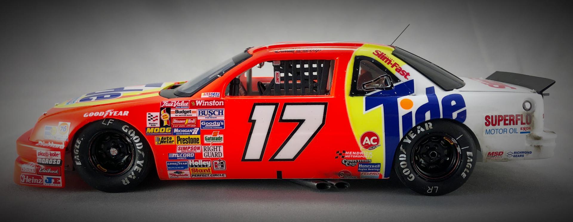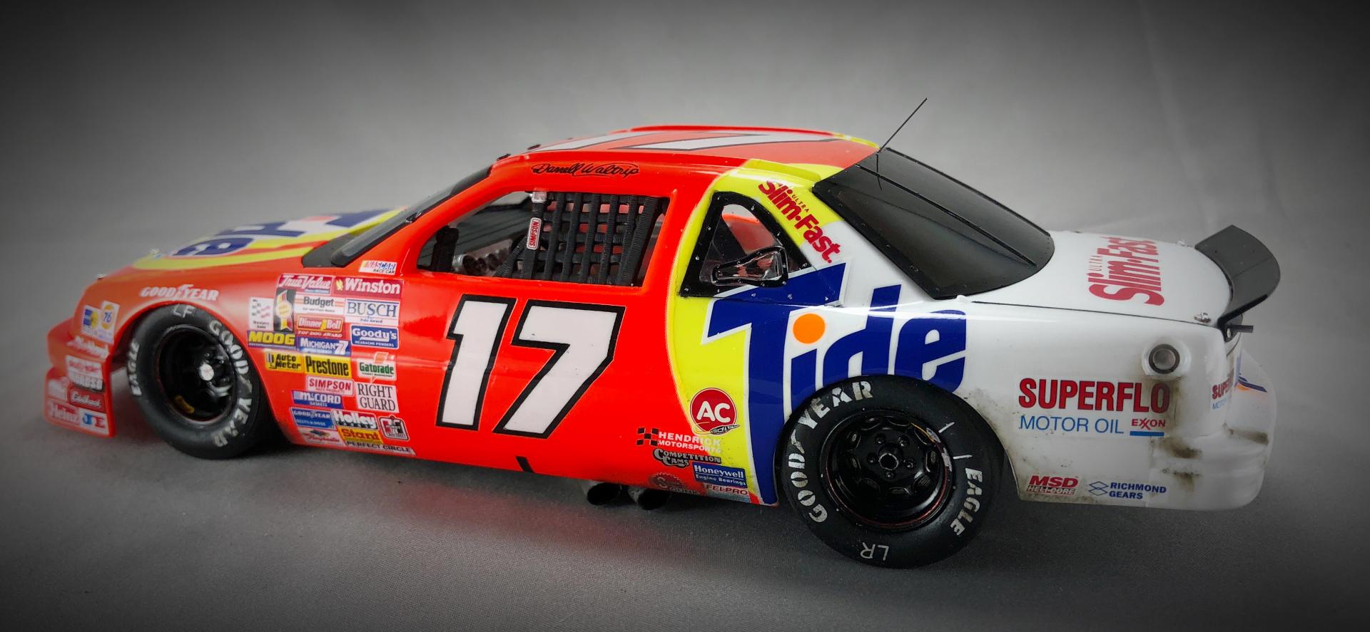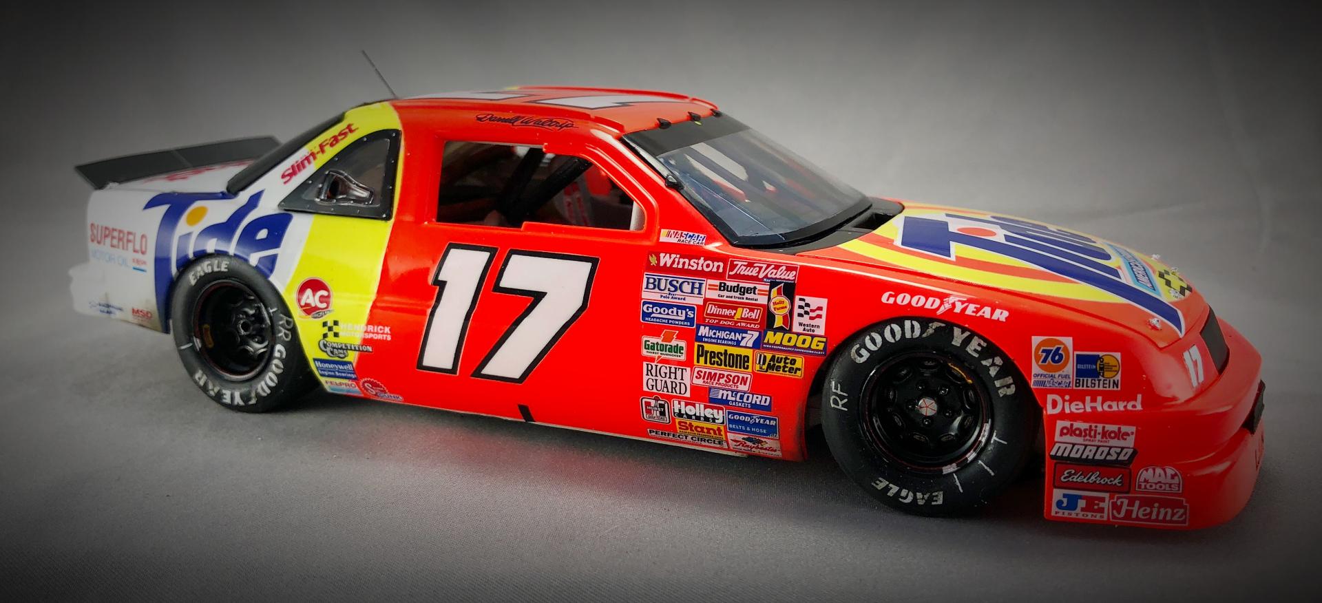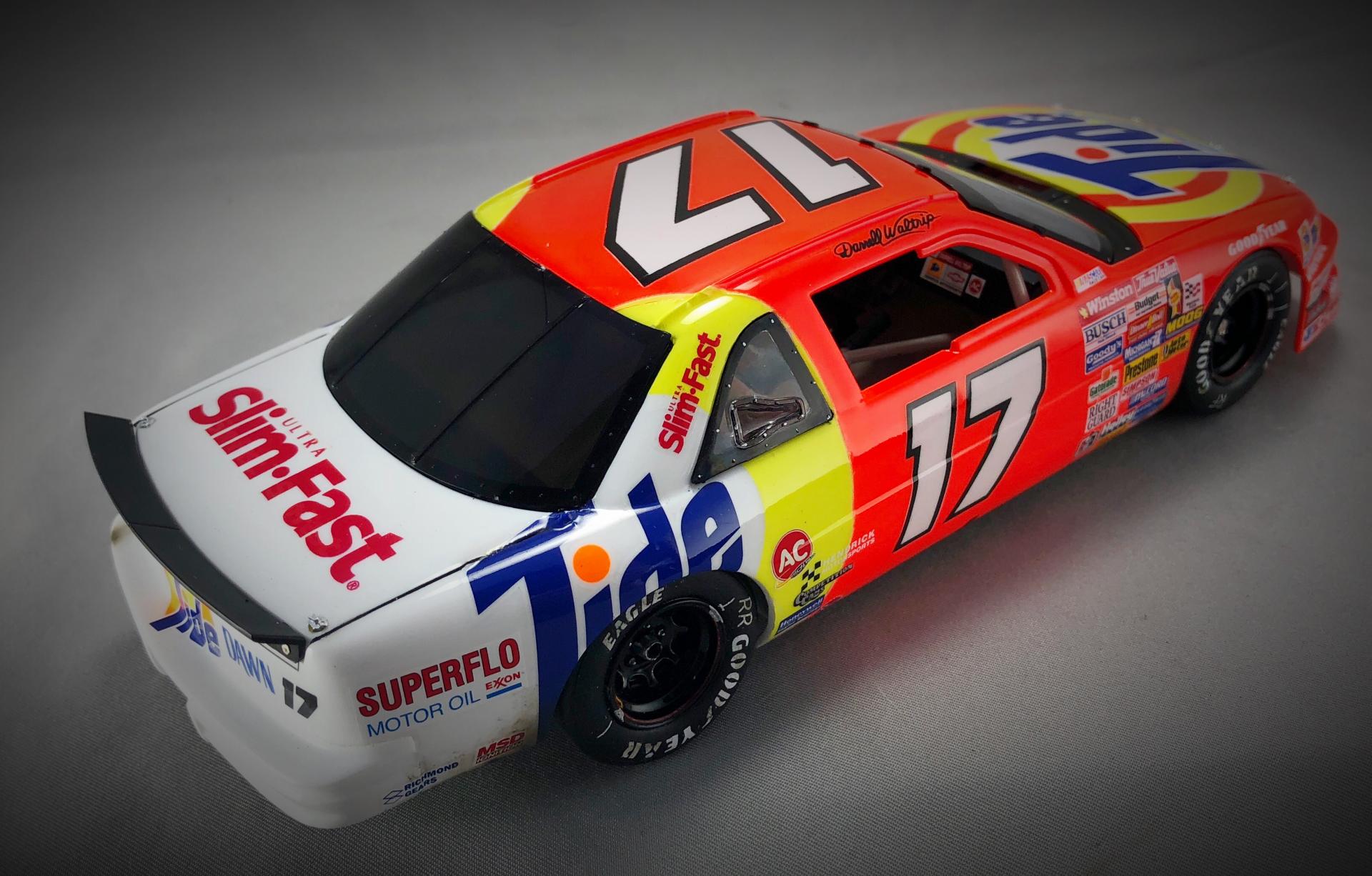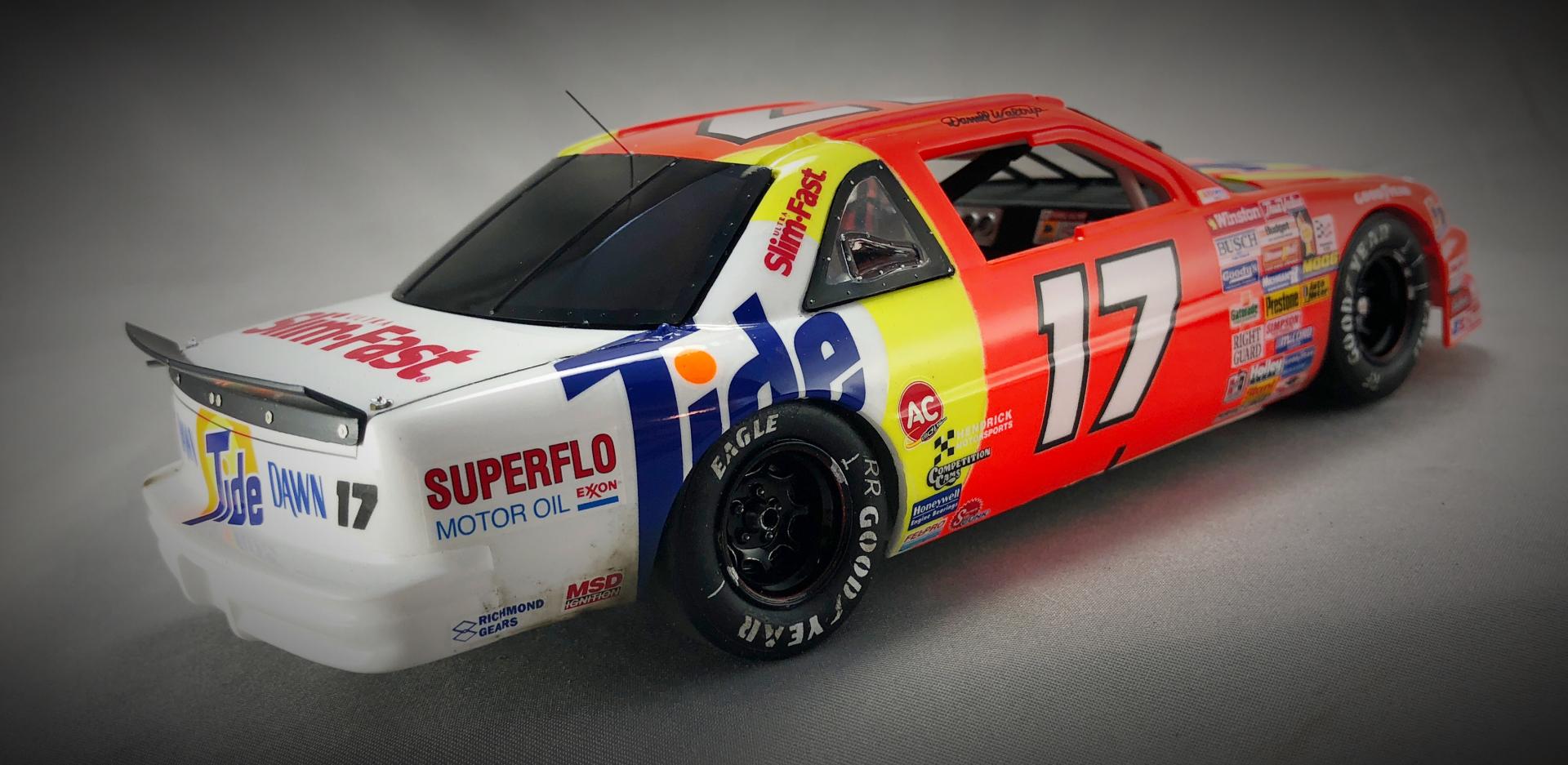Finally finished this thing! Paint is Tamiya neon orange and white, Powerslide decals, and 2 part clear from Gravity. My good friend Clay Kemp helped with the Ultra Slim Fast decals so I could do the late season car, after Darrell returned from his broken leg. I also lowered the stance for a more aggressive look.