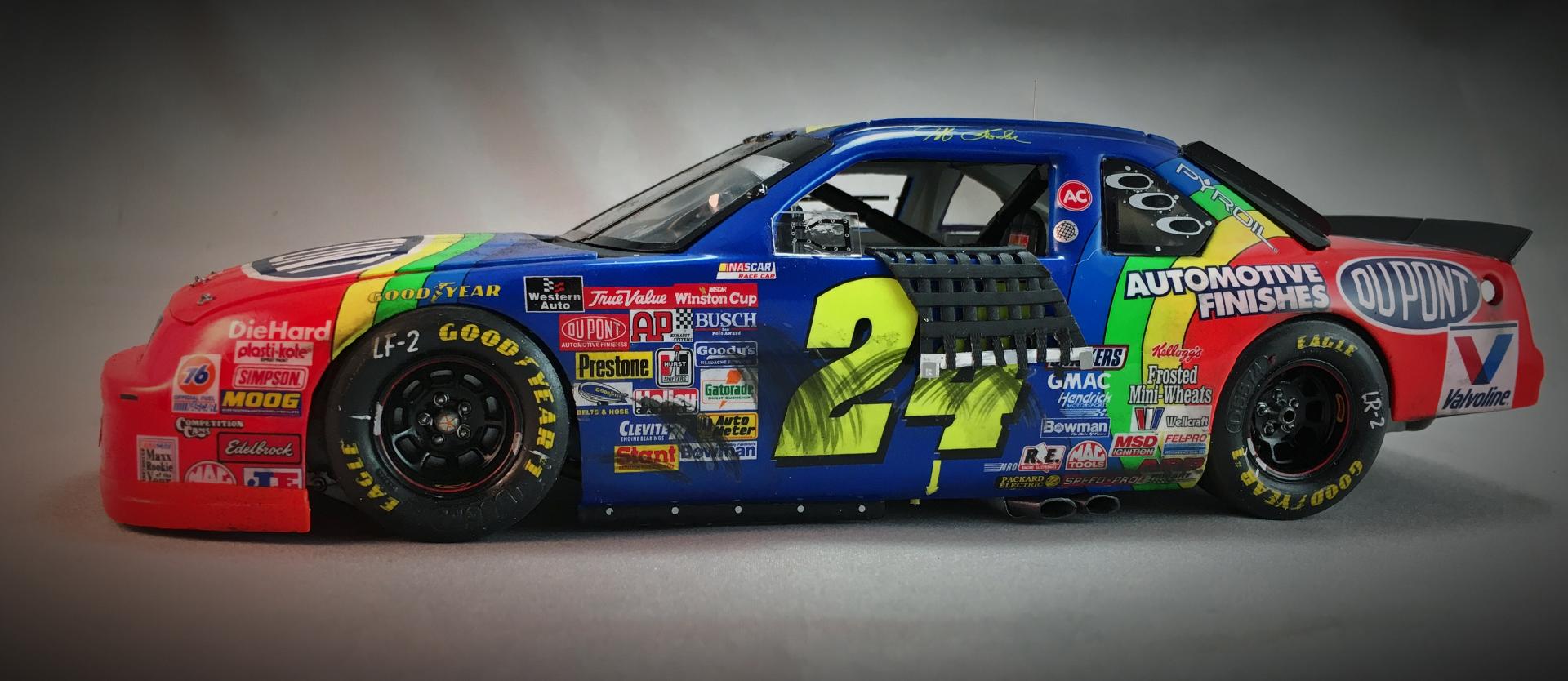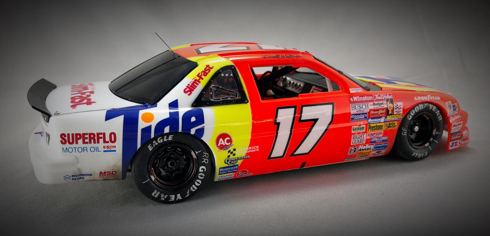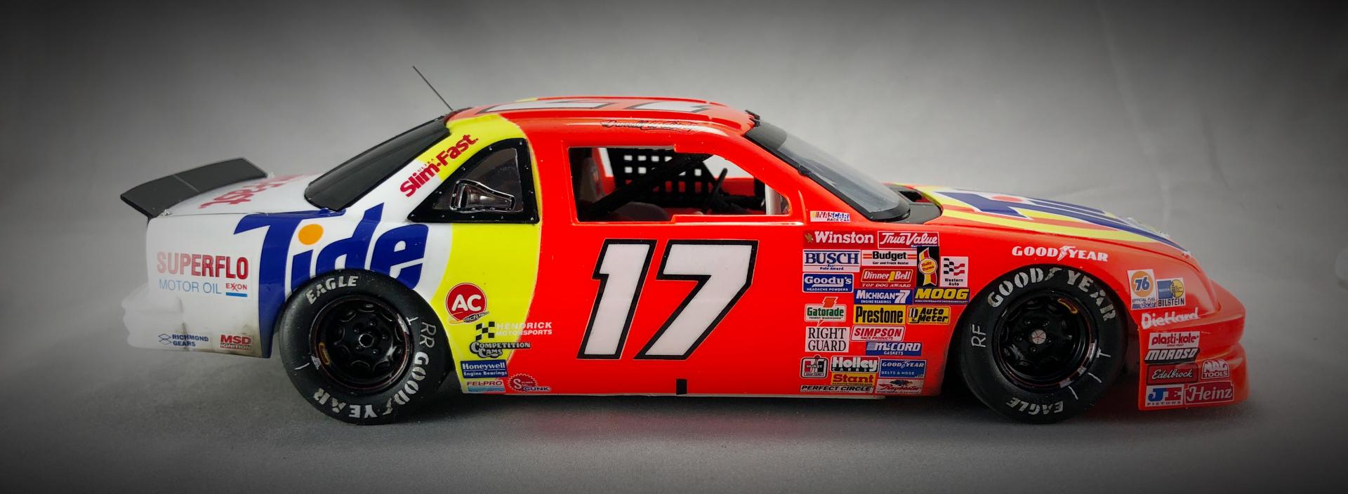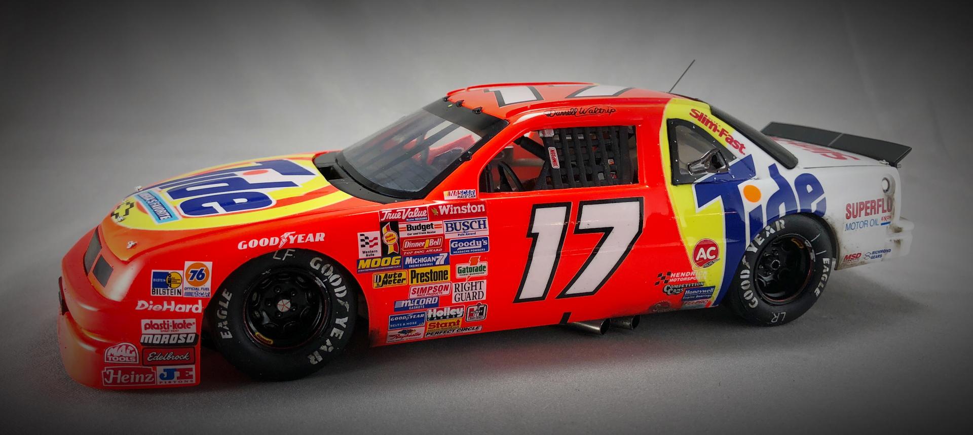 Finally finished this thing! Paint is Tamiya neon orange and white, Powerslide decals, and 2 part clear from Gravity. My good friend Clay Kemp helped with the Ultra Slim Fast decals so I could do the late season car, after Darrell returned from his broken leg. I also lowered the stance for a more aggressive look.