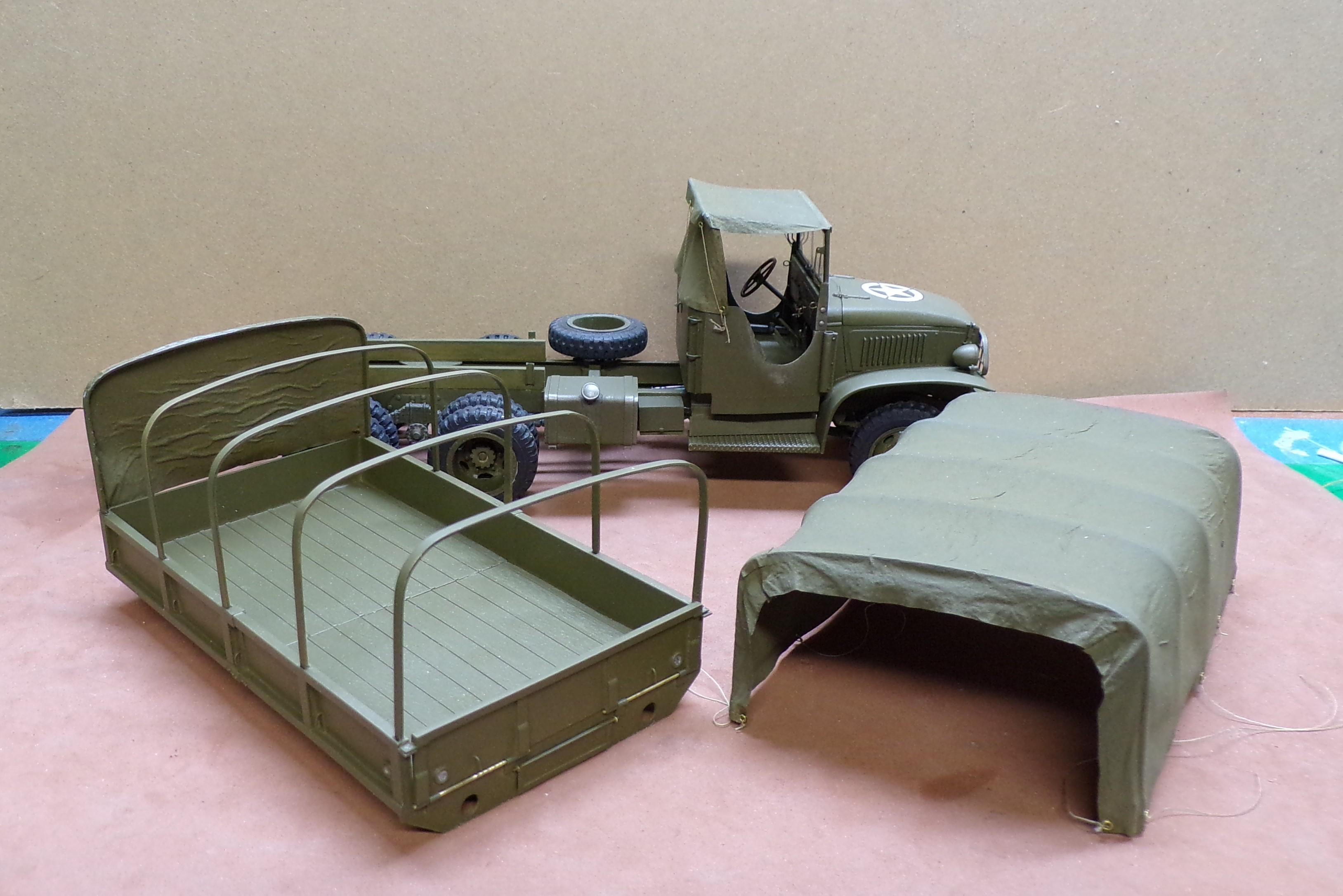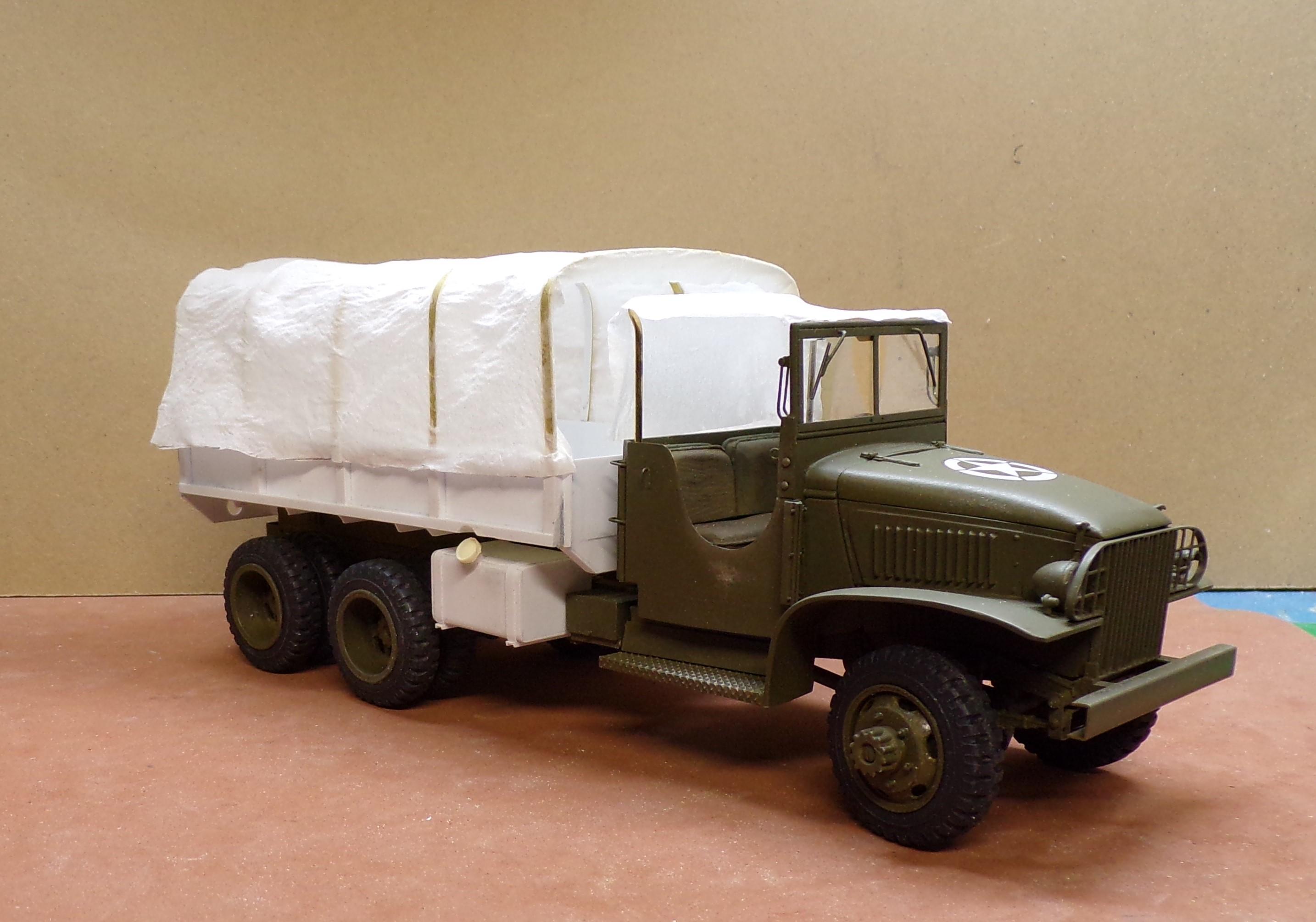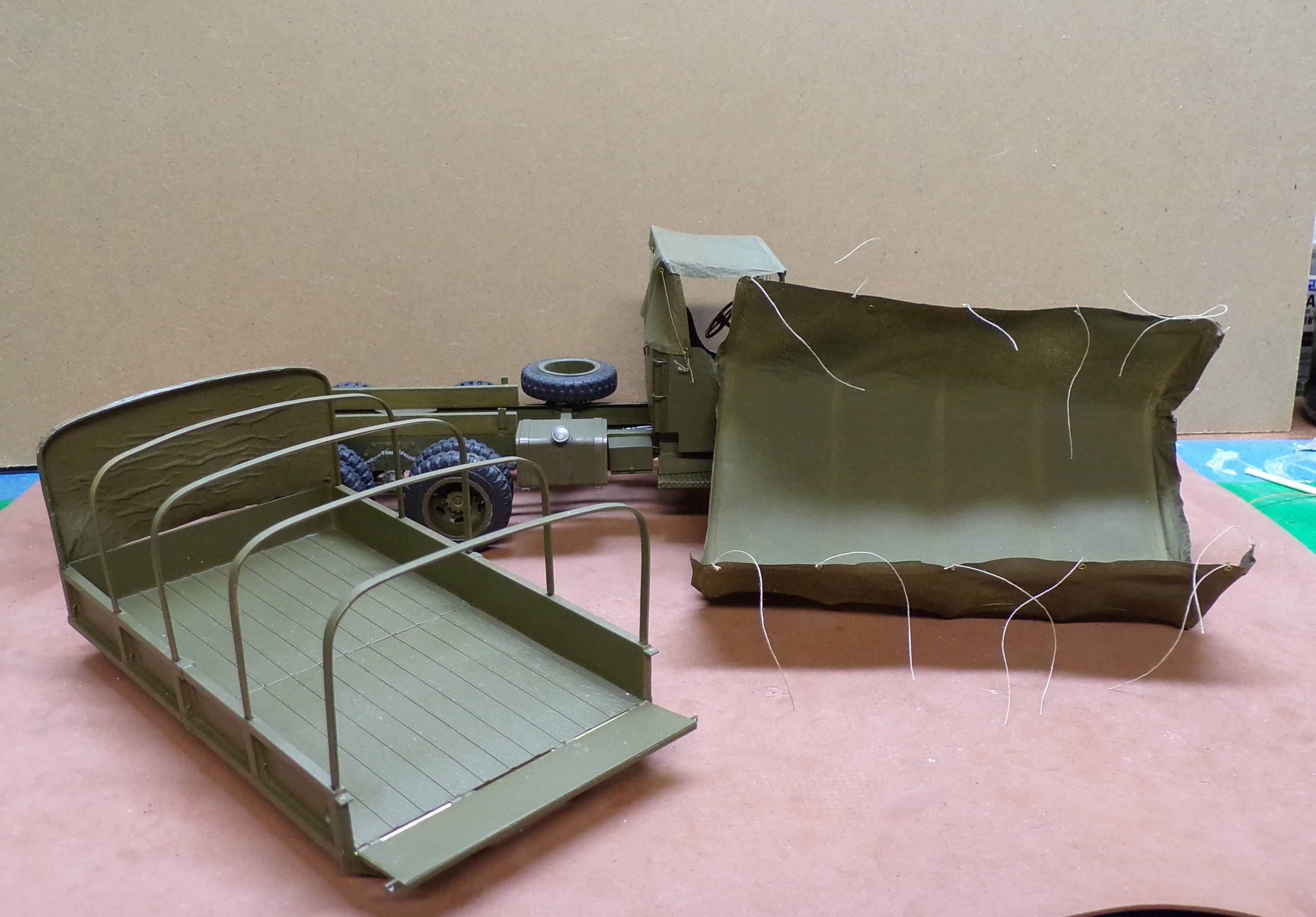Getting back to tarps,,AHEM!! I made several canvas tops for my militay builds using regular two ply plain facial tissue. I cut to rough shape, drape them over whatever form I'm using and paint the whole surface with a 50/50 mixture of white glue and water. Let it dry. When it dries it is stiff but still could be folded. It has a tendency to shrink a bit when over a form but that is what you want with canvas. Here are the results, painted, both sides with Testors olive drab paint.