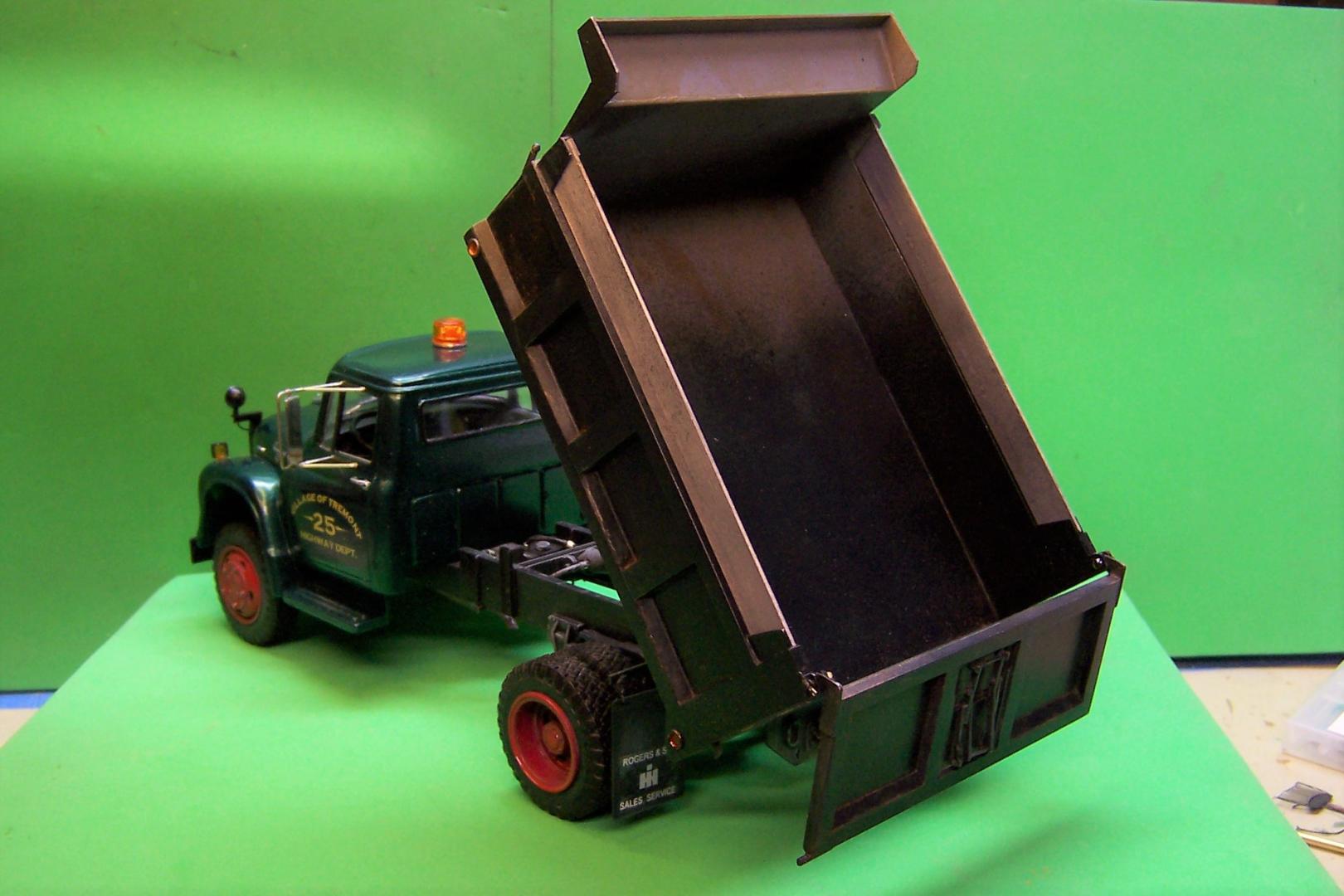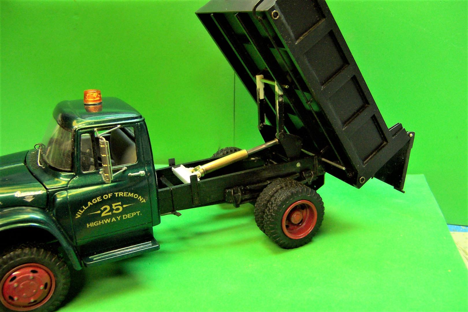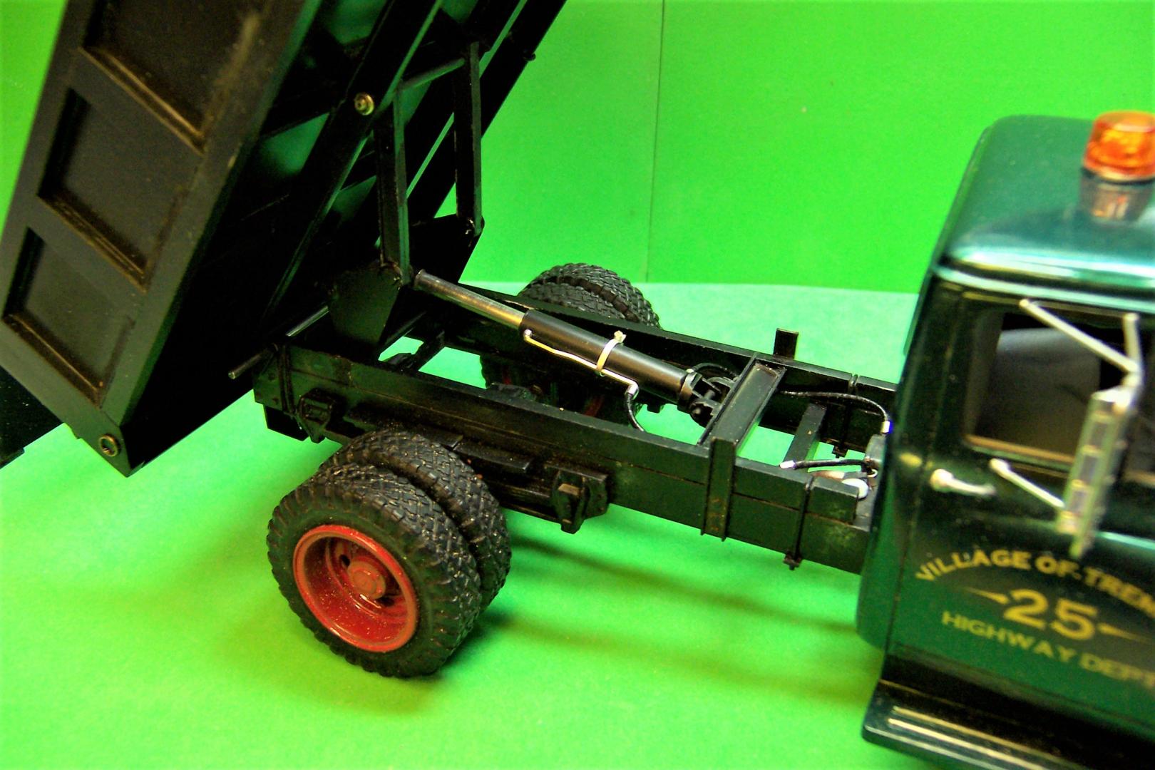 The last couple of days were spent making up the lift mechanism for the body and the hydraulic cylinder to raise it. After much trial and fit the lift mechanism was finished up. It took some adjusting to get the body to raise all the way and at the same time have the lift settle in between the frame rails without cramping. I ended up having to cut away some of the differential to allow one side to drop down. Guess I won't be driving it too far! The cylinder and piston are brass tubing and aluminum tubing. There is a stop on the low end of the piston and one on the upper end of the cylinder that keeps the piston in place. The hydraulic line fittings are bead details from a craft store. The two circles on the ends of the body are for reflectors. They will be painted silver and then topped with clear amber on the front and clear red on the rear. The body has now been painted and the cuts that had to be made for the tailgate locks have been filled in with sheet plastic and sanded smooth. The only thing that shows now are the ends of the locks that keep the tailgate closed. With the body up the tailgate lever can be pulled, the locks raise up and the tailgate opens.