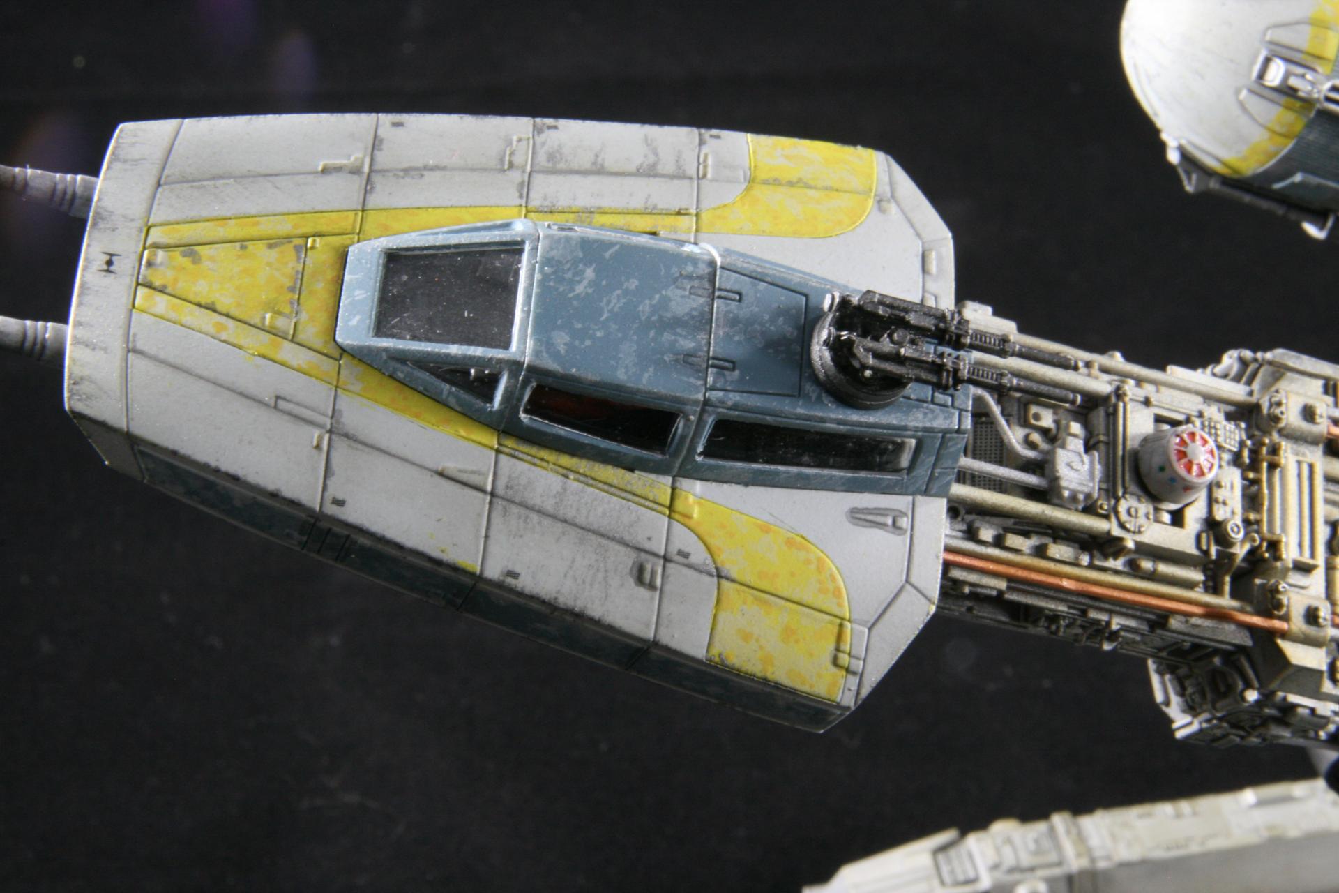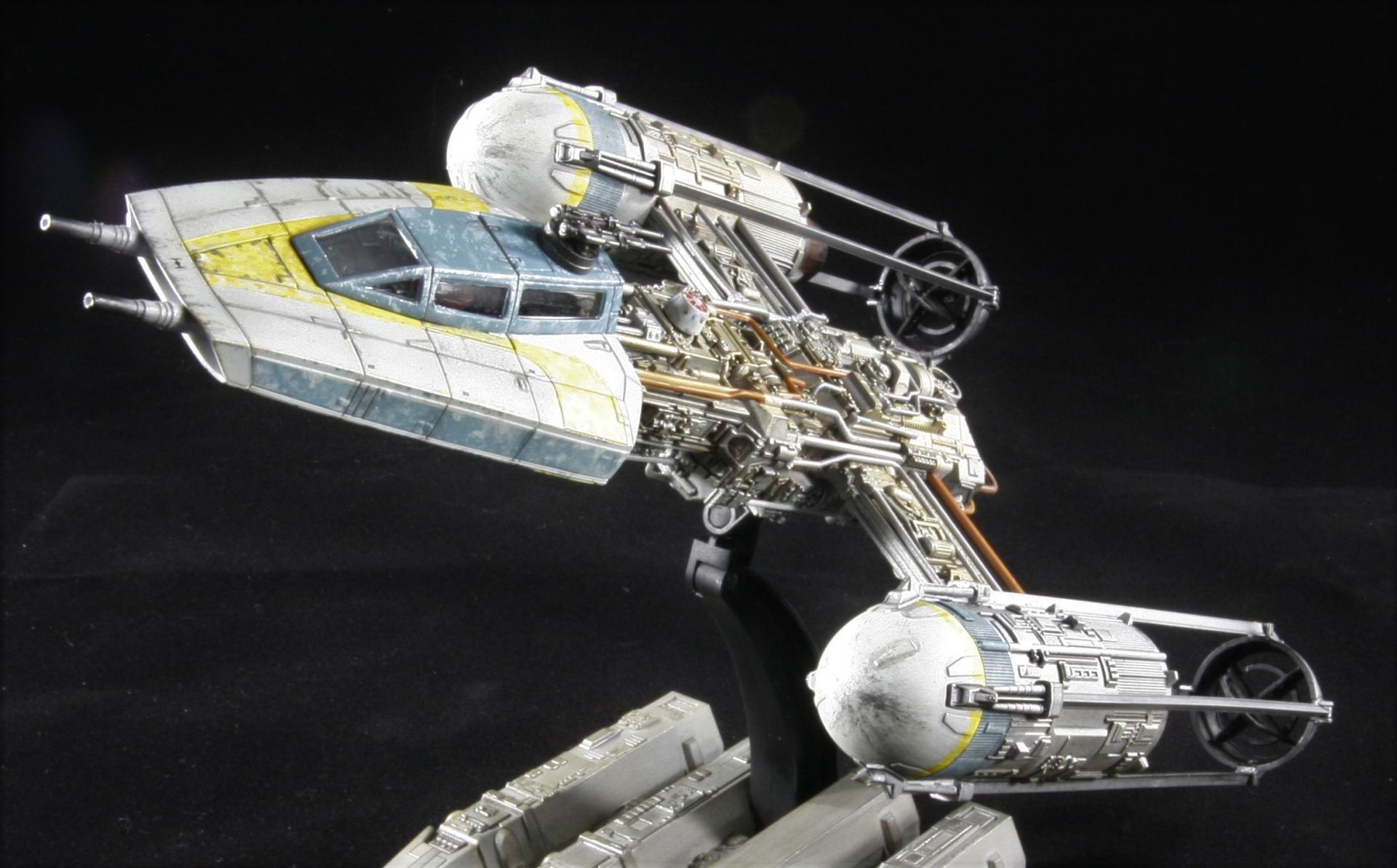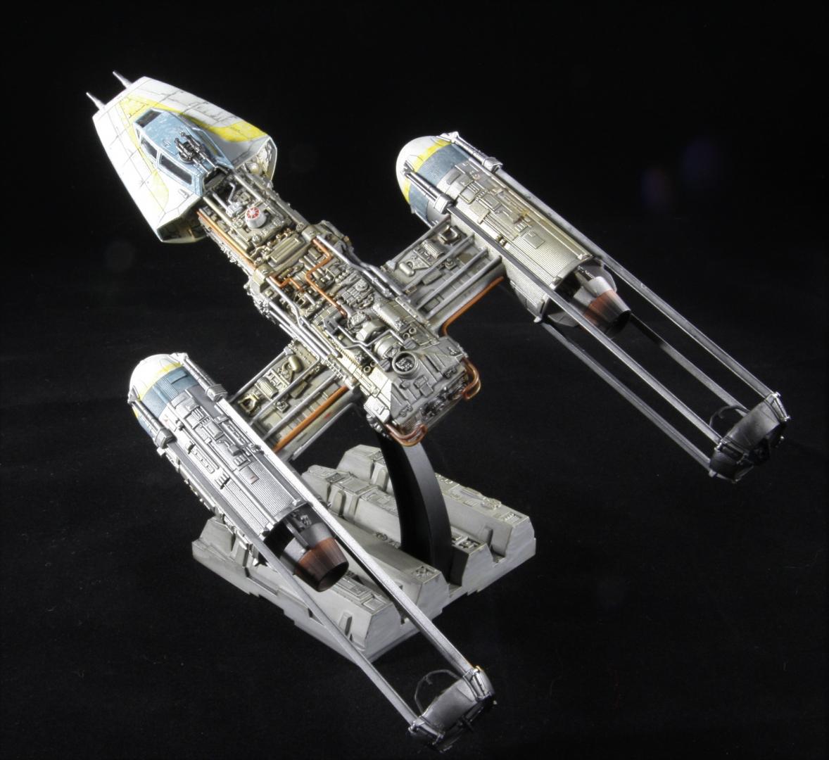 As a break from building shiny things, I decided to take on the Bandai Y-Wing kit I picked up at a local comic book store a few months ago. The detail on this kit is astounding as is the engineering... it's a snap-fit kit that has the smallest panel gaps and best parts fit of ANY model I've ever seen. Bandai uses a nifty technology that allows them to mold several colors onto one tree, so the kit can look pretty good for a relatively inexperienced modeler right out of the box. The Y is pretty complicated as all the "plumbing" of the movie model is done as separate parts, which adds a level of depth to the model that it would never have if this stuff was molded in place. The fiddly fit of these pieces is further complicated by the extremely tight tolerances... a few layers of paint really make a difference in how everything fits! Paint is custom mixes of Tamiya colors over Tamiya grey primer. I did the panel lines, wash on the mechanical bits and streaking with Testors Model Master oil wash. Finally I used Tamiya Weathering Master pastels to bring out highlights. Enjoy!