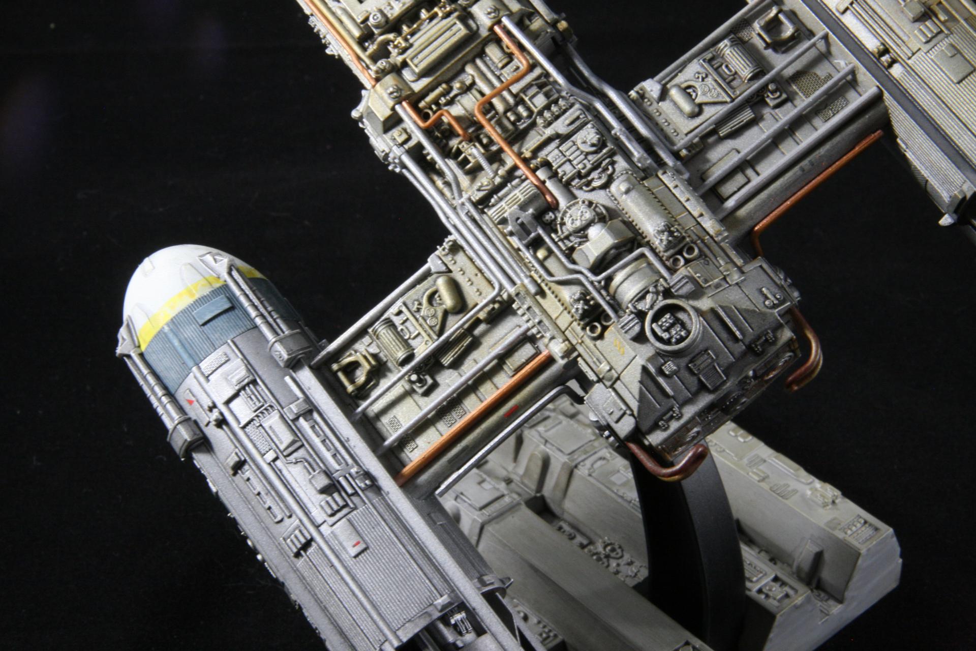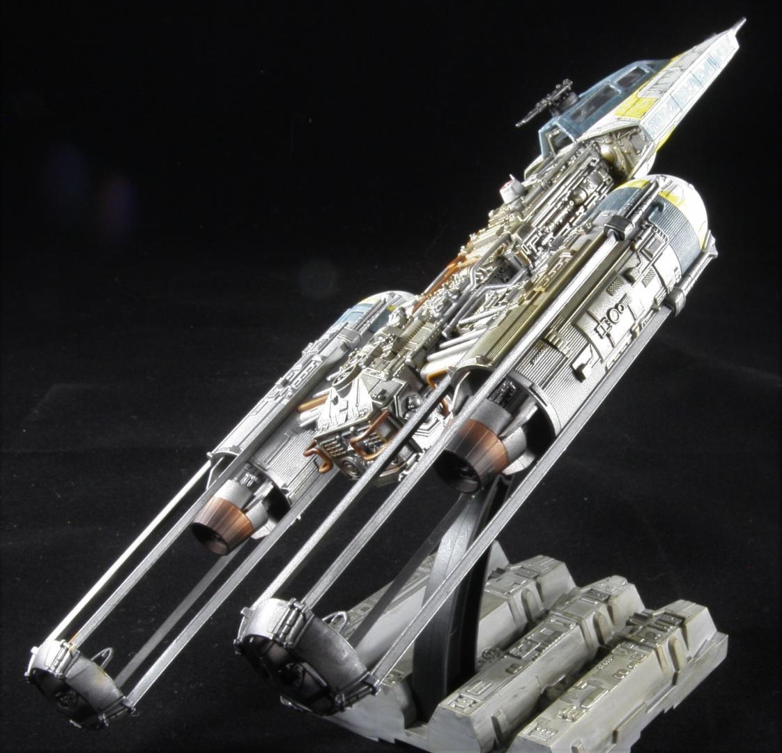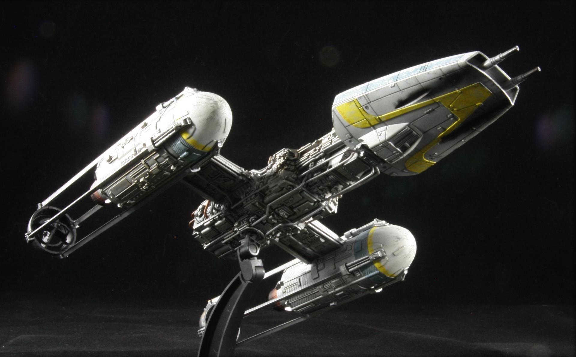 As a break from building shiny things, I decided to take on the Bandai Y-Wing kit I picked up at a local comic book store a few months ago. The detail on this kit is astounding as is the engineering... it's a snap-fit kit that has the smallest panel gaps and best parts fit of ANY model I've ever seen. Bandai uses a nifty technology that allows them to mold several colors onto one tree, so the kit can look pretty good for a relatively inexperienced modeler right out of the box. The Y is pretty complicated as all the "plumbing" of the movie model is done as separate parts, which adds a level of depth to the model that it would never have if this stuff was molded in place. The fiddly fit of these pieces is further complicated by the extremely tight tolerances... a few layers of paint really make a difference in how everything fits! Paint is custom mixes of Tamiya colors over Tamiya grey primer. I did the panel lines, wash on the mechanical bits and streaking with Testors Model Master oil wash. Finally I used Tamiya Weathering Master pastels to bring out highlights. Enjoy!