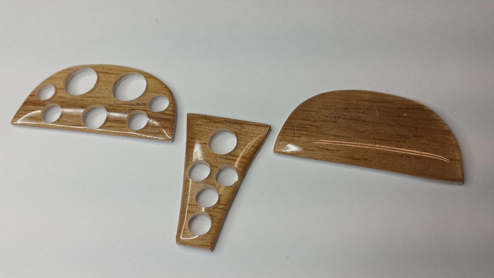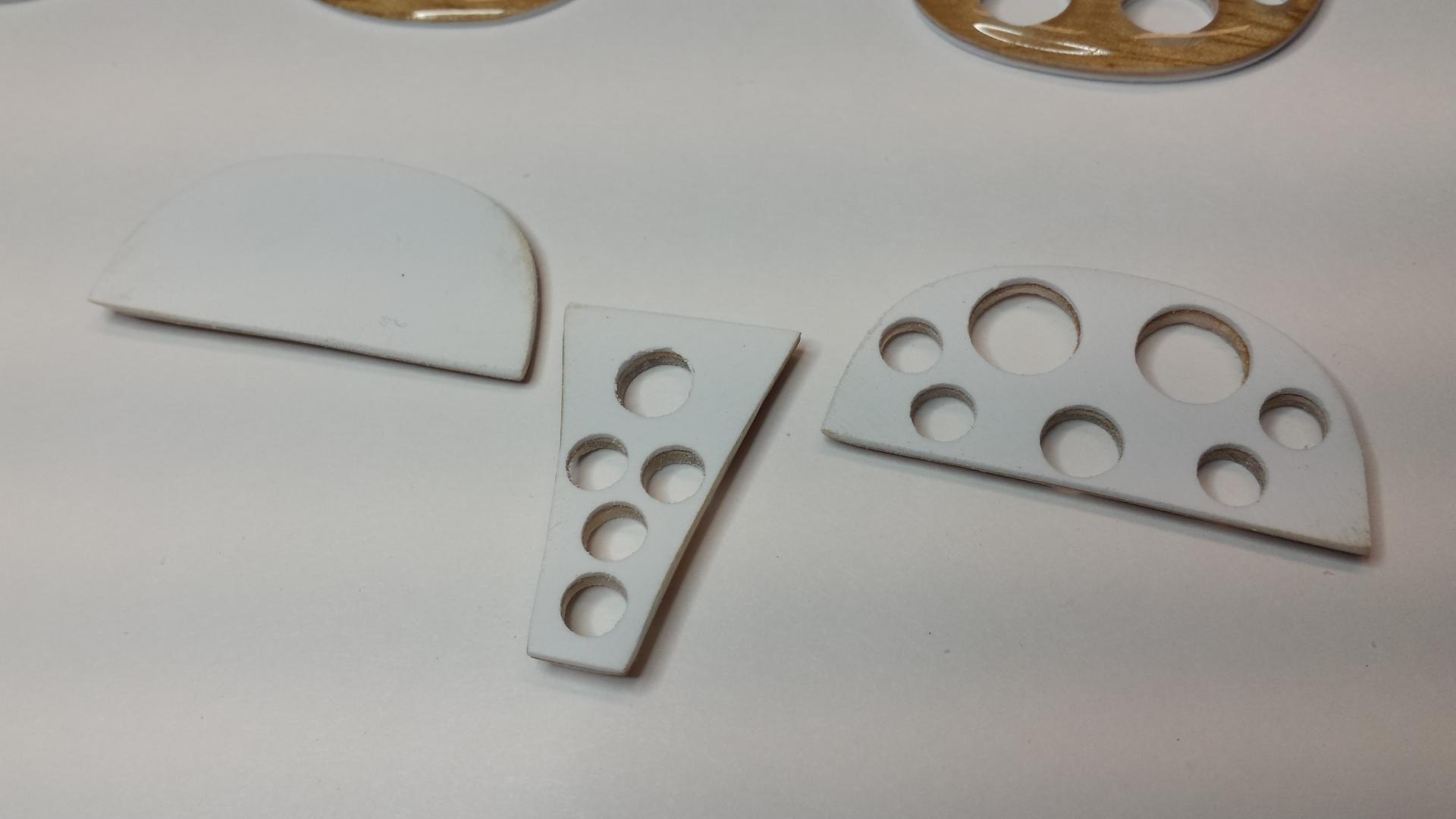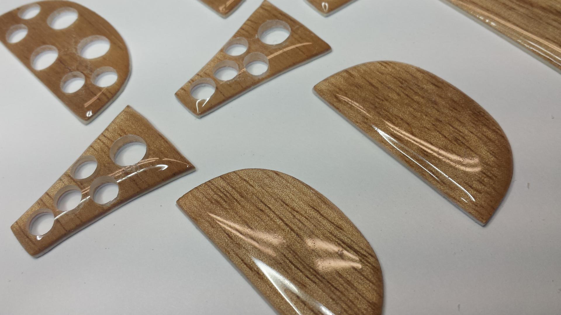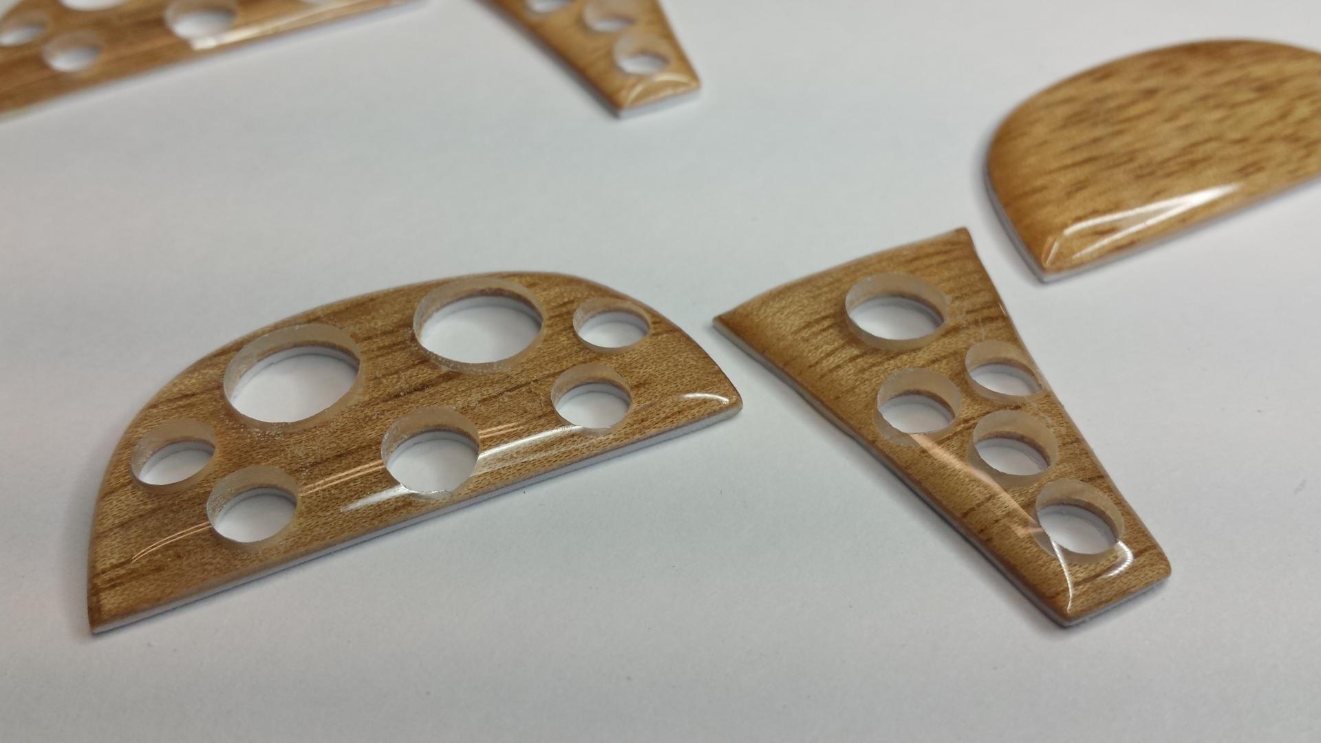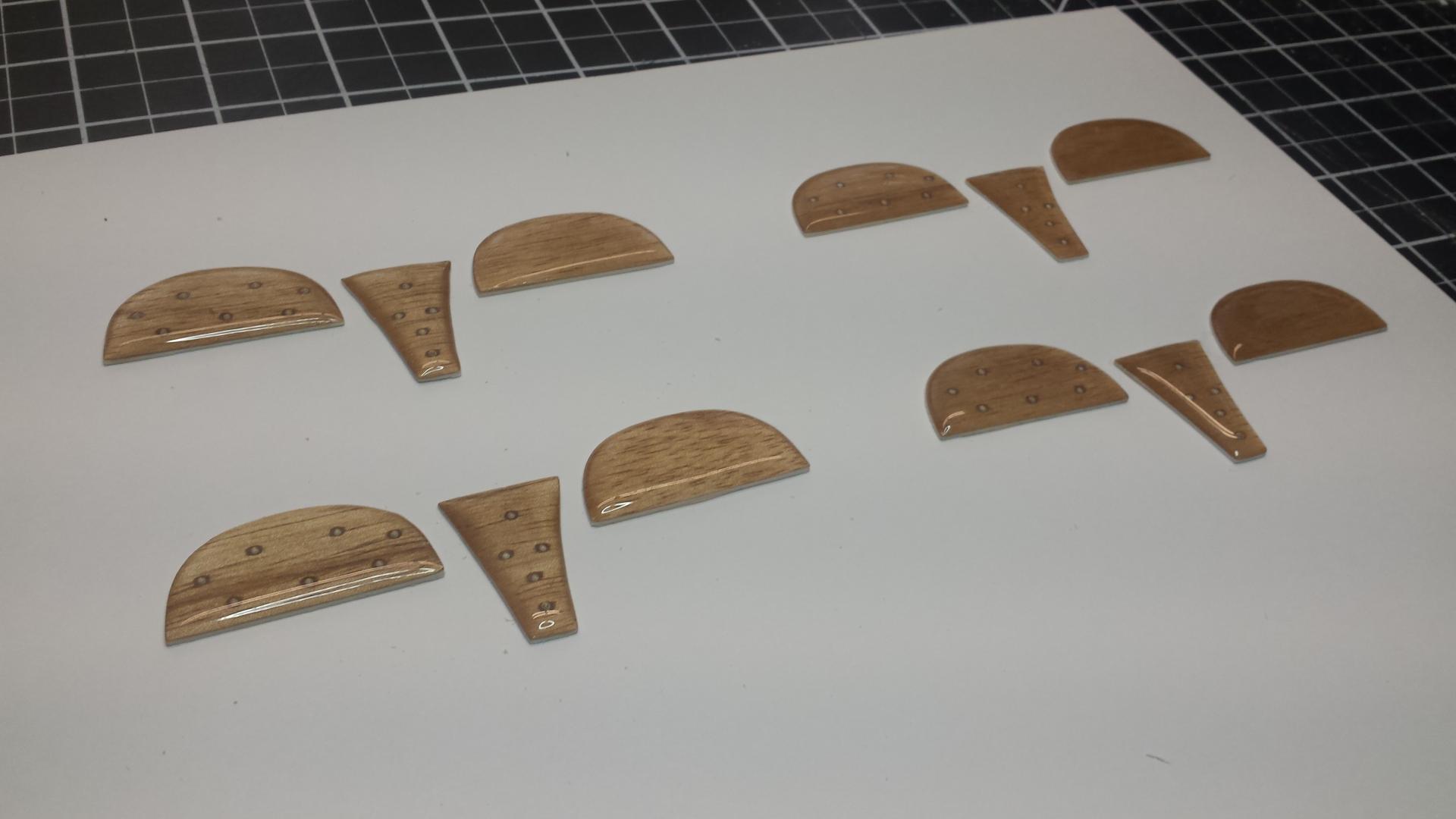 And here are the results. If you wonder why I make so many it's mostly because of the set-up time involved. You also might want a few extras and some turn out to be seconds (including some of these). Worst case you have extras for future builds. Eventually I will carefully peel off the .030 plastic sheet from the back of each wood piece. Once everything has been drilled you can do so. I'll explain this later. Next I will cut and fit the aluminum tube.