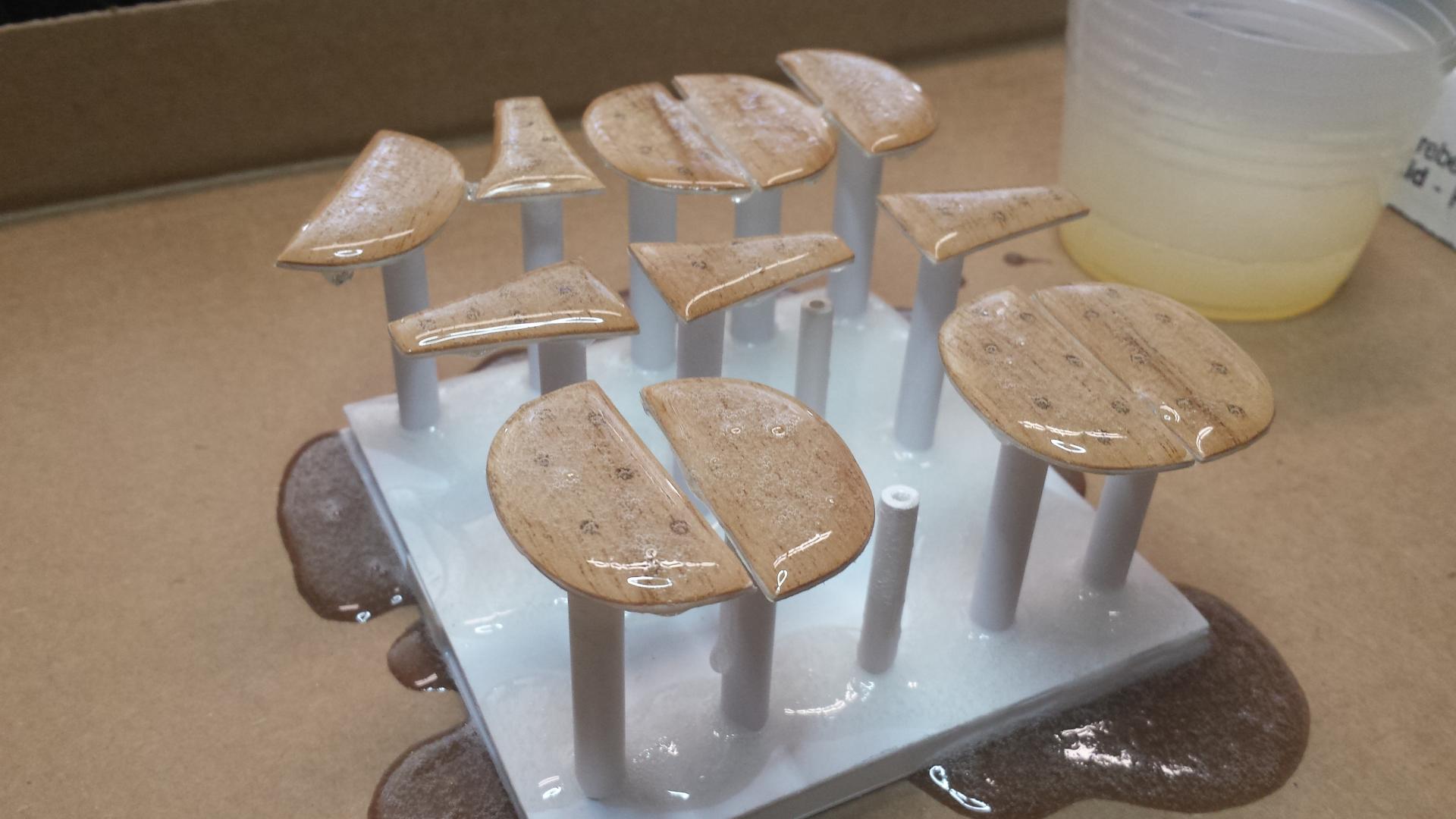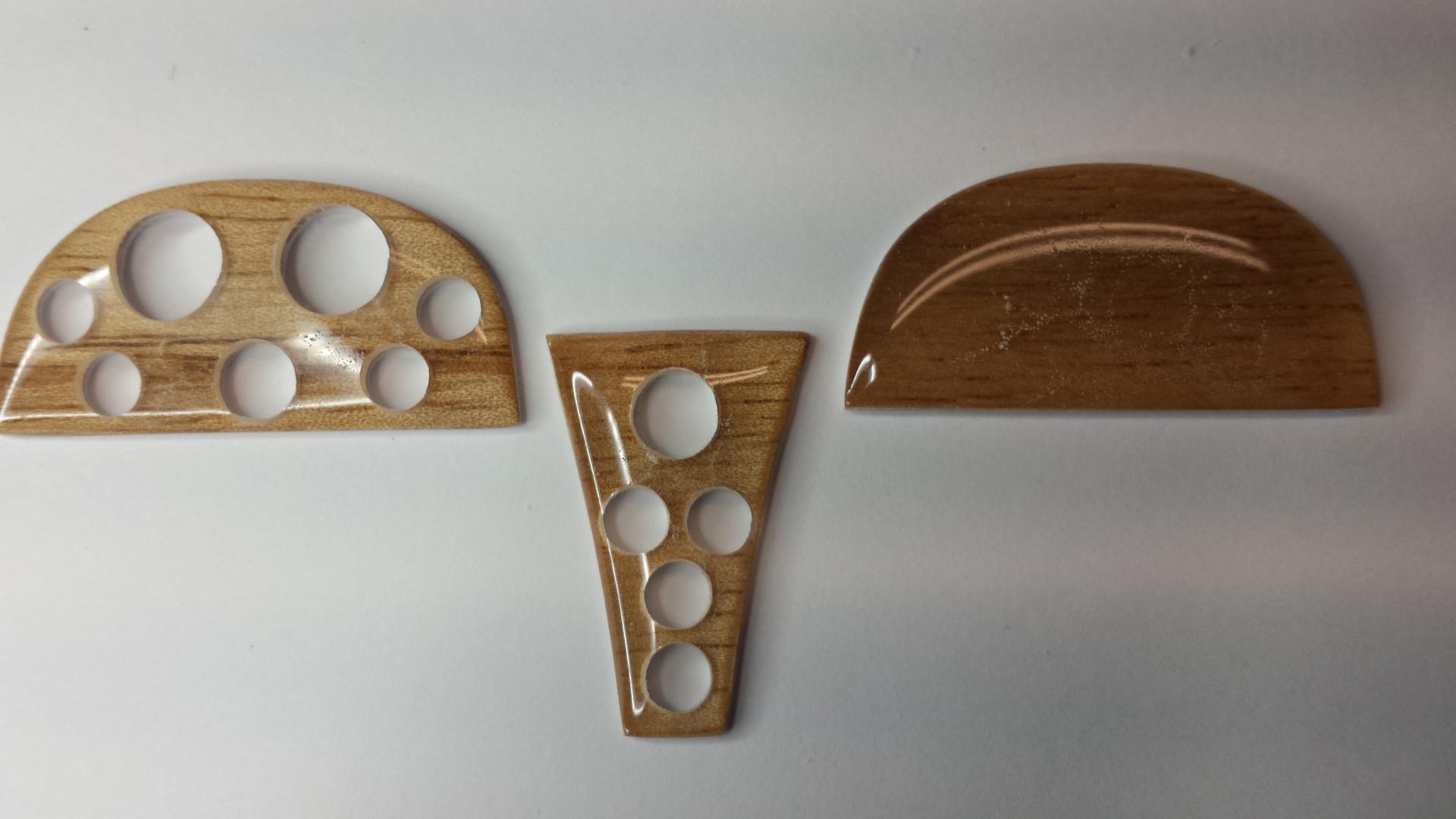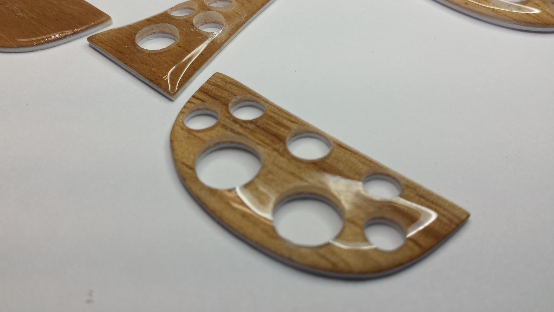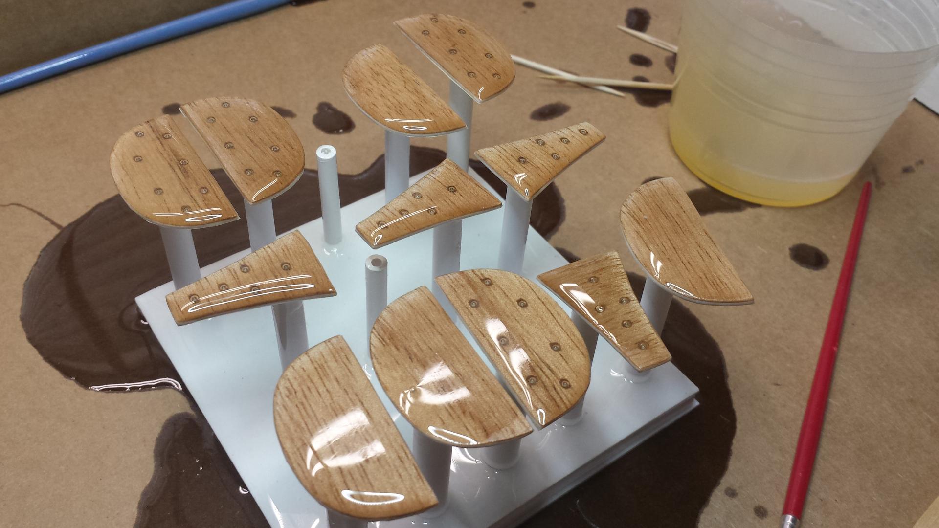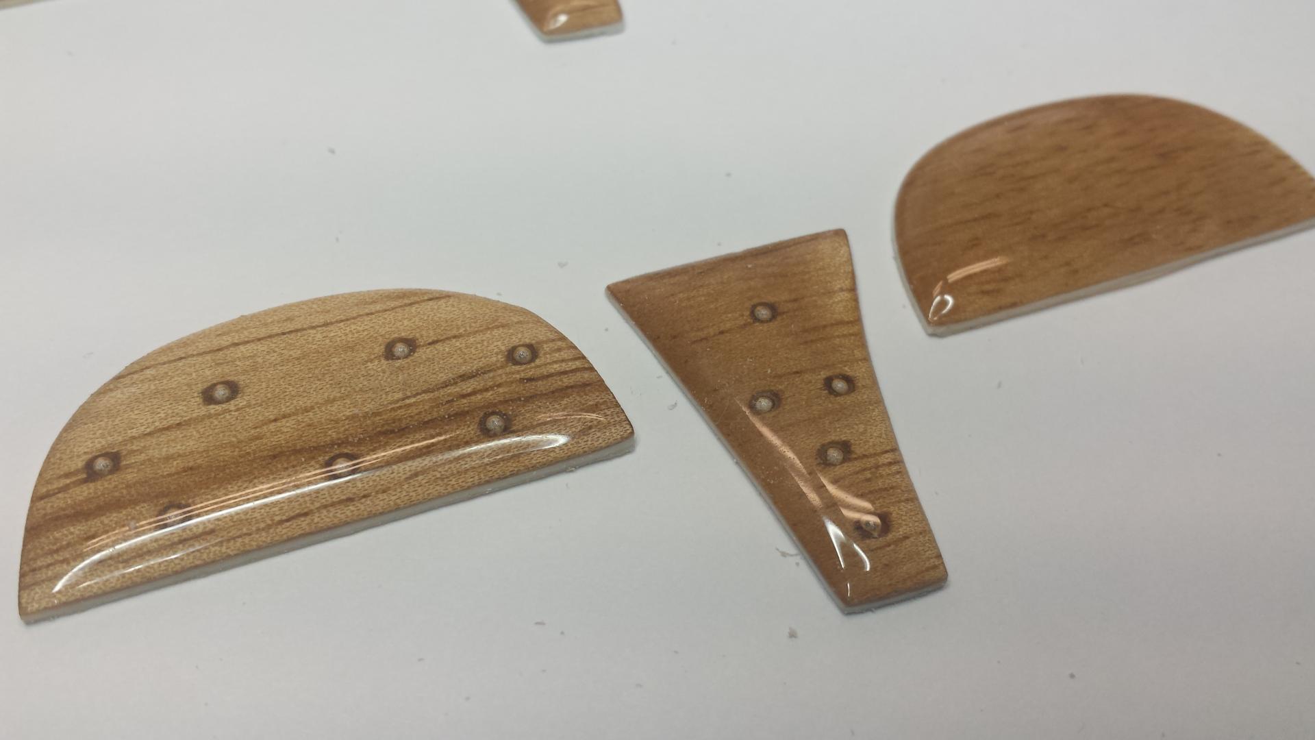 And here are the results. If you wonder why I make so many it's mostly because of the set-up time involved. You also might want a few extras and some turn out to be seconds (including some of these). Worst case you have extras for future builds. Eventually I will carefully peel off the .030 plastic sheet from the back of each wood piece. Once everything has been drilled you can do so. I'll explain this later. Next I will cut and fit the aluminum tube.