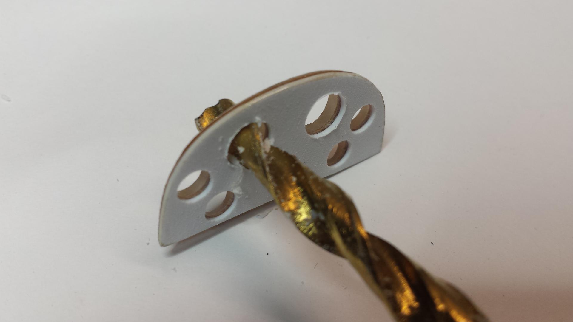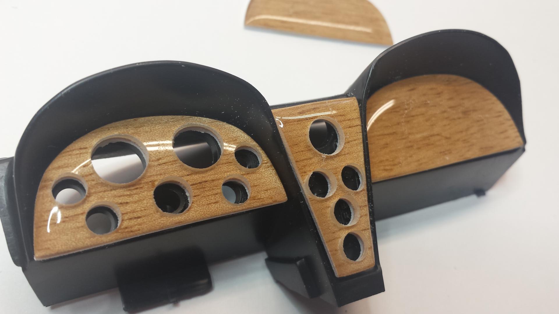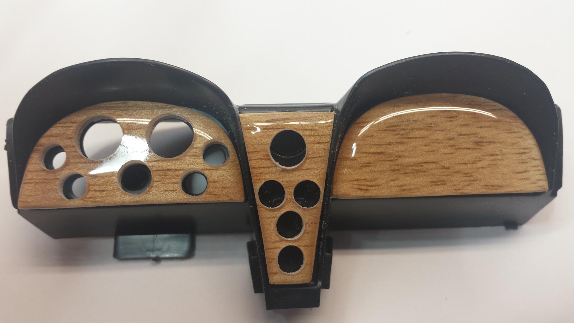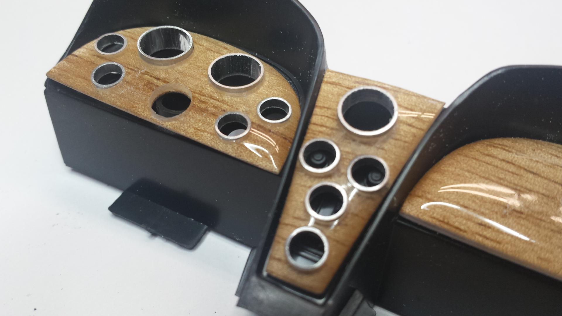 Now we need to drill through and locate every hole. I'm using 3 nominal sizes of K & S Aluminum for the gauge bezels - 3/16", 1/4" and 5/16". You must drill slowly by hand starting with around a 1/16" bit and working up bit by bit until you reach 3/16" which is the minimum that all holes will be. From here continue drilling the Tach & Speedo and clock holes. The clock is the large hole at the top of the center section. It gets drilled out to 1/4". I found the larger holes easier to drill using a hand held chuck.