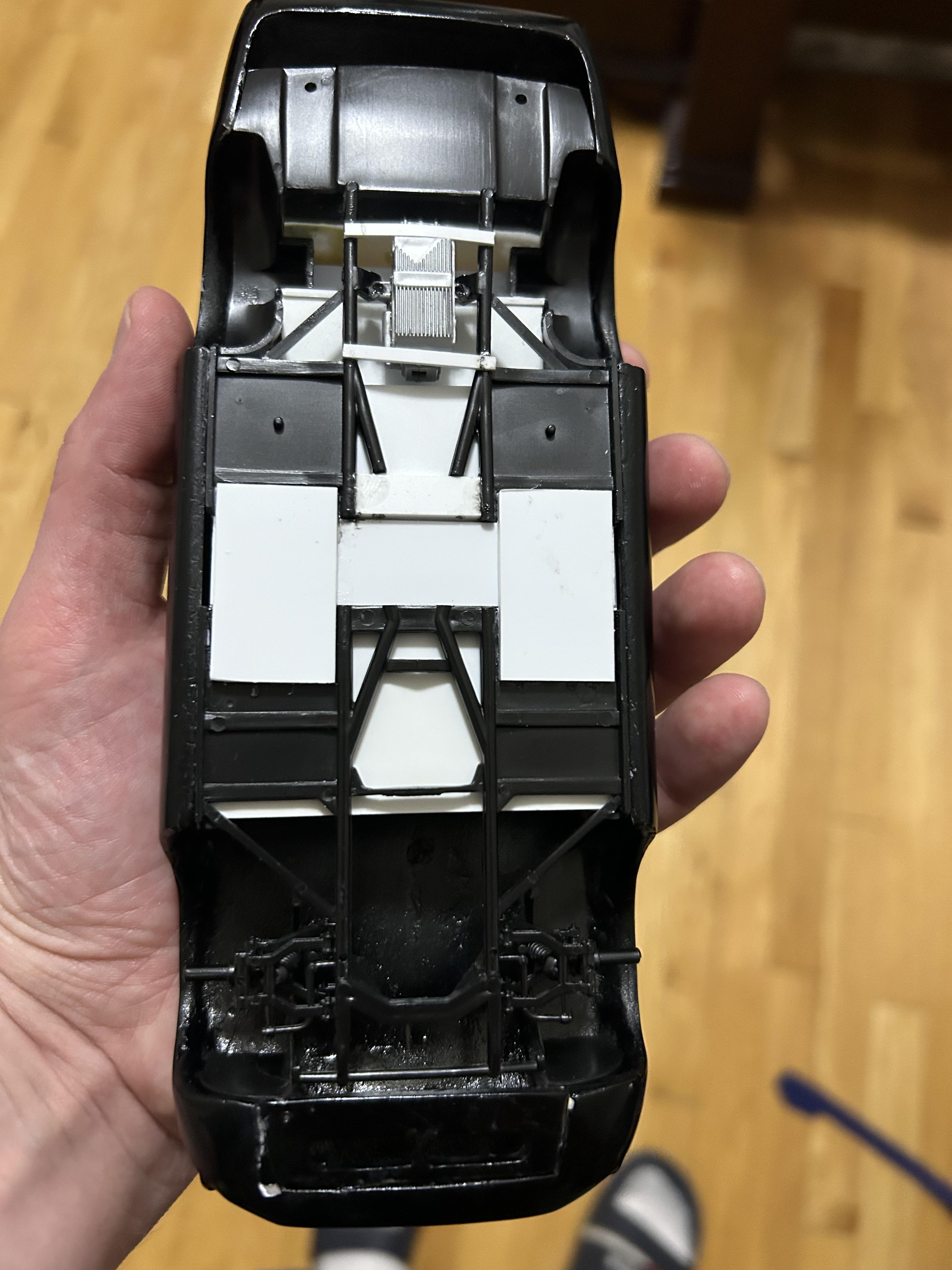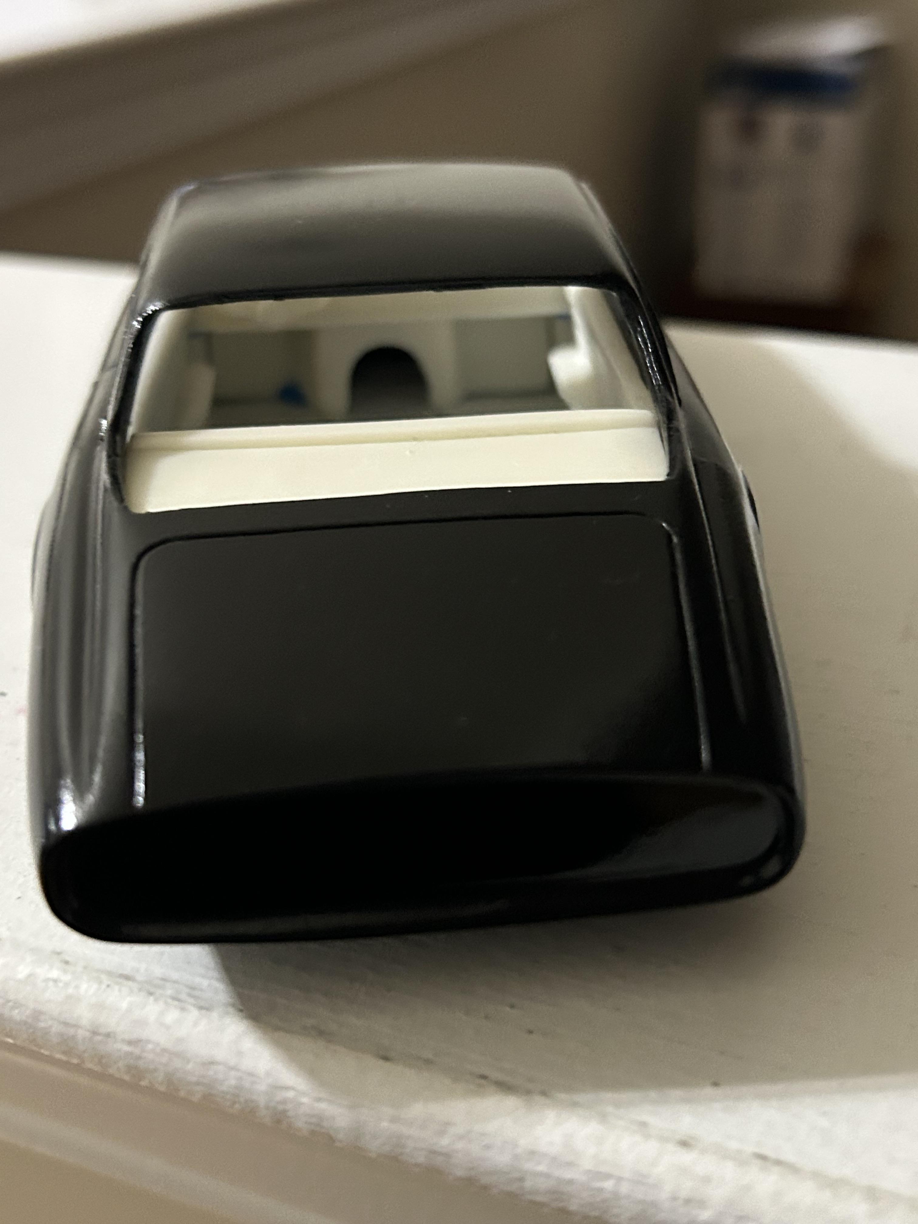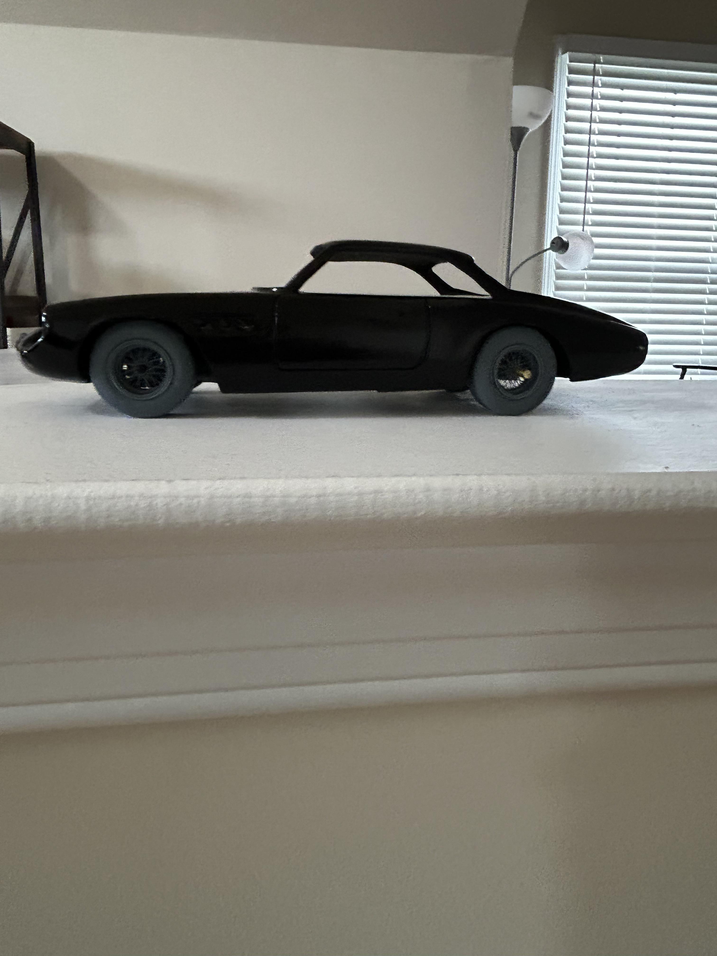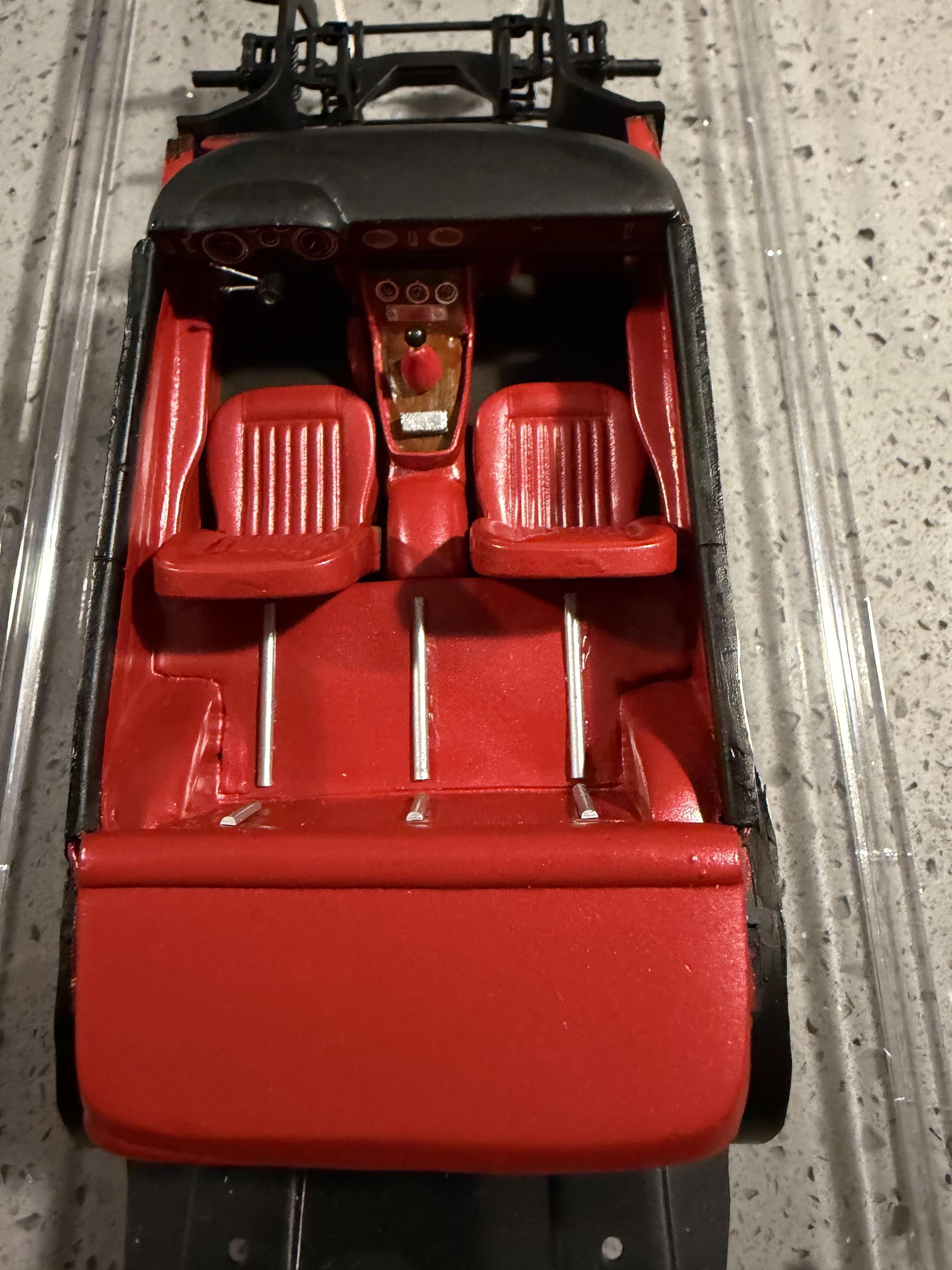 Air Trax kit that I’ve been working on over past few years. Was missing several parts including center console which I will try to make next. the chassis that came with my kit was not useable. I have chopped and stretched an italeri Ferrari Daytona chassis as a replacement. today boxed in the the rear parcel shelf, made new fender area and parcel shelf with polystyrene and apoxie sculpt Will like change color to metallic brown to replicate Peter Sellers car
